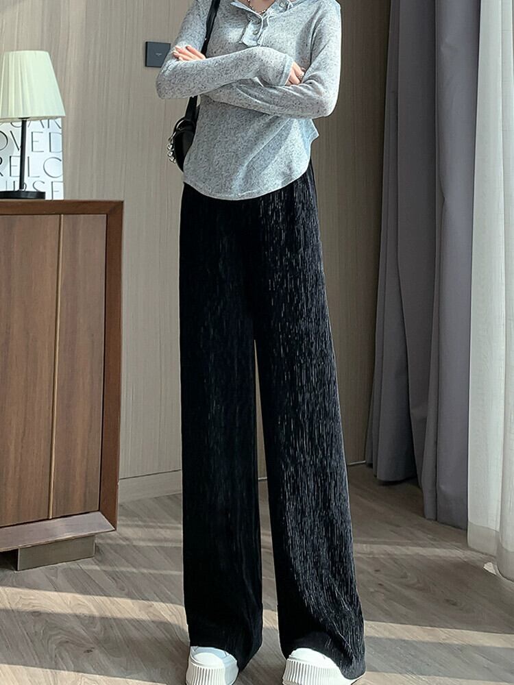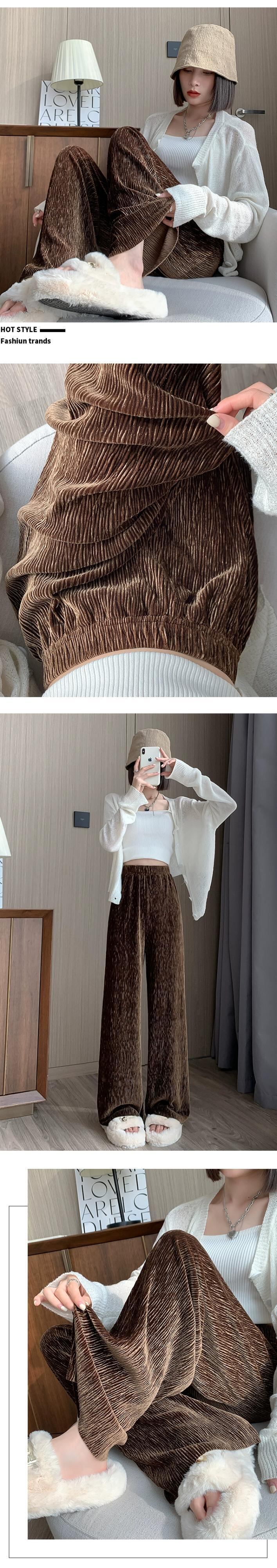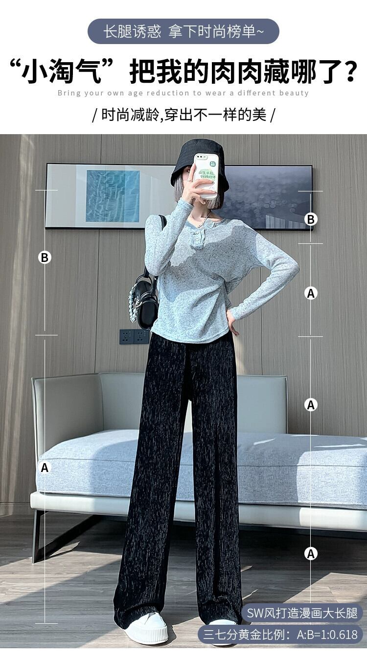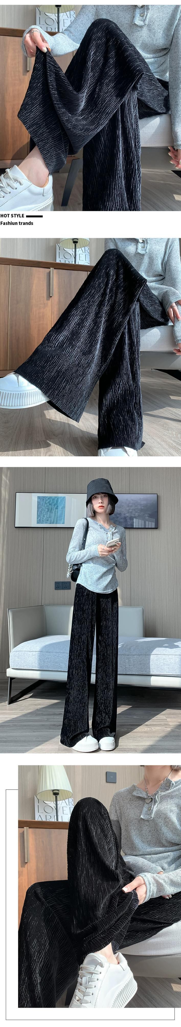 ブラックゴールドベルベットワイドレッグパンツレディース秋冬ハイウエストフロアレングスパンツ、ルーズ、スリム、万能ストレートレッグカジュアルパンツ オータム 秋物 ウィンター 冬物 7460083993729727 | framboise21