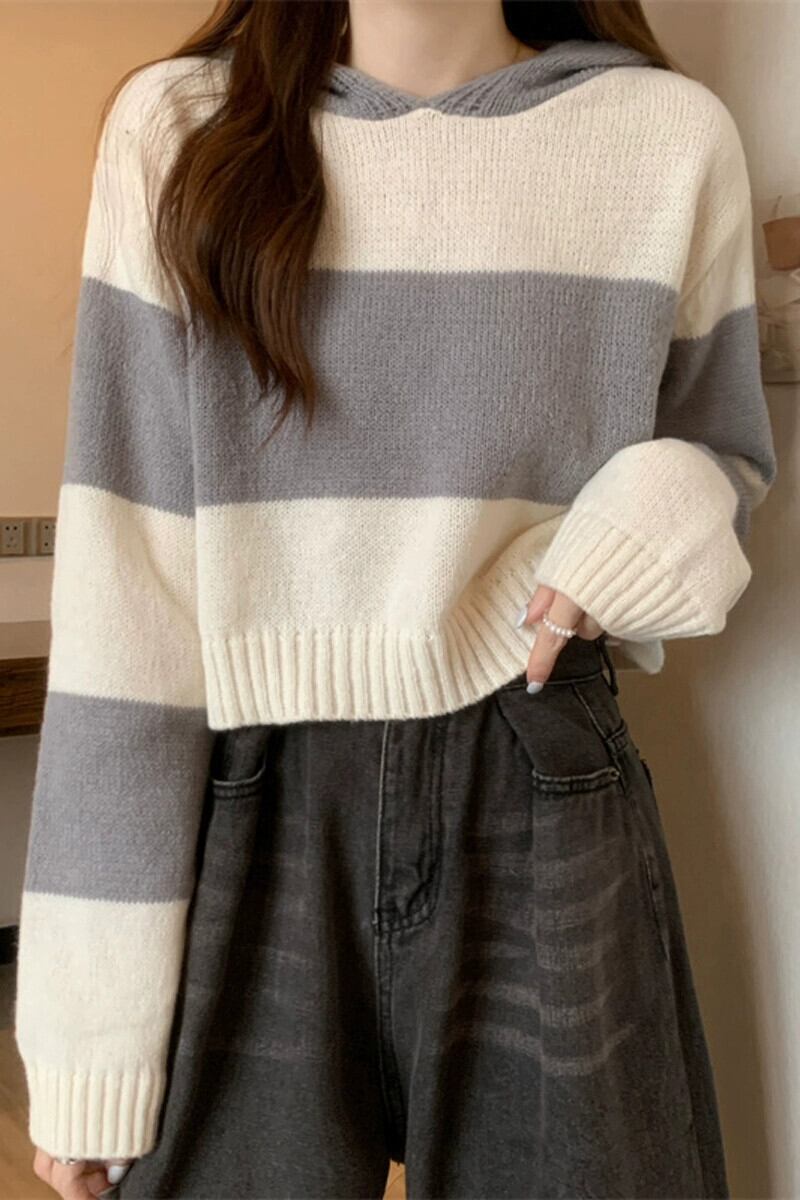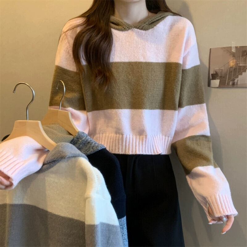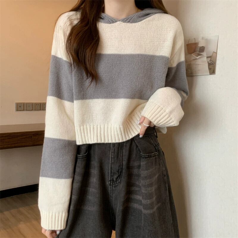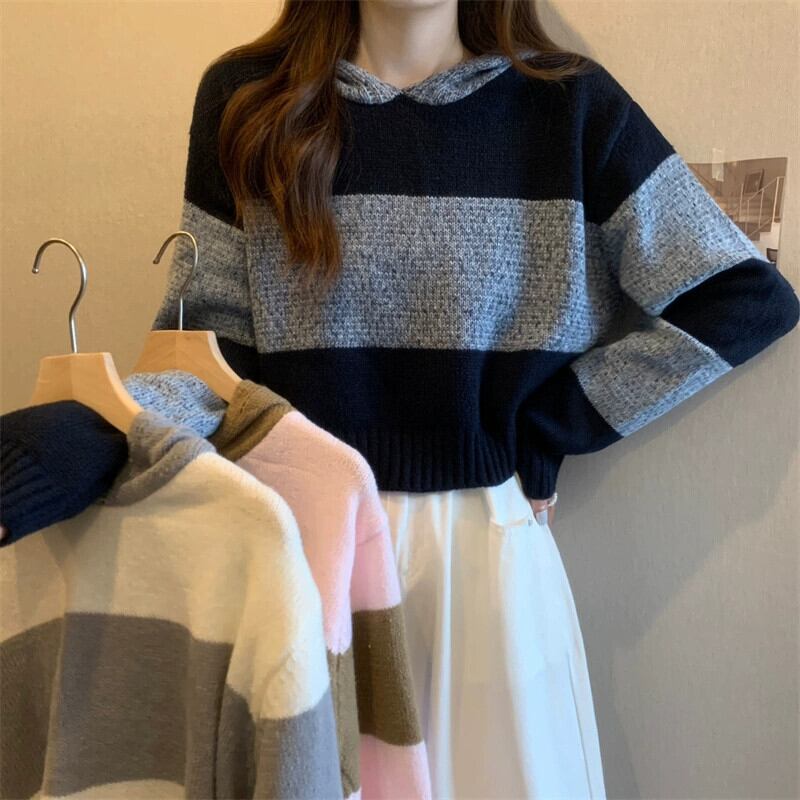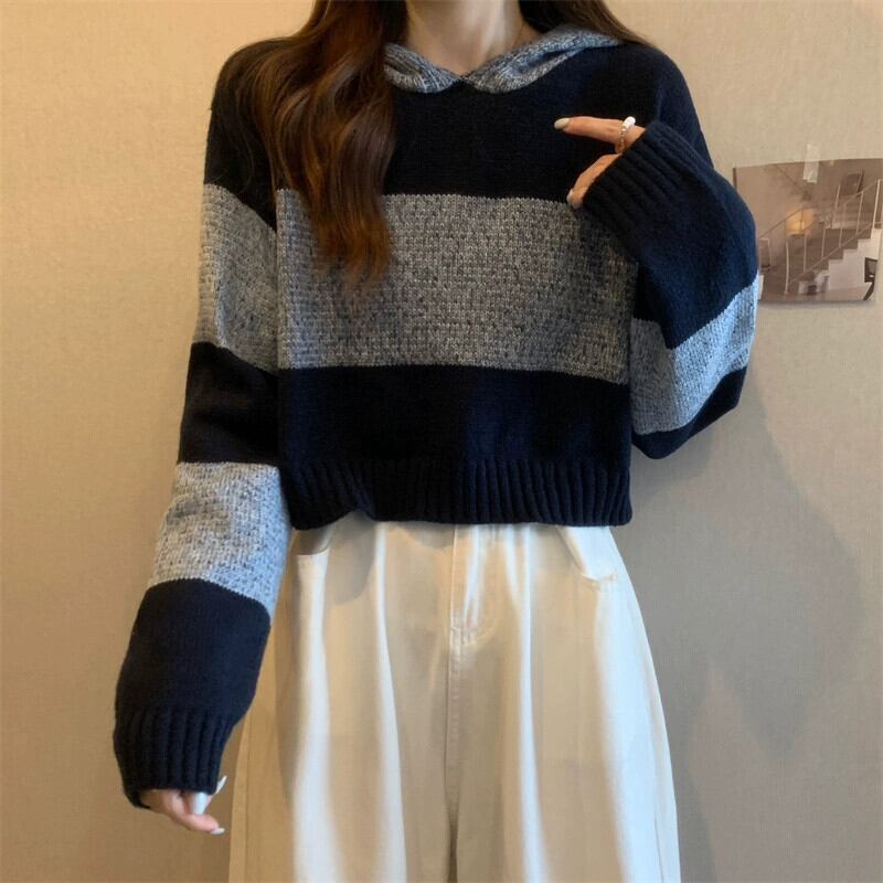 ストライプショートフード付きセーター女性秋と冬のフレンチデザインルーズでスリムなアウターウェア怠惰なスタイルの長袖セーター ロング オータム 秋物 ウィンター 冬物 7460049187608730 | framboise21