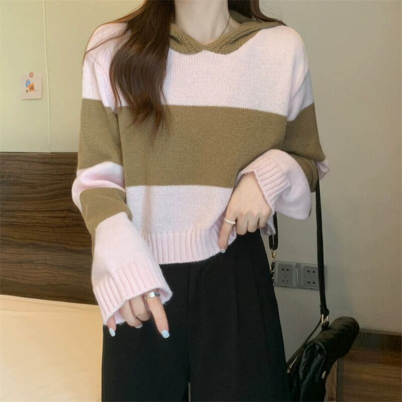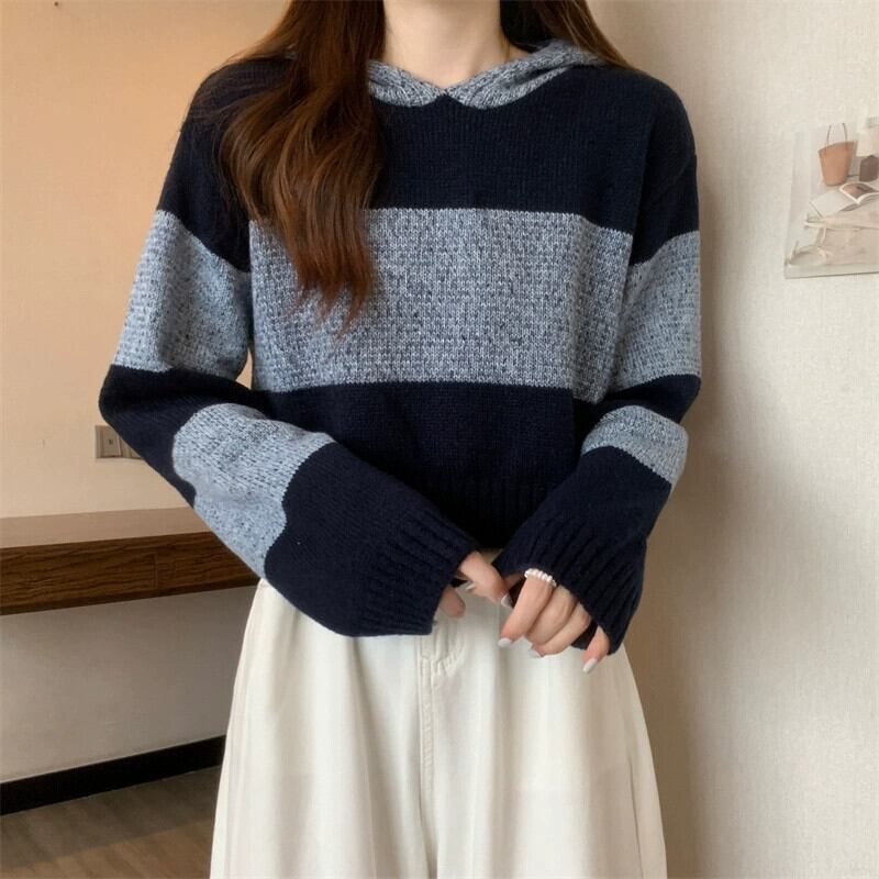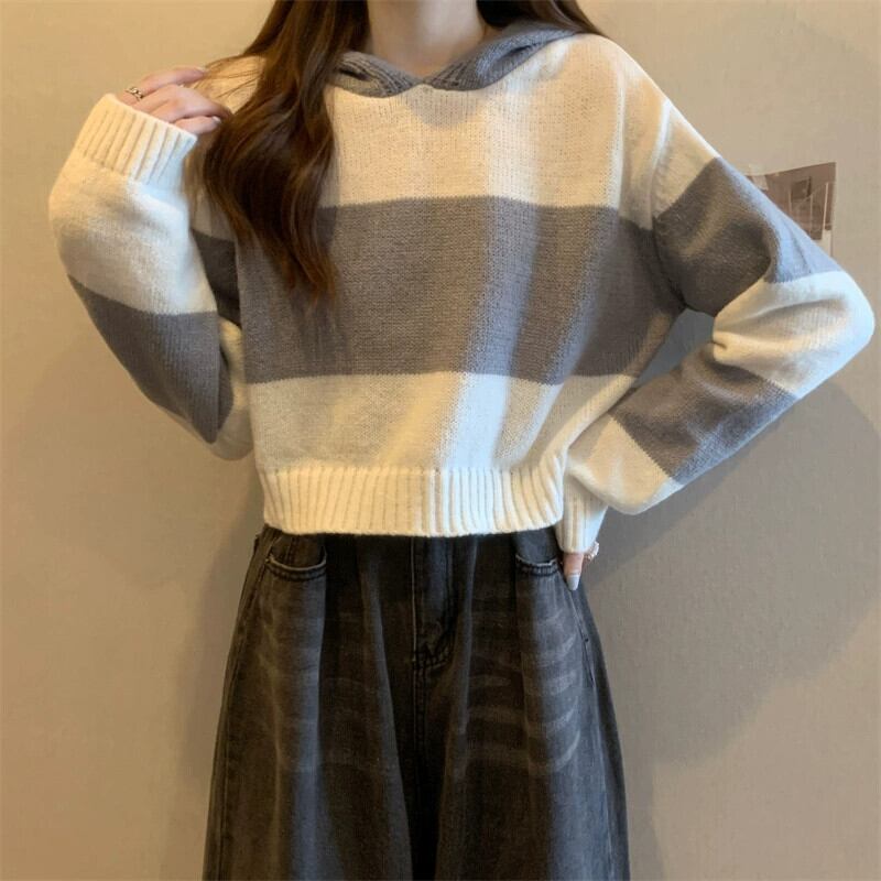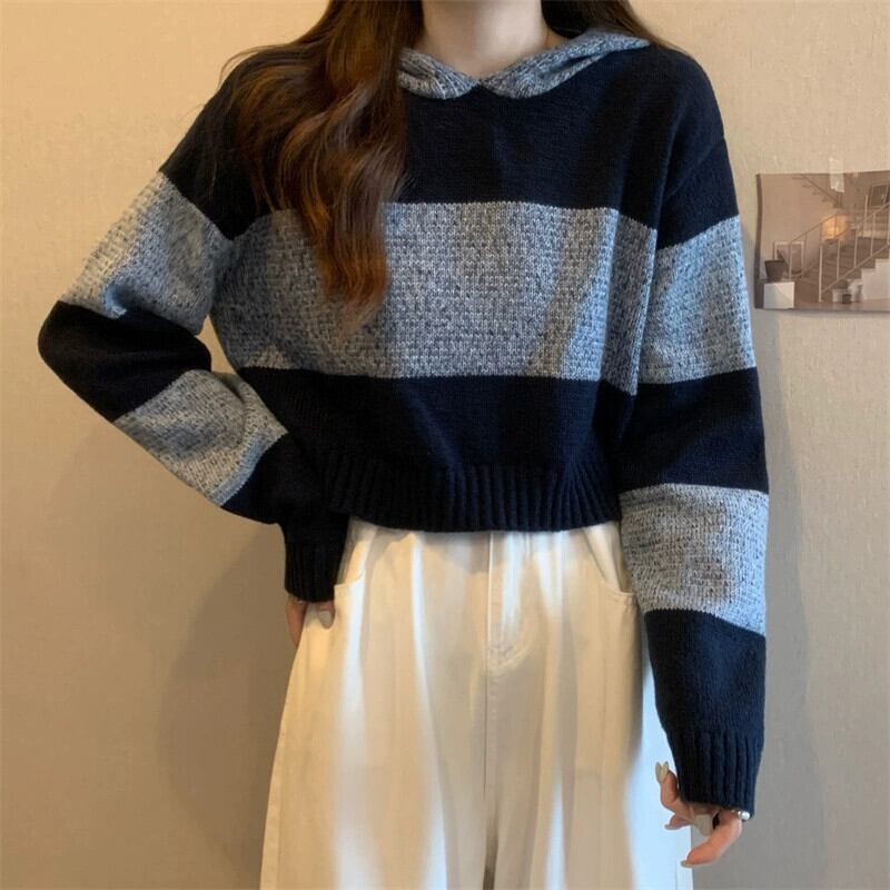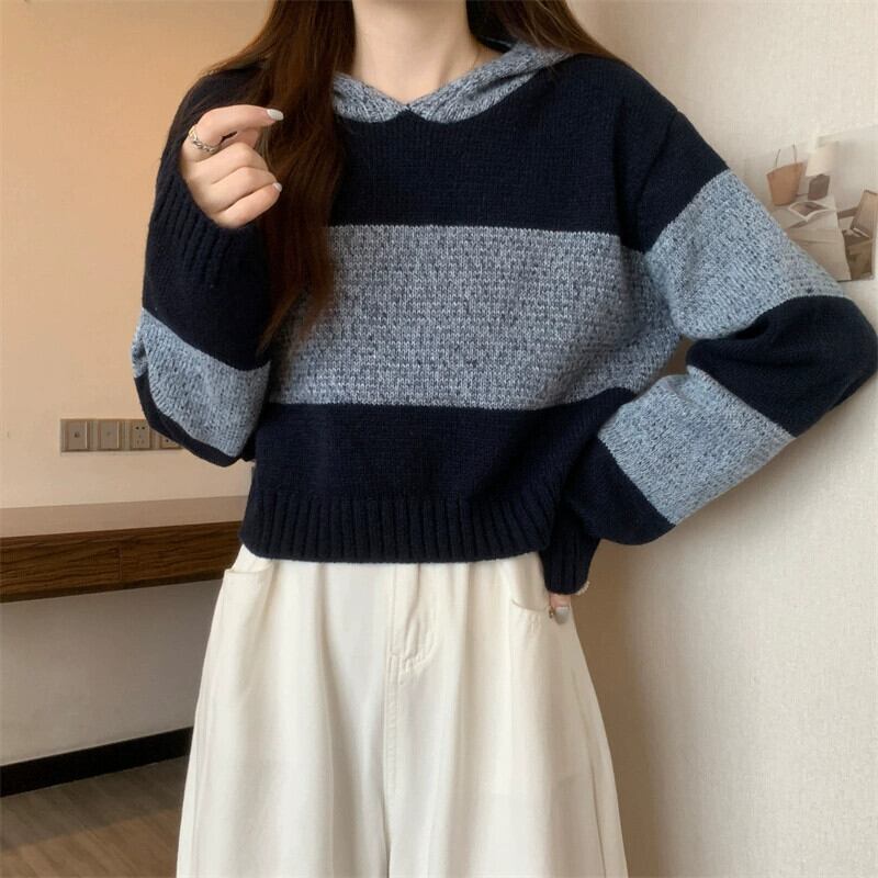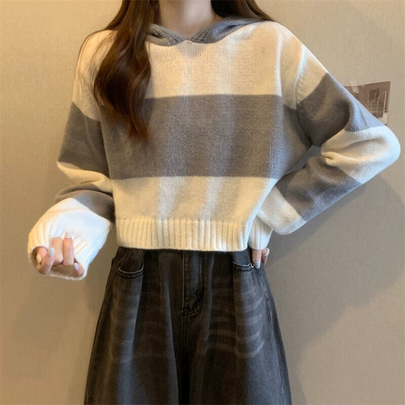 ストライプショートフード付きセーター女性秋と冬のフレンチデザインルーズでスリムなアウターウェア怠惰なスタイルの長袖セーター ロング オータム 秋物 ウィンター 冬物 7460049187608730 | framboise21
