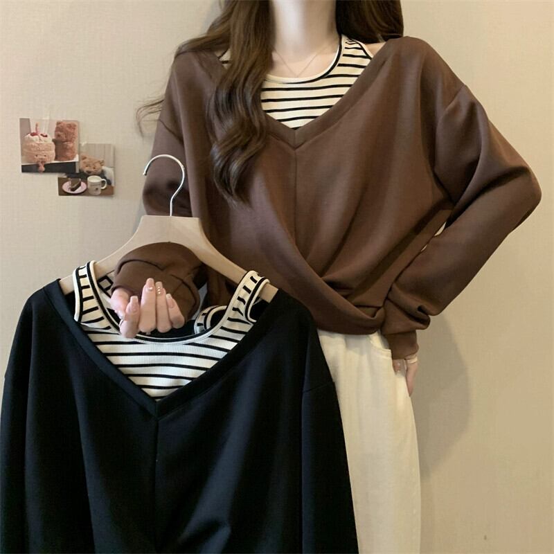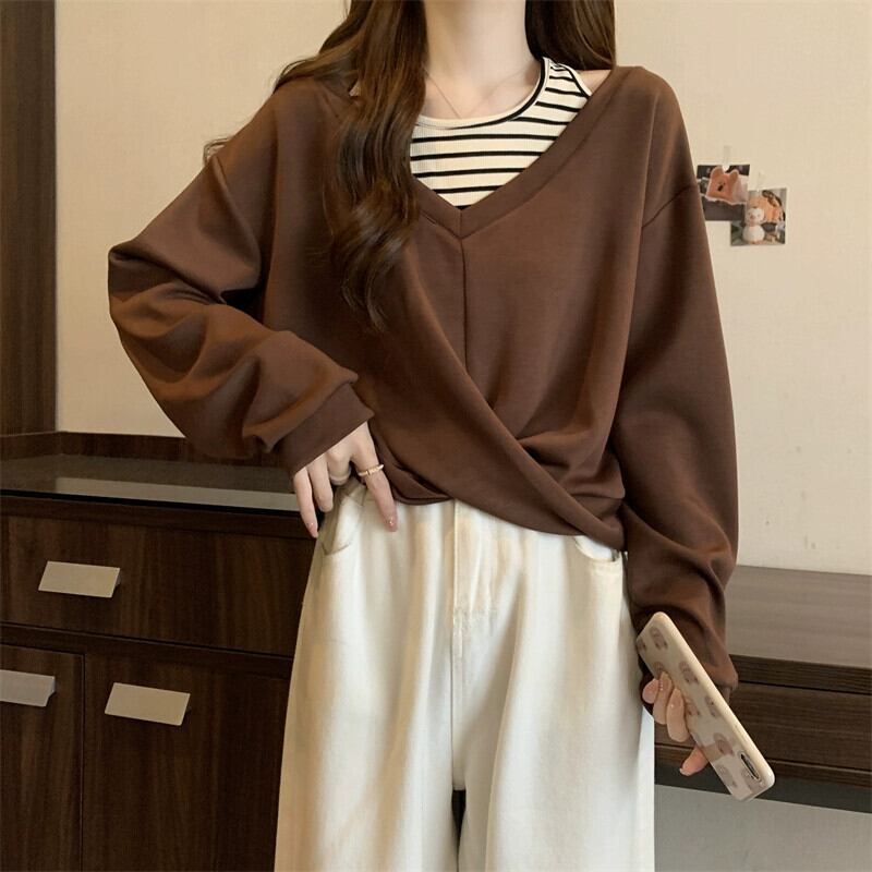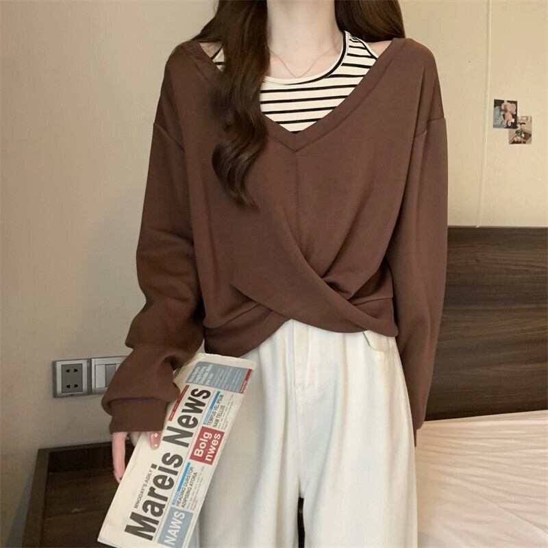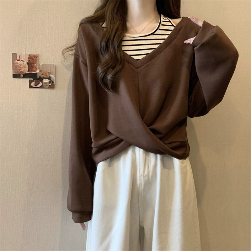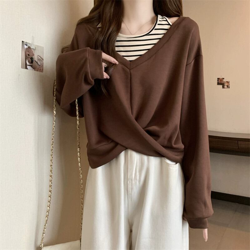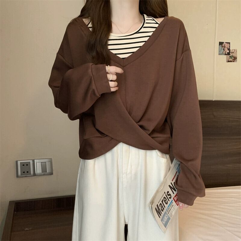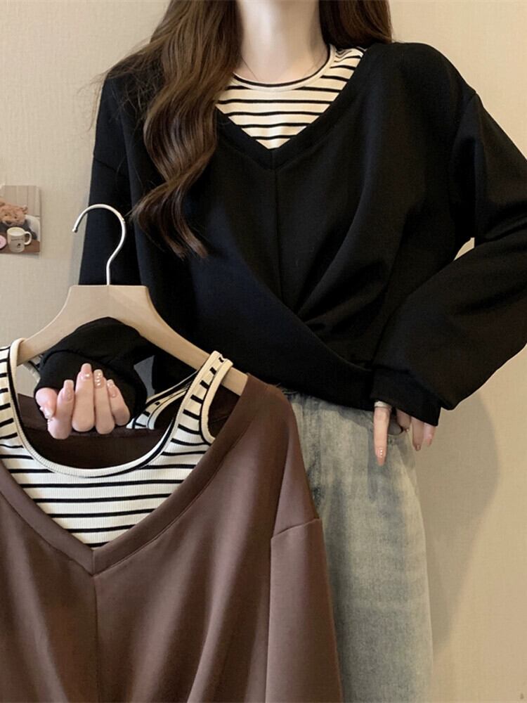 エドフェイクツーピーススウェットシャツ女性 2023 秋と冬の新しいルーズ痩身不規則な裾ショート長袖トップ ロング オータム 秋物 ウィンター 冬物 7460070148664294 | framboise21