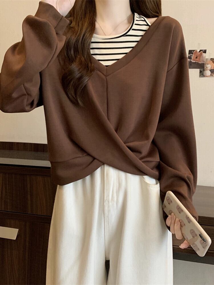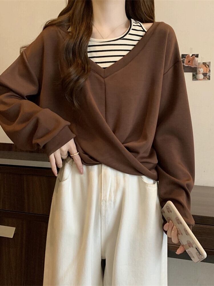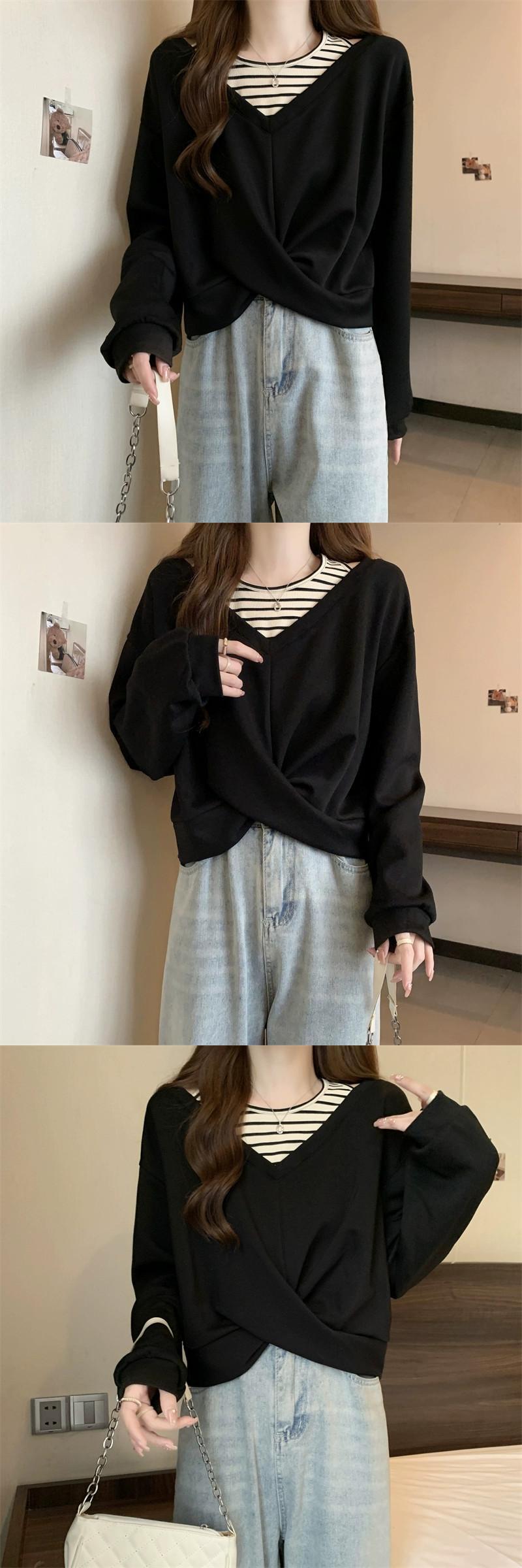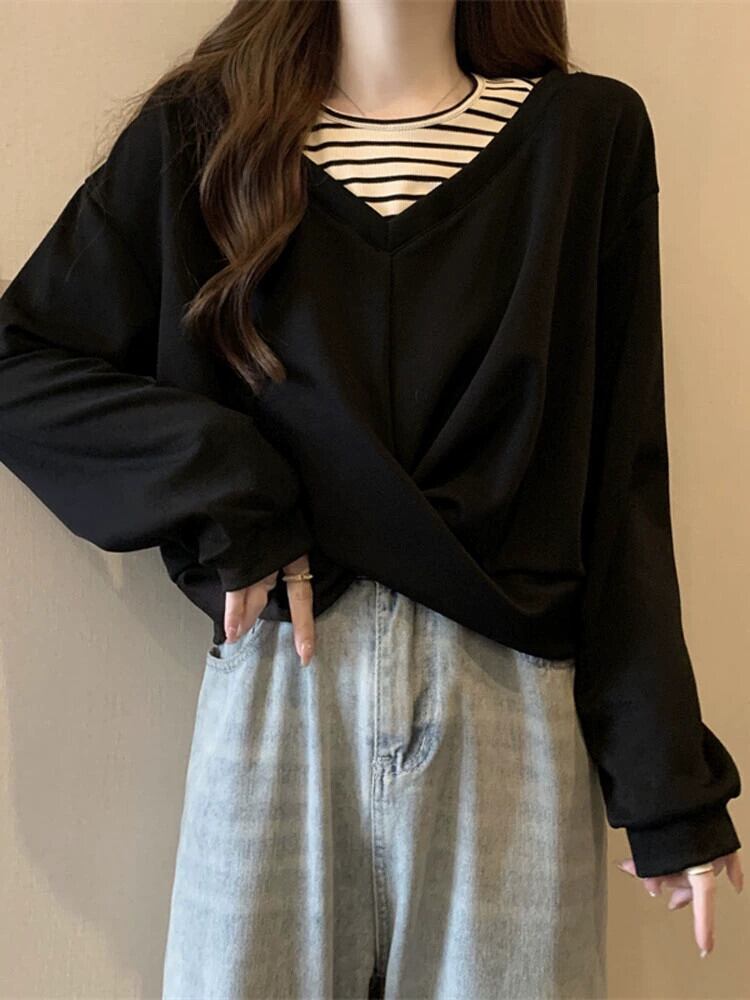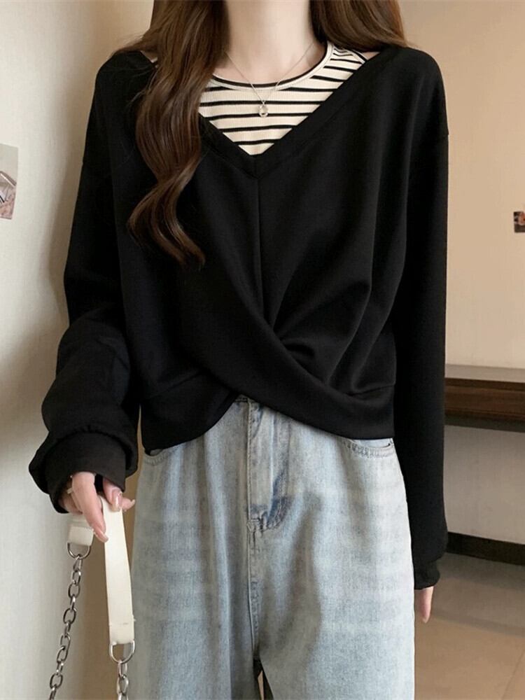 エドフェイクツーピーススウェットシャツ女性 2023 秋と冬の新しいルーズ痩身不規則な裾ショート長袖トップ ロング オータム 秋物 ウィンター 冬物 7460070148664294 | framboise21