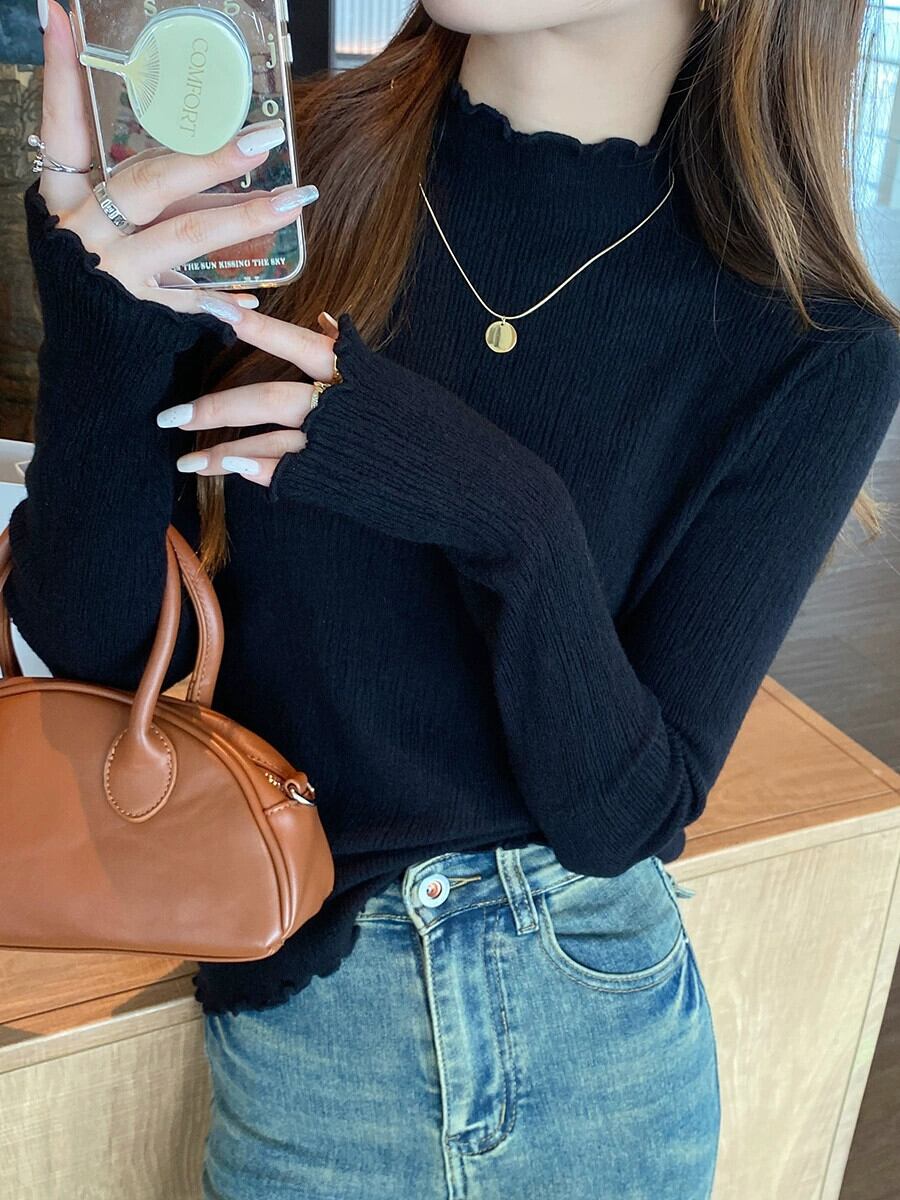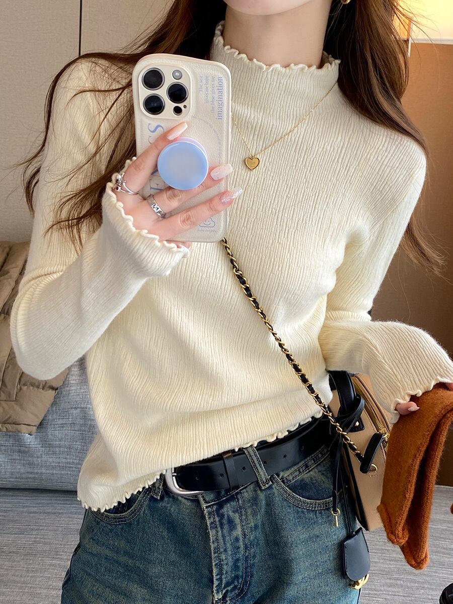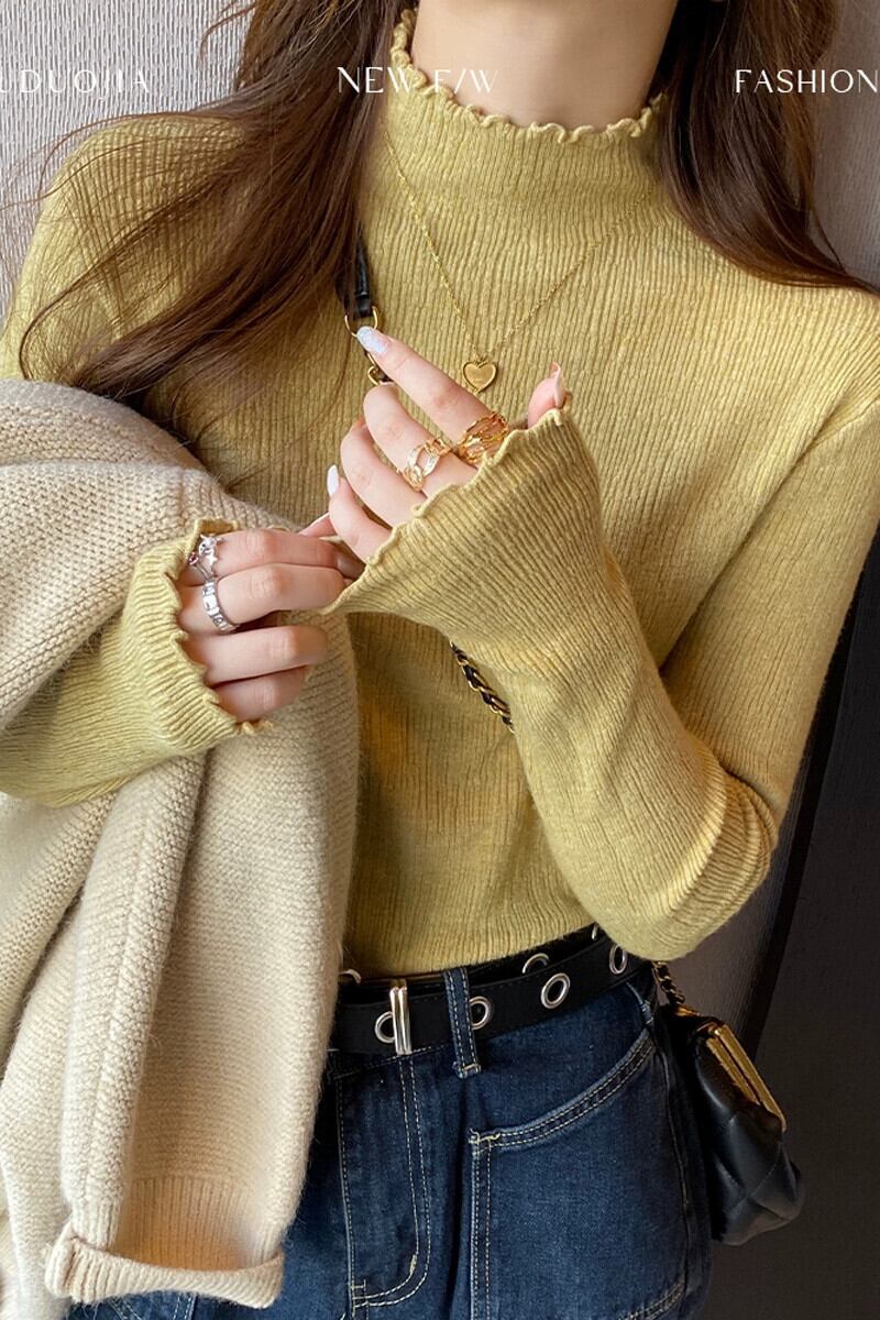秋冬のハーフタートルカラーボトムシャツレディース、イヤリング付き洋風インナーウェア、スリムフィットで多用途な黄色のセーター オータム 秋物 ウィンター 冬物 指輪 7460043109020305 | framboise21