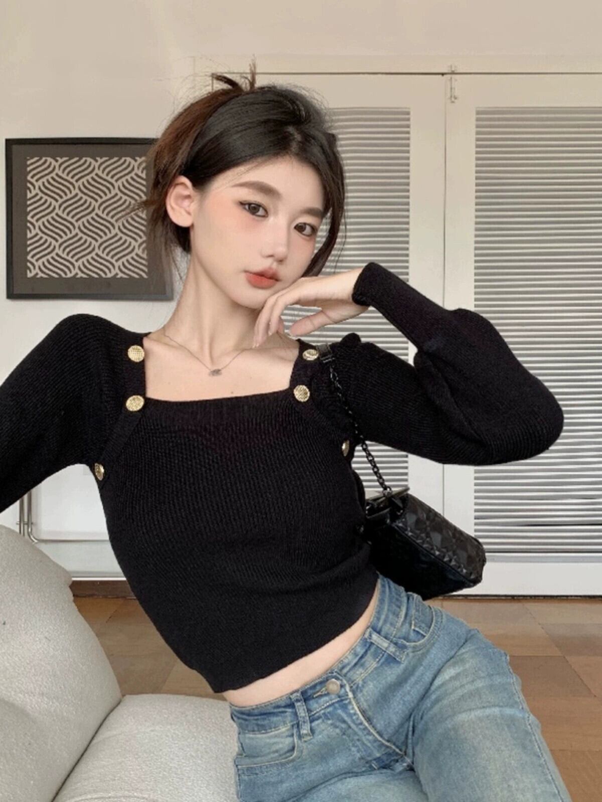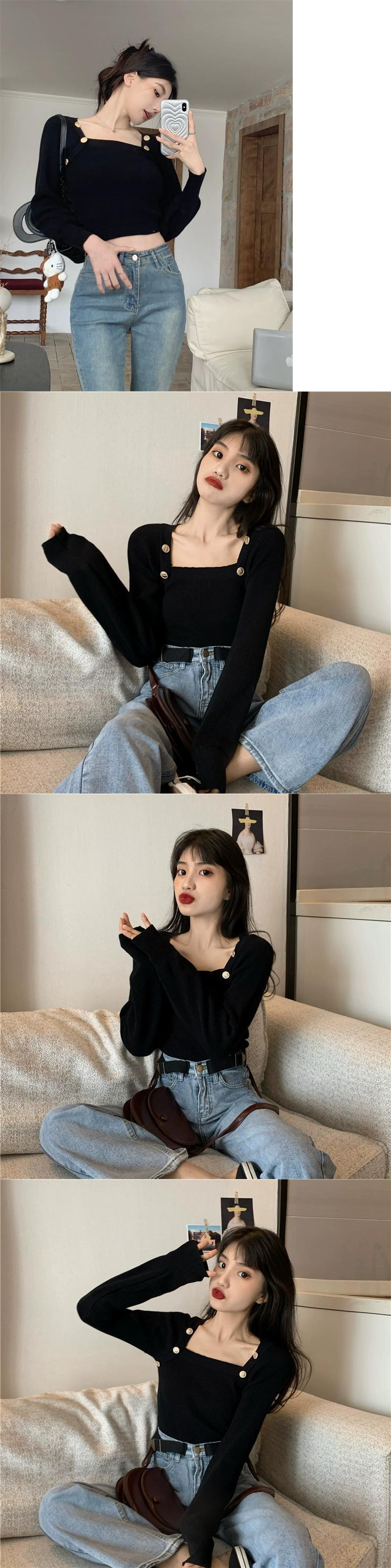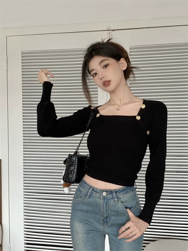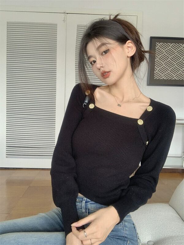 黒のスクエアネックボトリングシャツレディース、秋と冬のファッショナブルなデザイン、スリムで多用途な長袖ニットセーター ロング ブラック オータム 秋物 ウィンター 冬物 スクウェア 7460087337142580 | framboise21