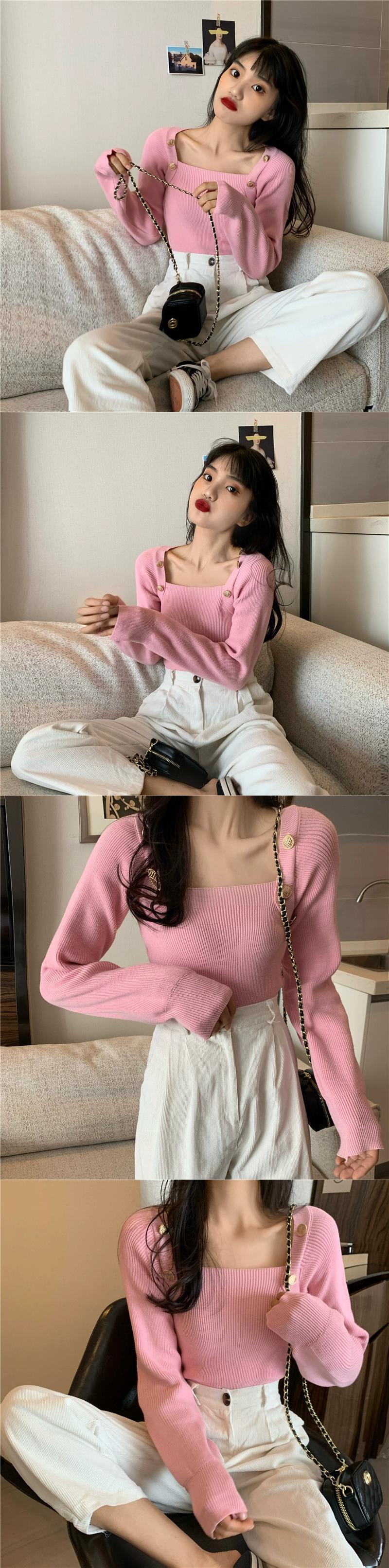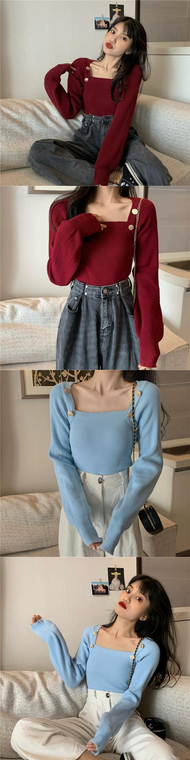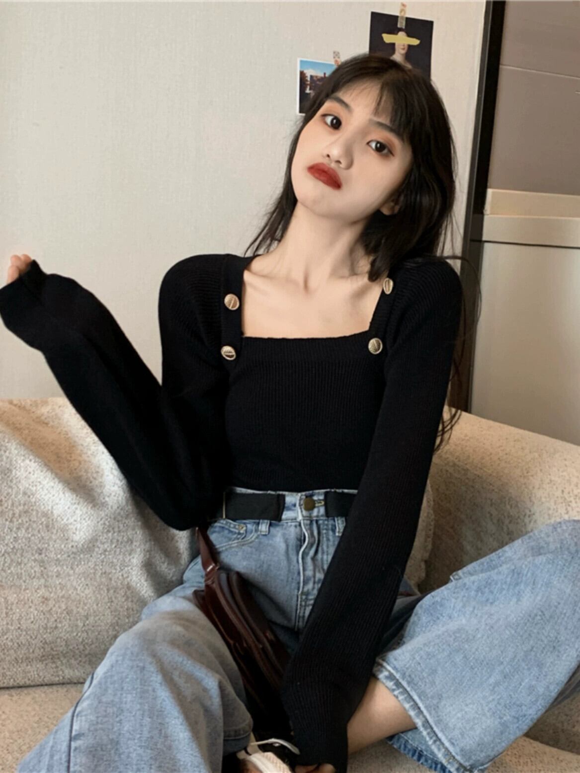黒のスクエアネックボトリングシャツレディース、秋と冬のファッショナブルなデザイン、スリムで多用途な長袖ニットセーター ロング ブラック オータム 秋物 ウィンター 冬物 スクウェア 7460087337142580 | framboise21