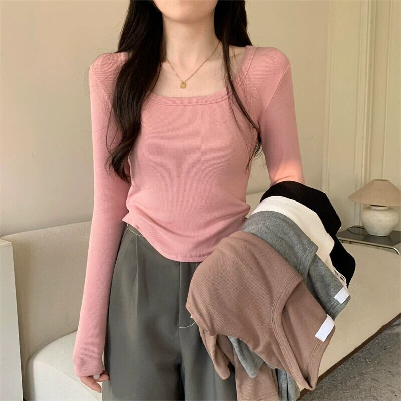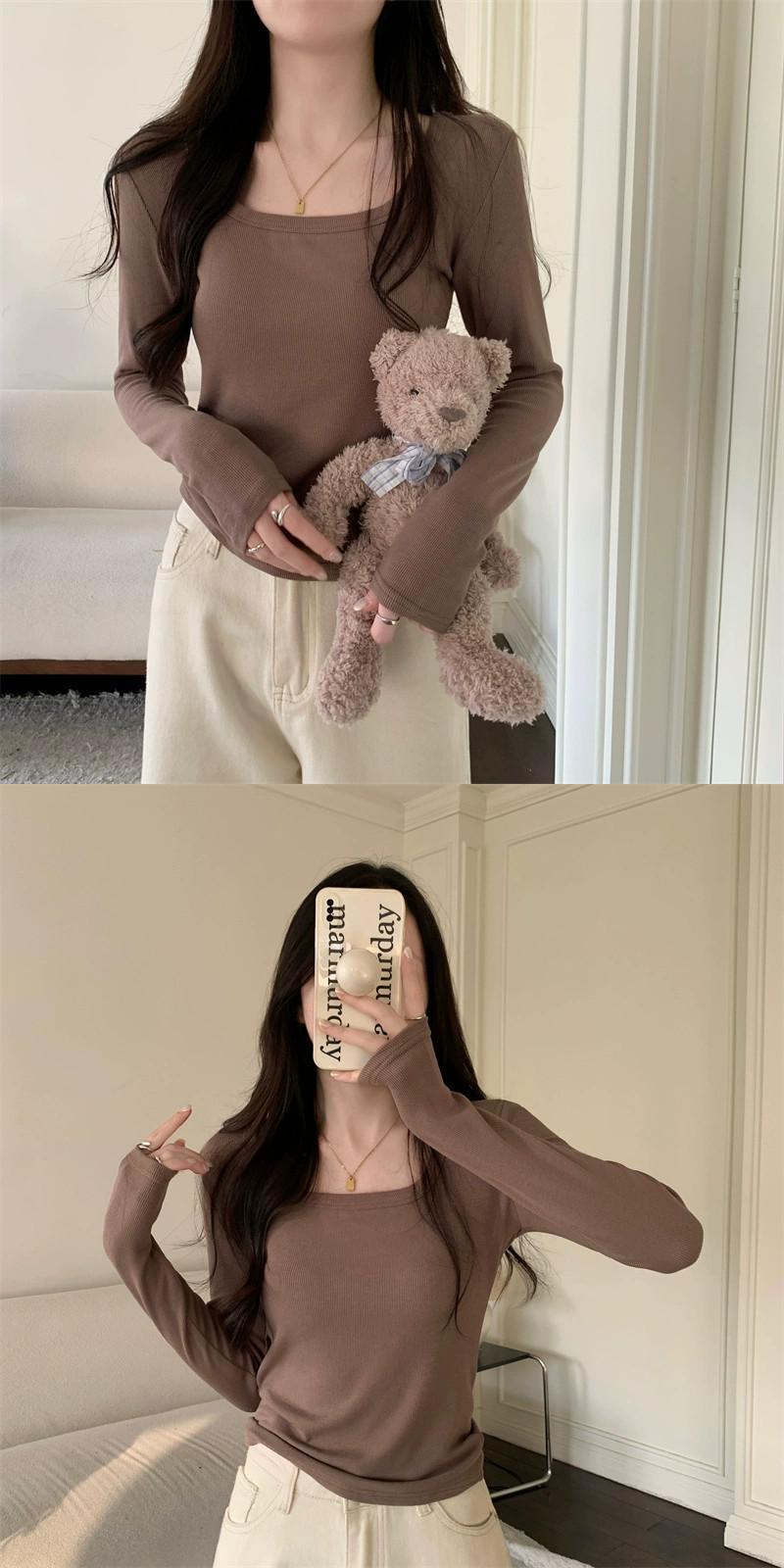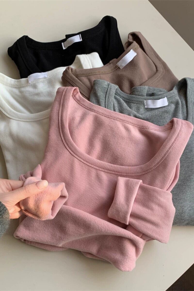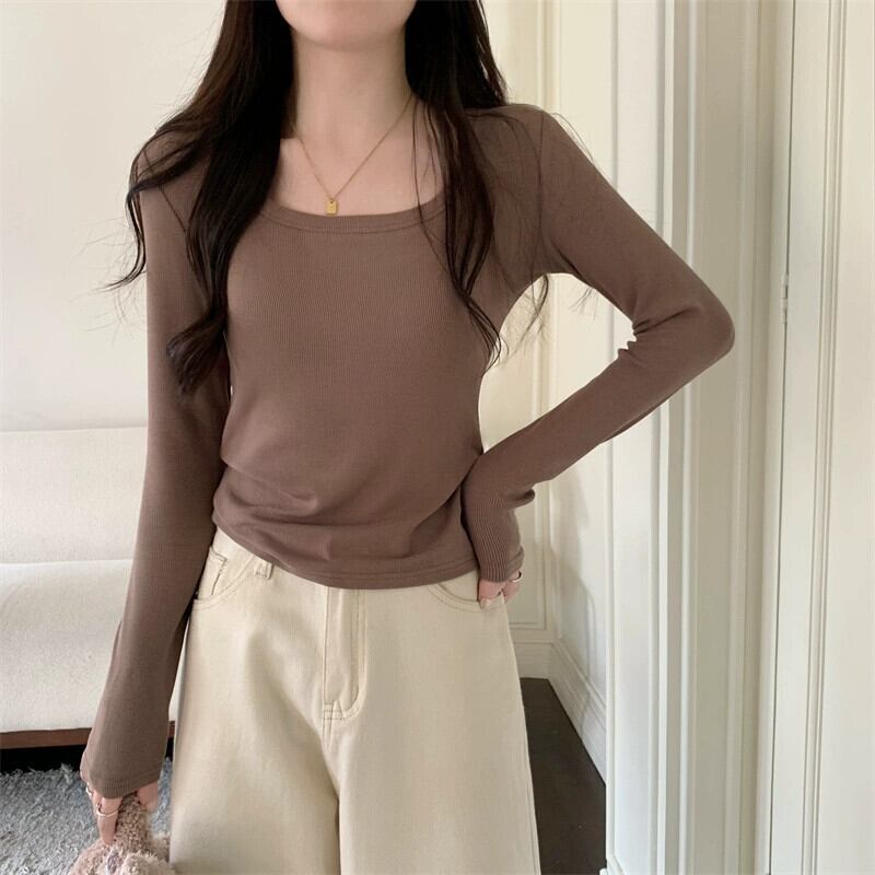 肥厚起毛暖かいベースシャツ 2023 新しい女性の秋冬インナーウェアスリムフィットショートスクエアネック長袖 Tシャツ ロング オータム 秋物 ウィンター 冬物 スクウェア 7460064181723111 | framboise21