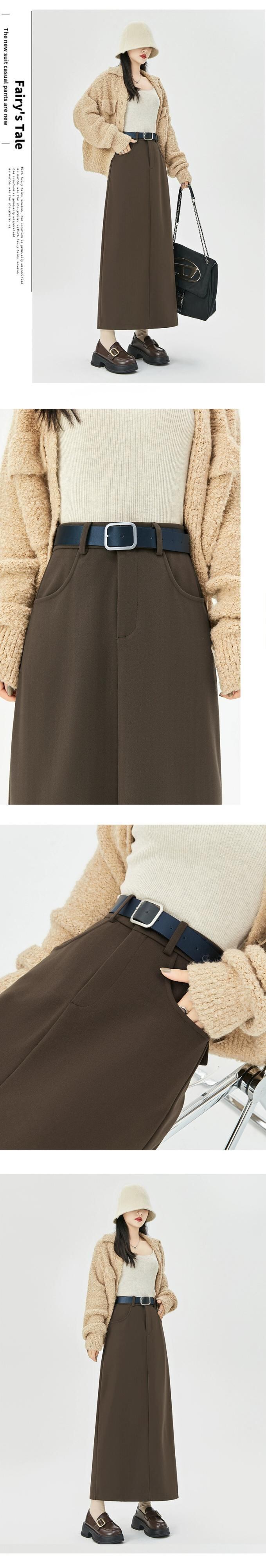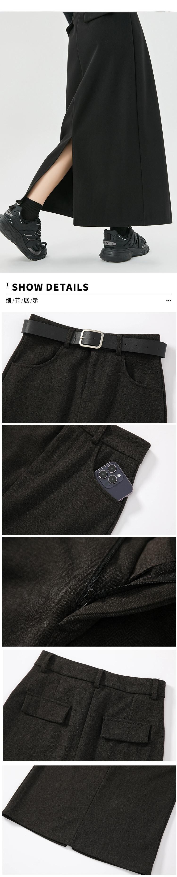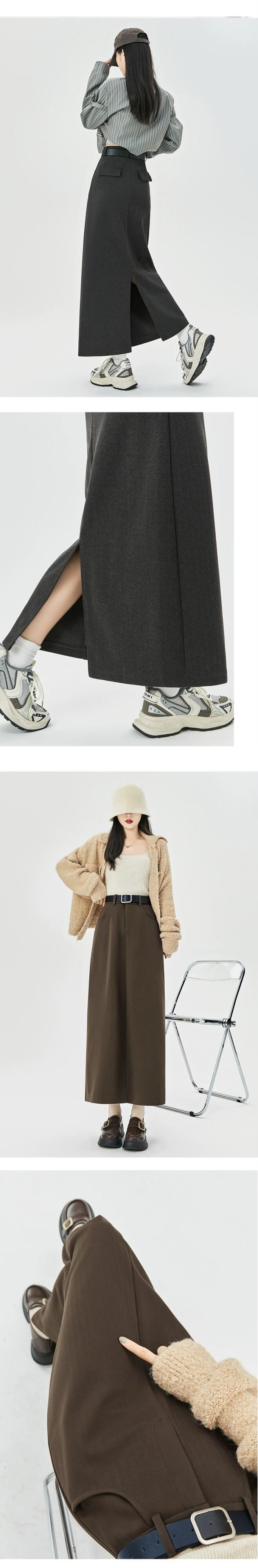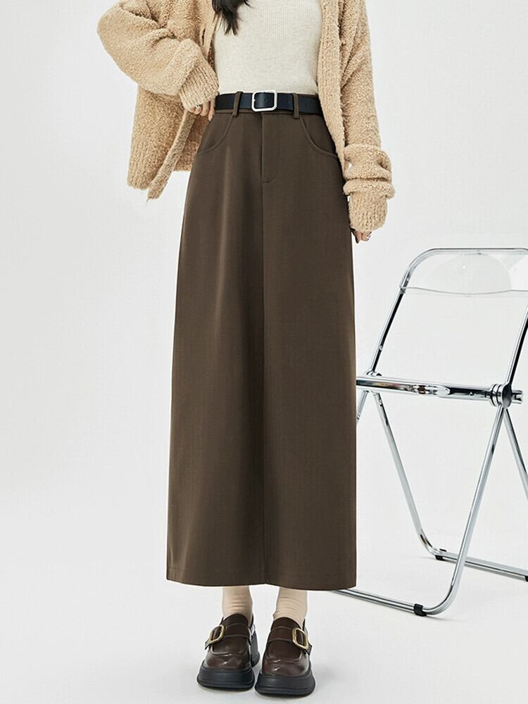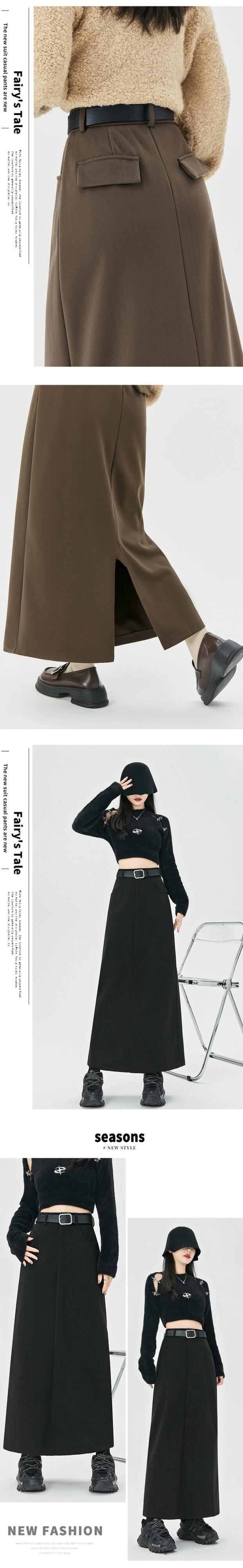 コーヒー色のウールのスカートの女性 2023 新しい秋冬レトロハイウエストドレープ痩身 A ラインスリットヒップカバーロングスカート レッド オータム 秋物 ウィンター 冬物 Aライン 7460027540573484 | framboise21