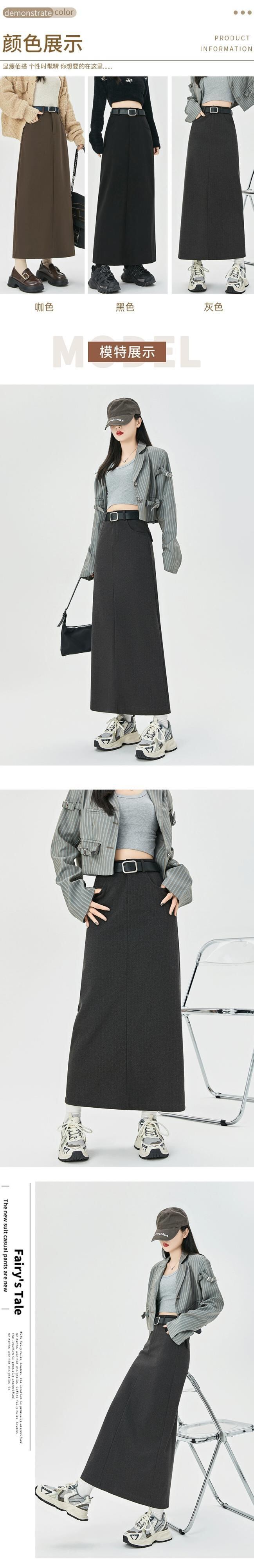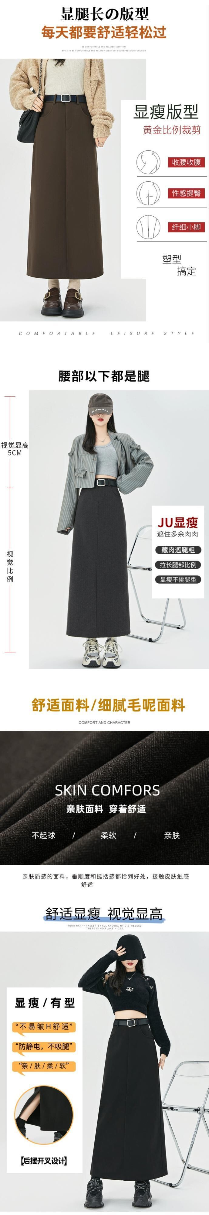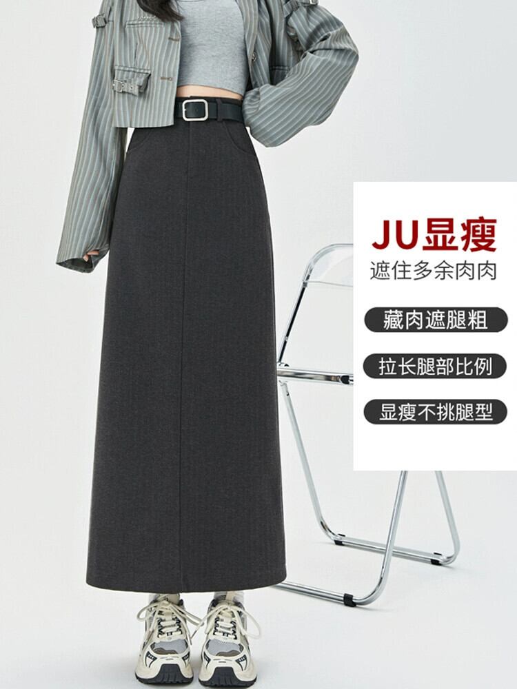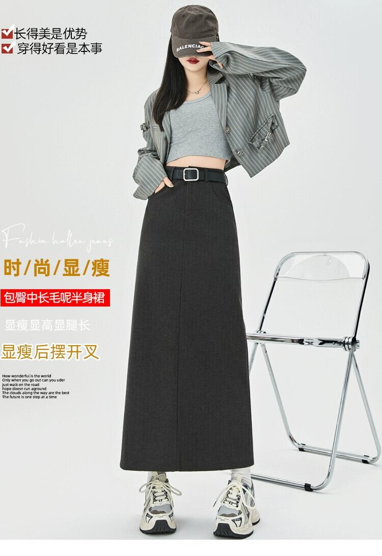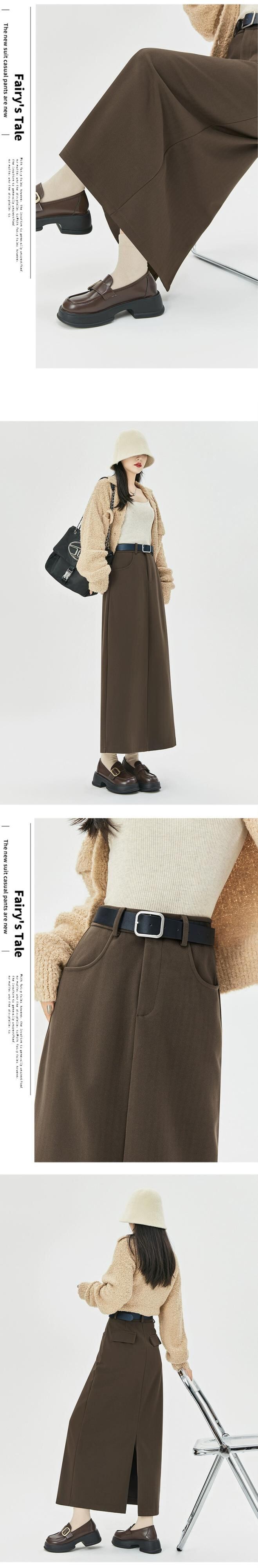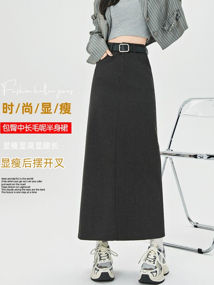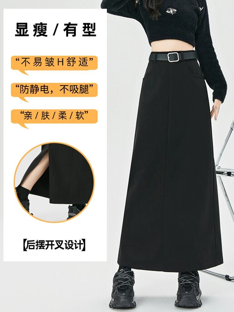 コーヒー色のウールのスカートの女性 2023 新しい秋冬レトロハイウエストドレープ痩身 A ラインスリットヒップカバーロングスカート レッド オータム 秋物 ウィンター 冬物 Aライン 7460027540573484 | framboise21