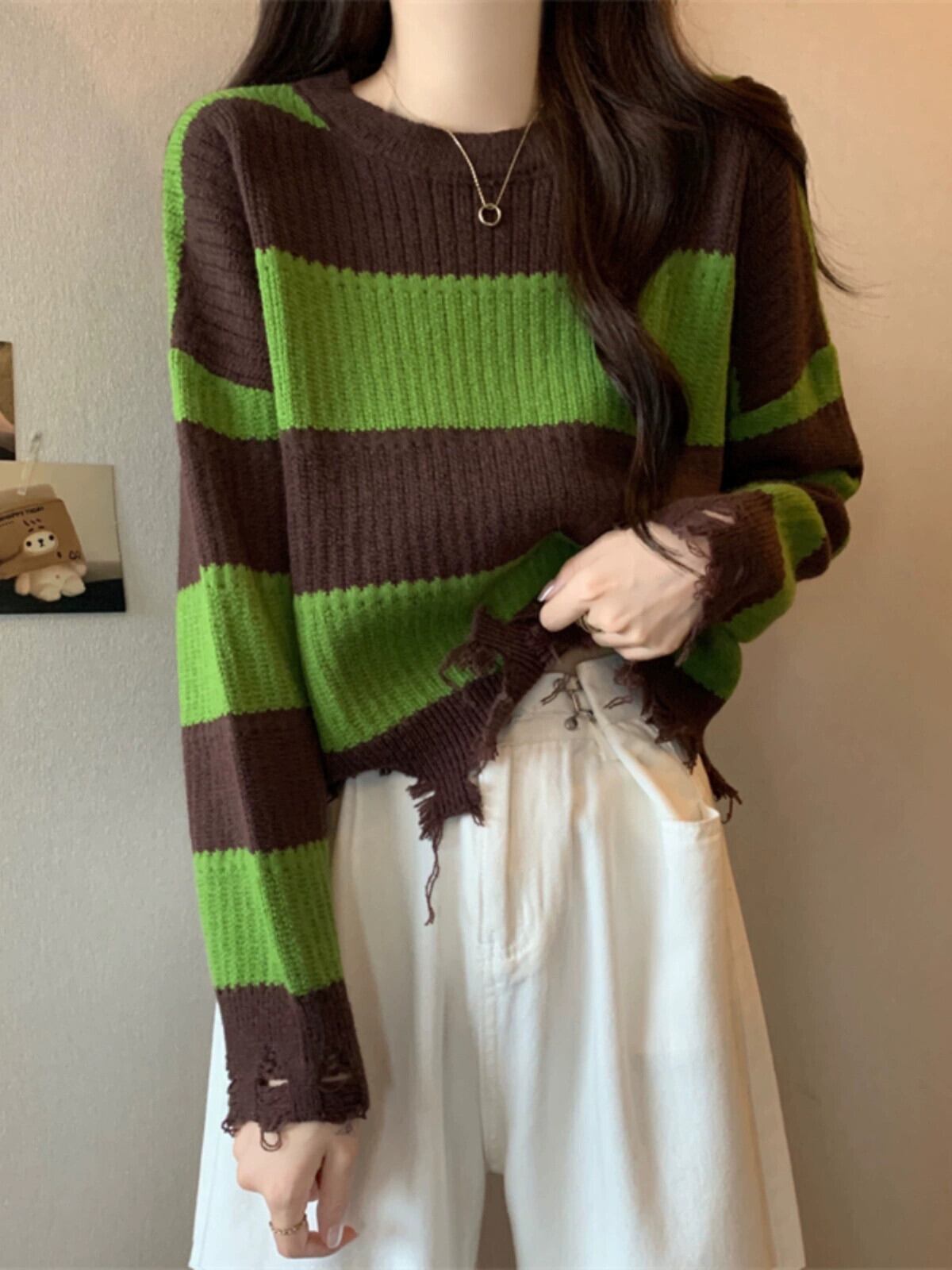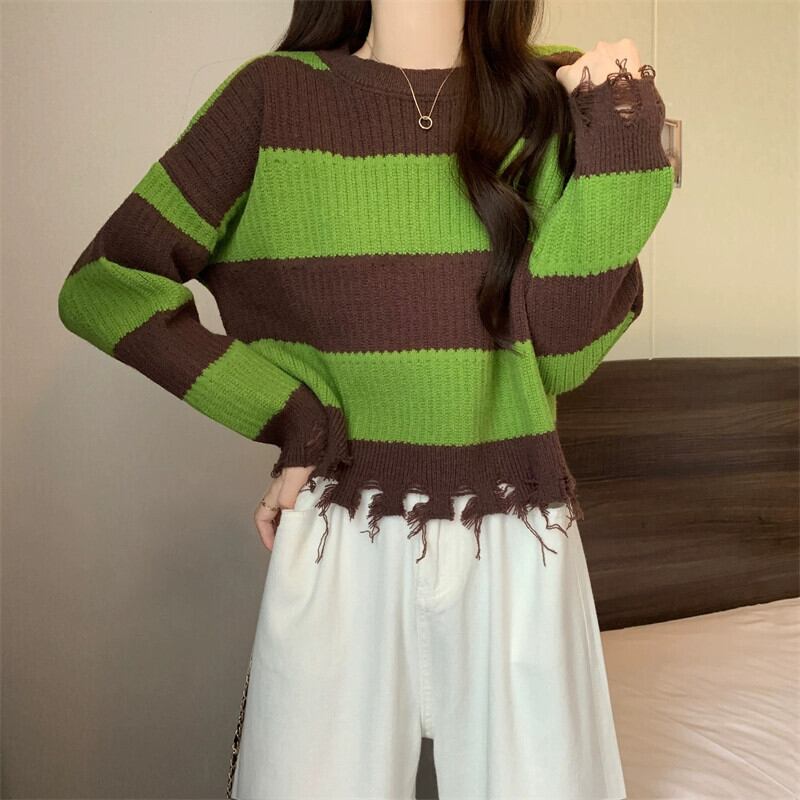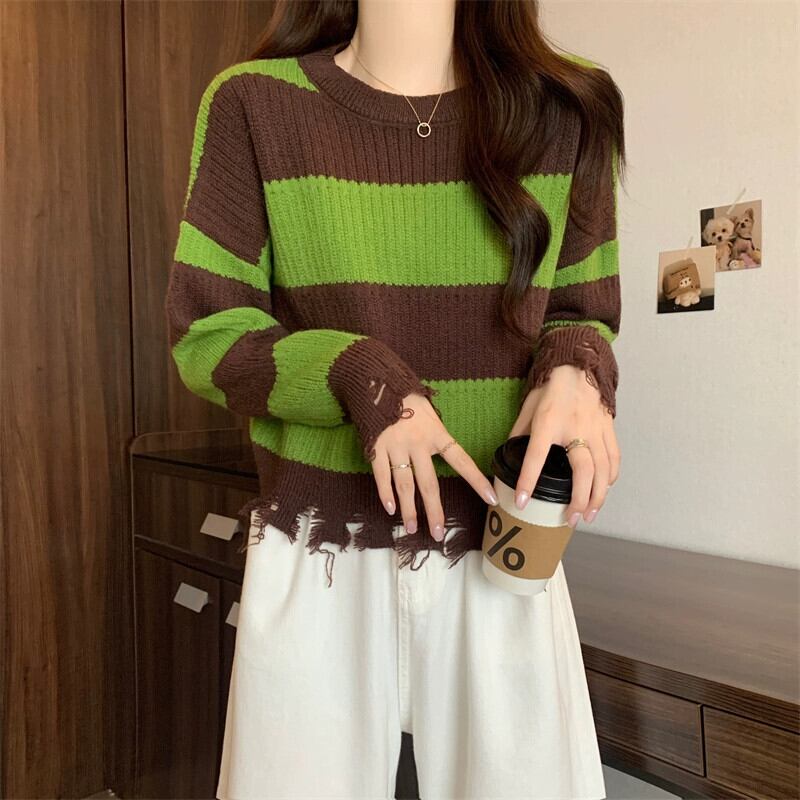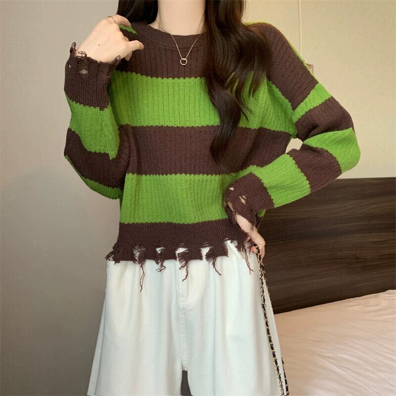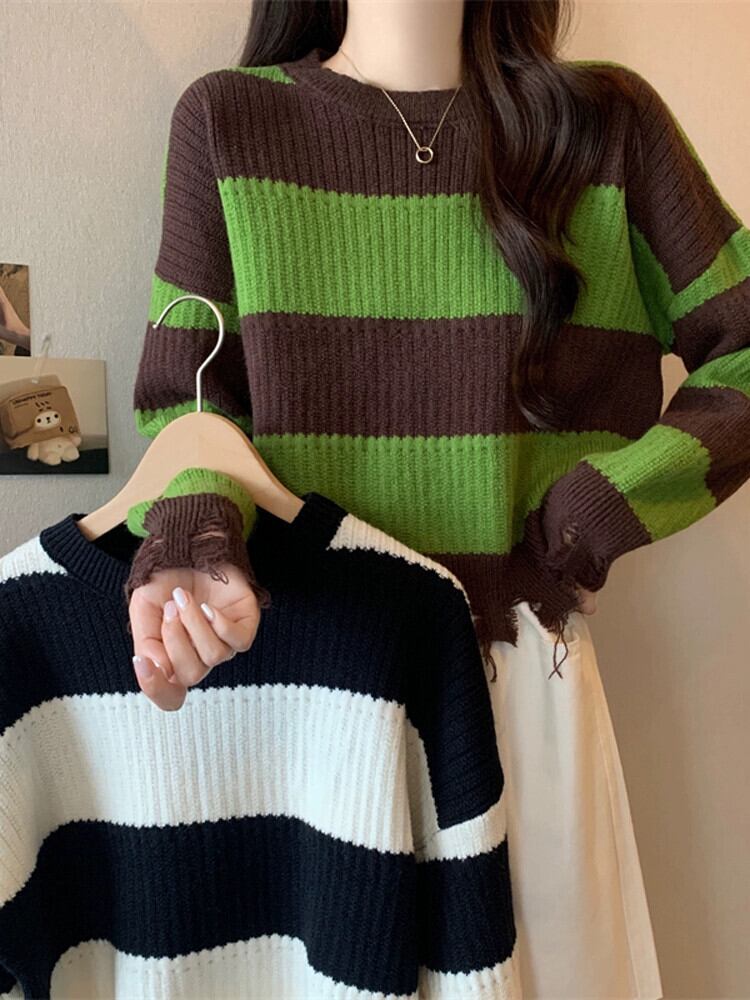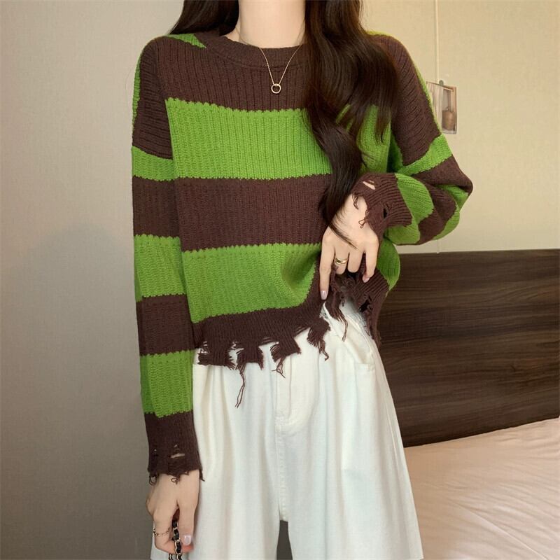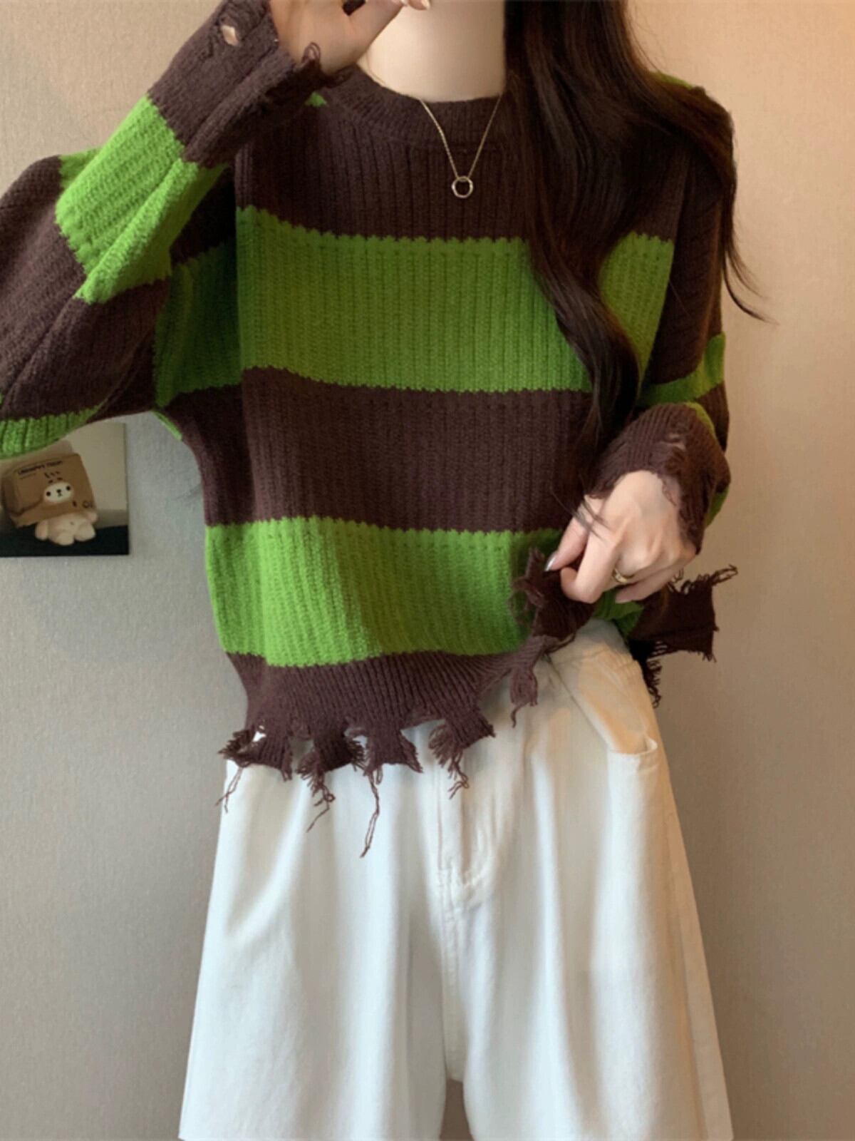 緑のストライプの短い破れたセーターの女性、秋と冬のレトロなデザイン、ゆったりとしたアウターウェア、怠惰なスタイルのプルオーバーセーター ショート オータム 秋物 ウィンター 冬物 グリーン 7460072541238237 | framboise21