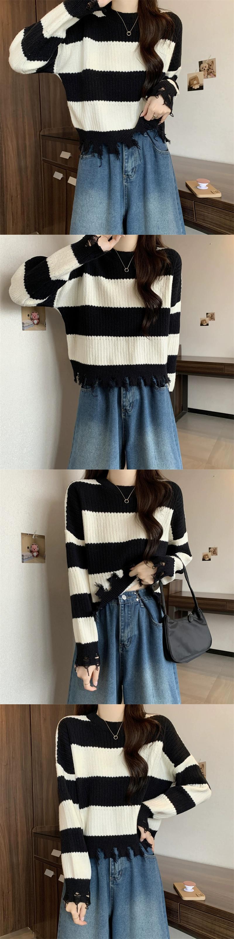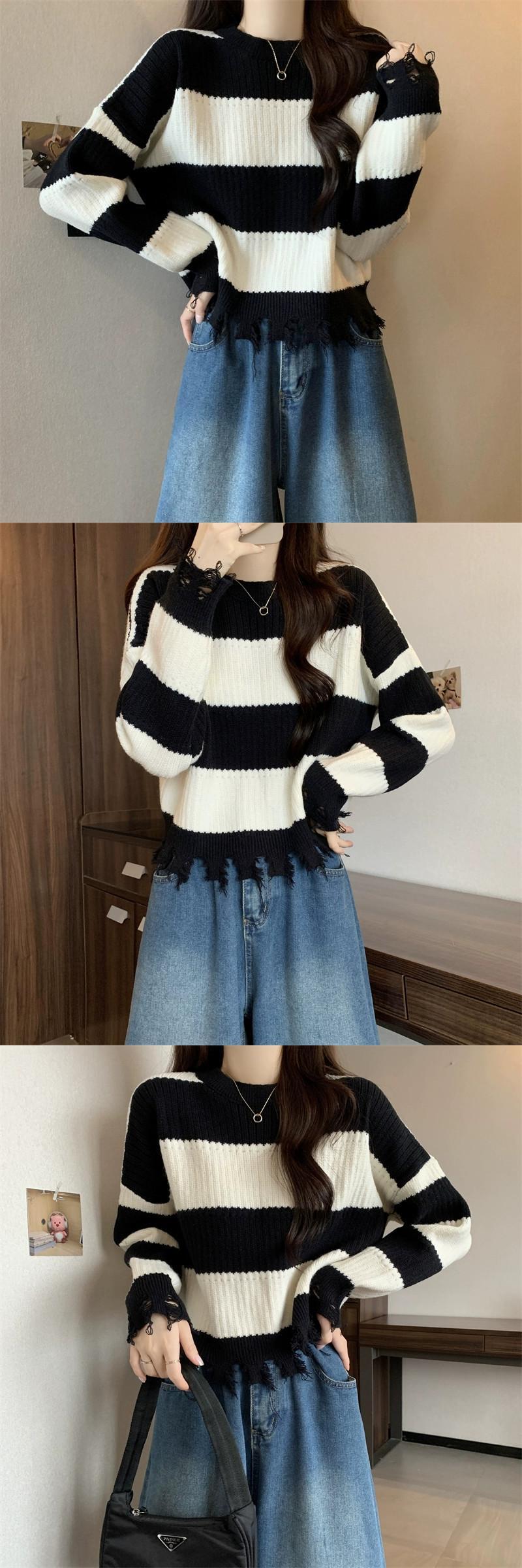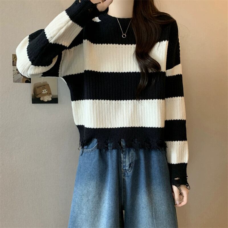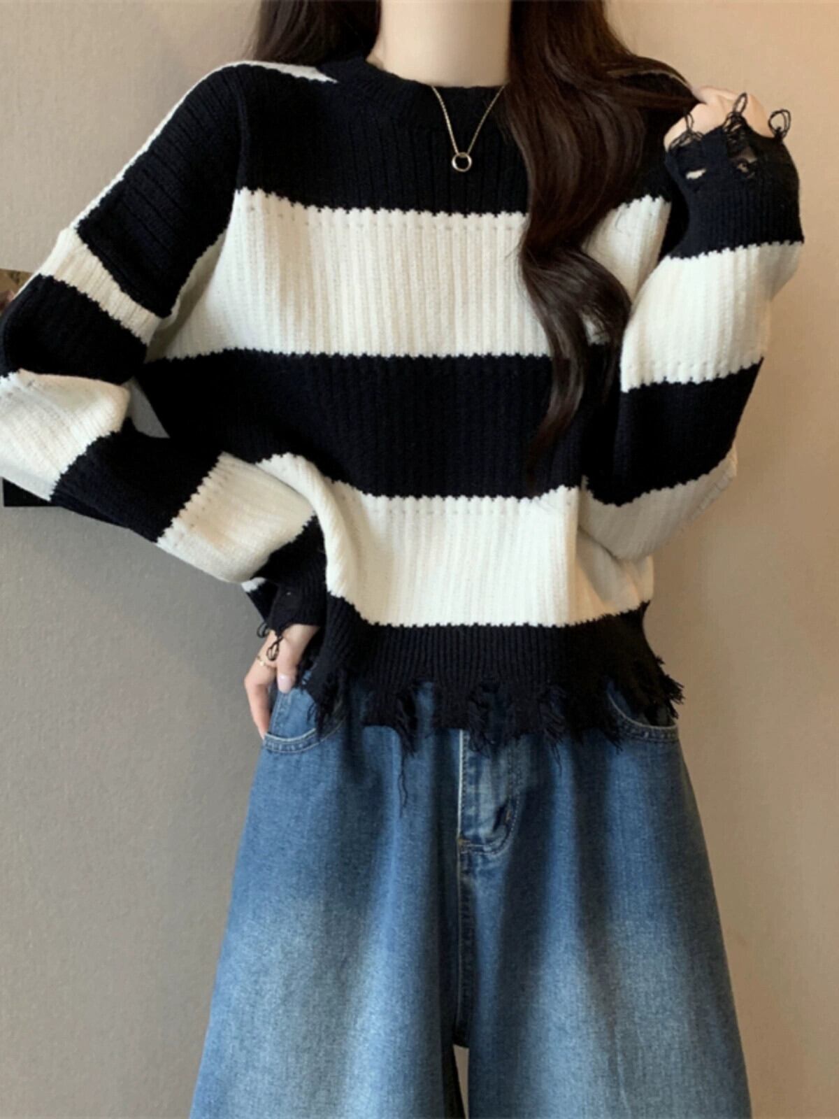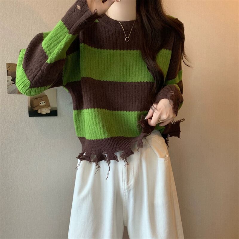 緑のストライプの短い破れたセーターの女性、秋と冬のレトロなデザイン、ゆったりとしたアウターウェア、怠惰なスタイルのプルオーバーセーター ショート オータム 秋物 ウィンター 冬物 グリーン 7460072541238237 | framboise21