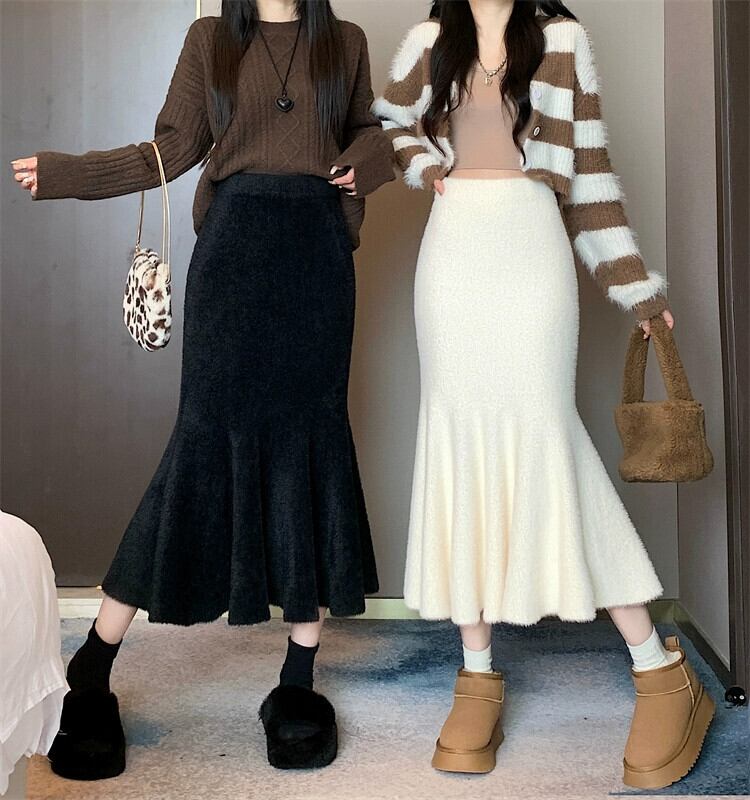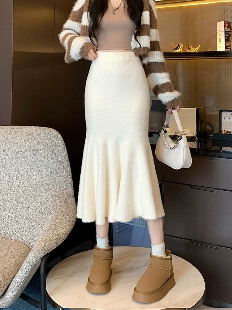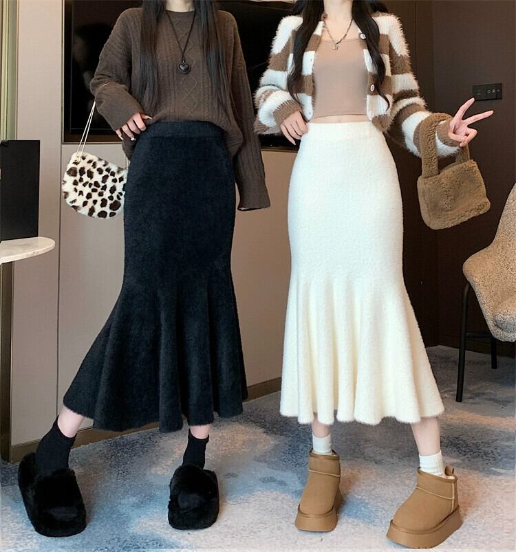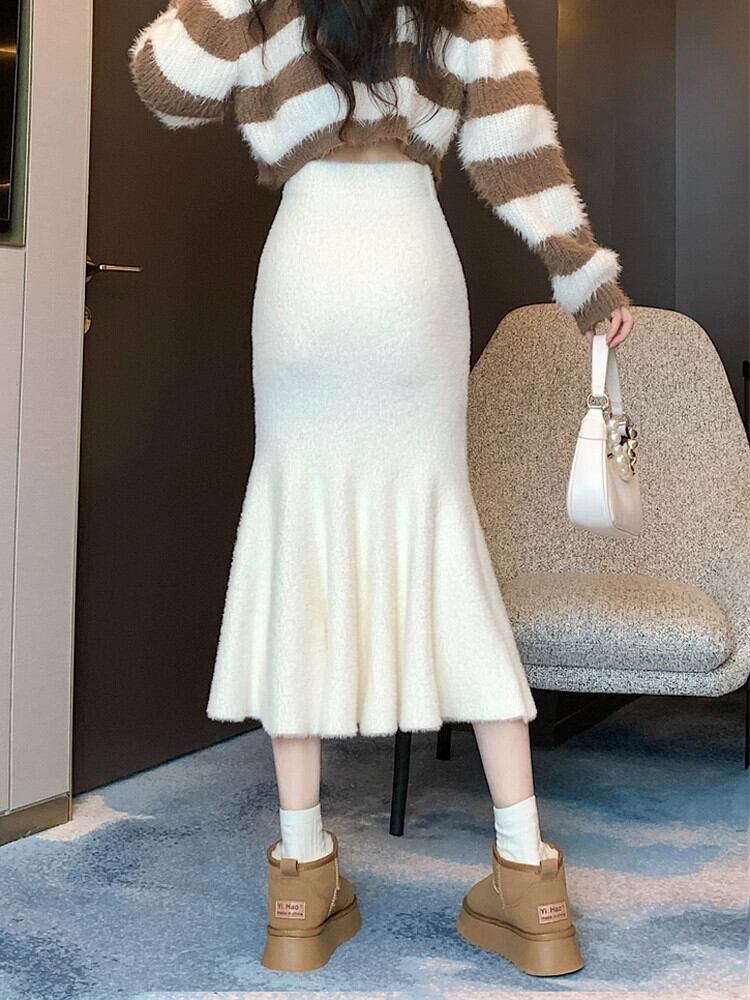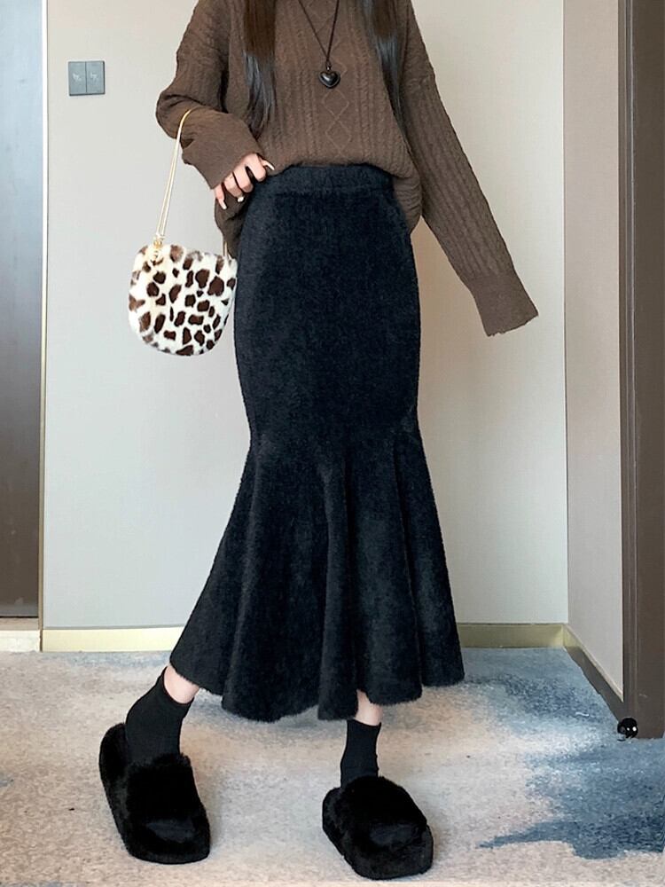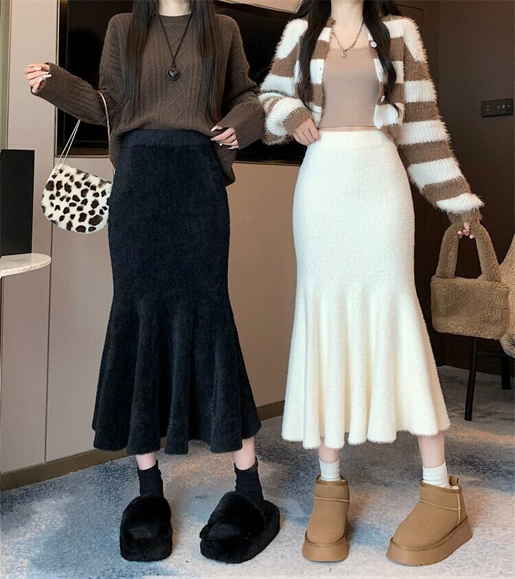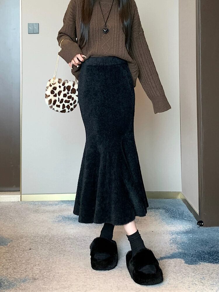 ソフトでワックス状のミンクベルベットニットスカート女性の秋と冬のスリミングミッドレングスハイウエストAラインヒップハグフィッシュテールスカート オータム 秋物 ウィンター 冬物 7460078087329089 | framboise21