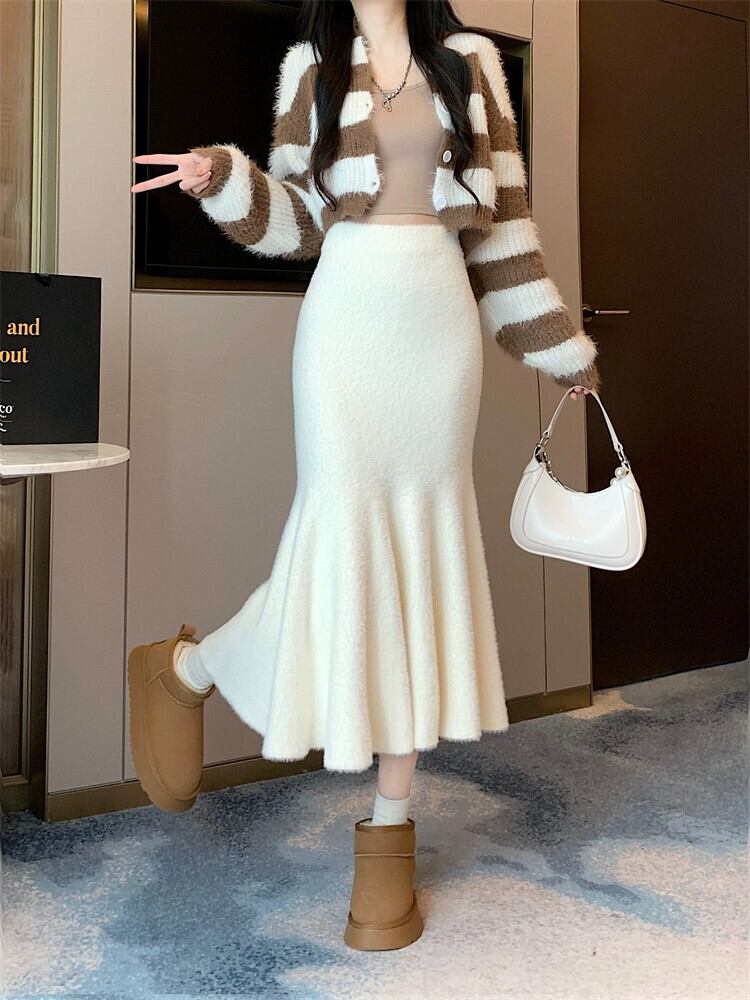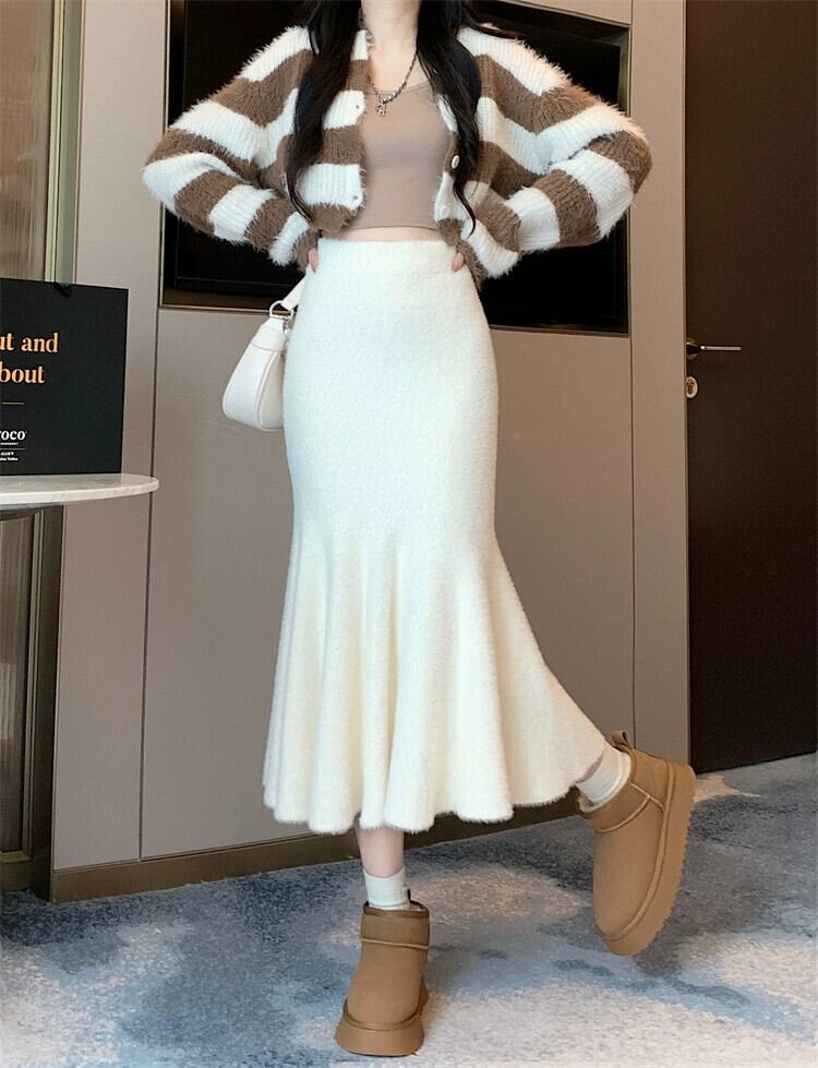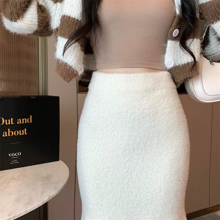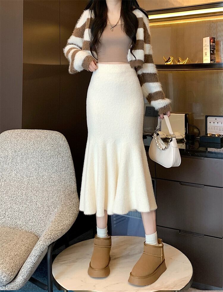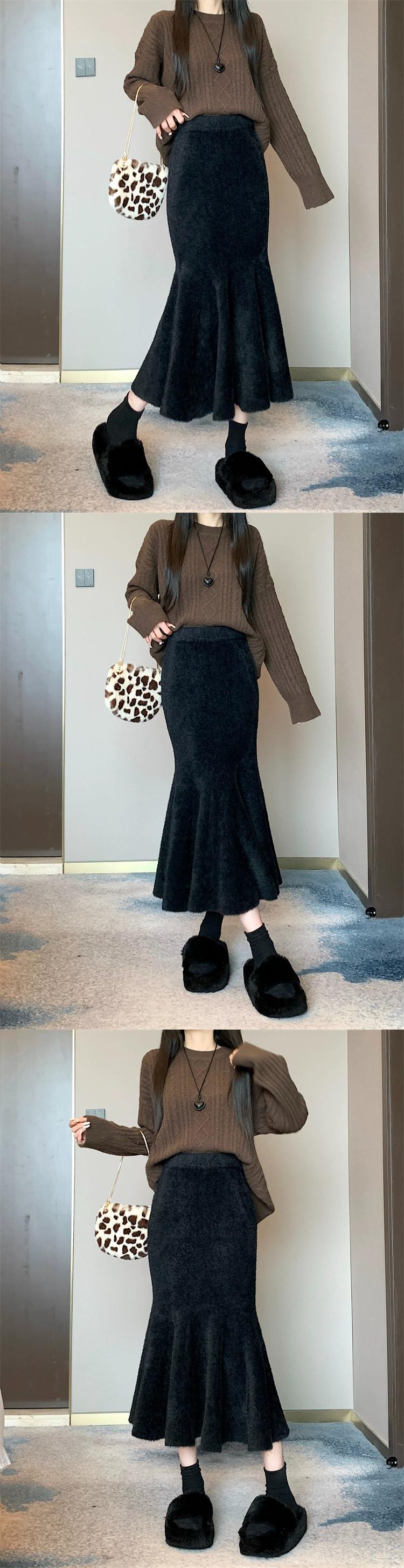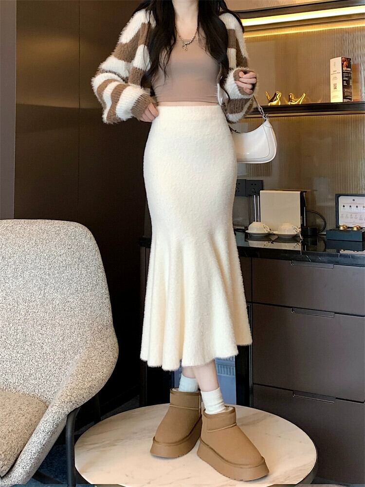ソフトでワックス状のミンクベルベットニットスカート女性の秋と冬のスリミングミッドレングスハイウエストAラインヒップハグフィッシュテールスカート オータム 秋物 ウィンター 冬物 7460078087329089 | framboise21