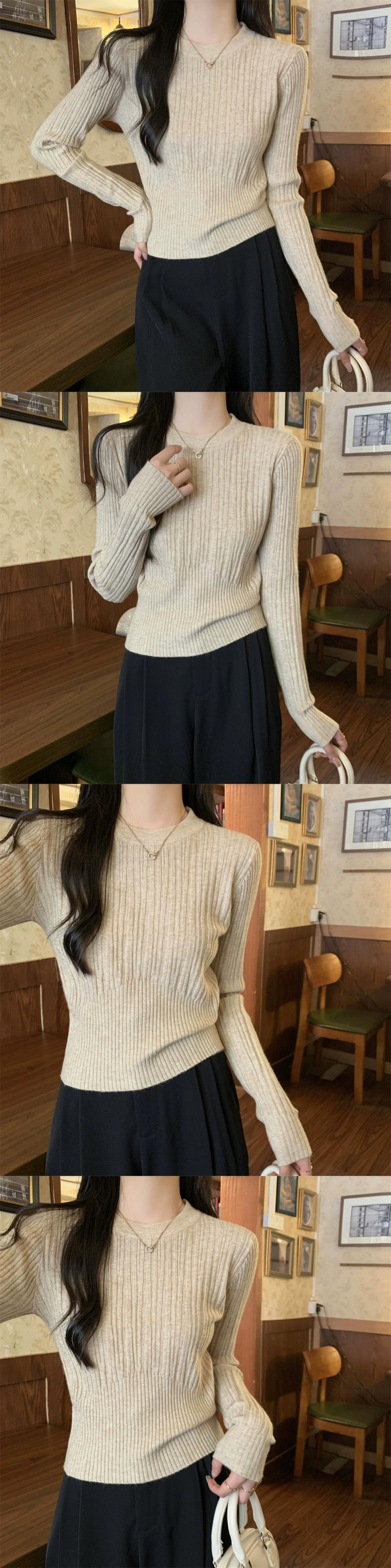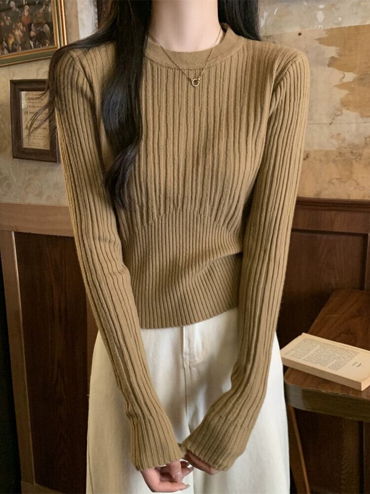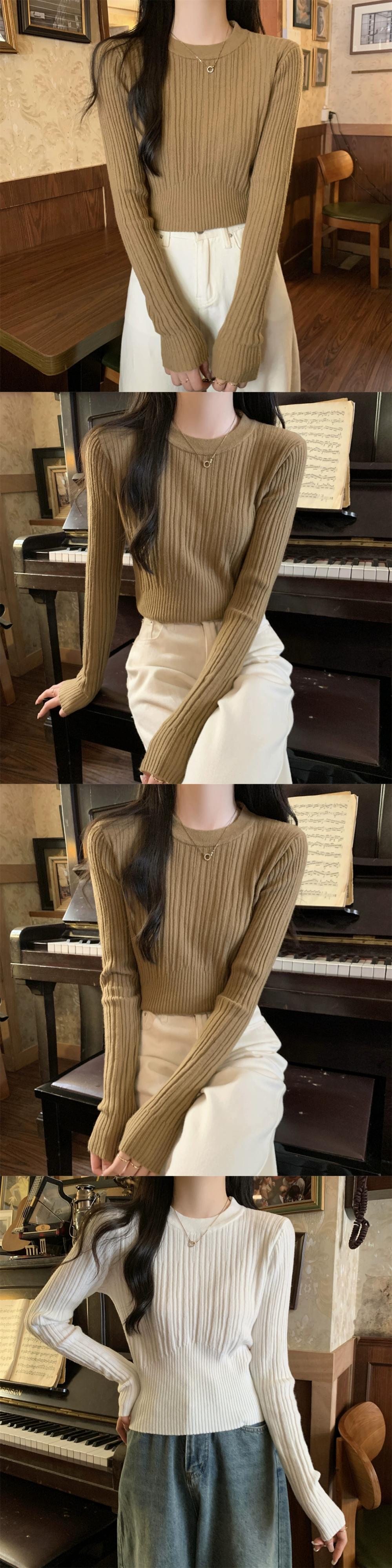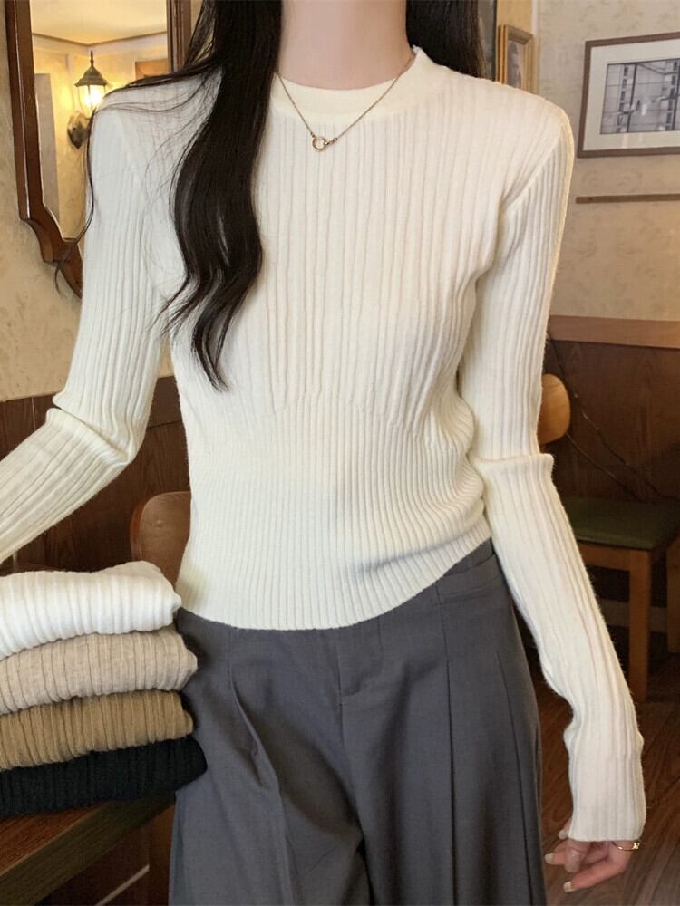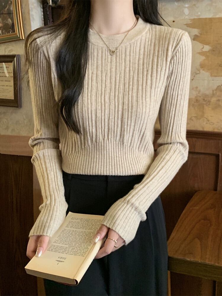 オートミールカラーピットニットボトムシャツ女性 2024 春と秋の新作スリムフィットインナーラウンドネックプルオーバーセーター スプリング 春物 オータム 秋物 Oネック 7460077447583846 | framboise21