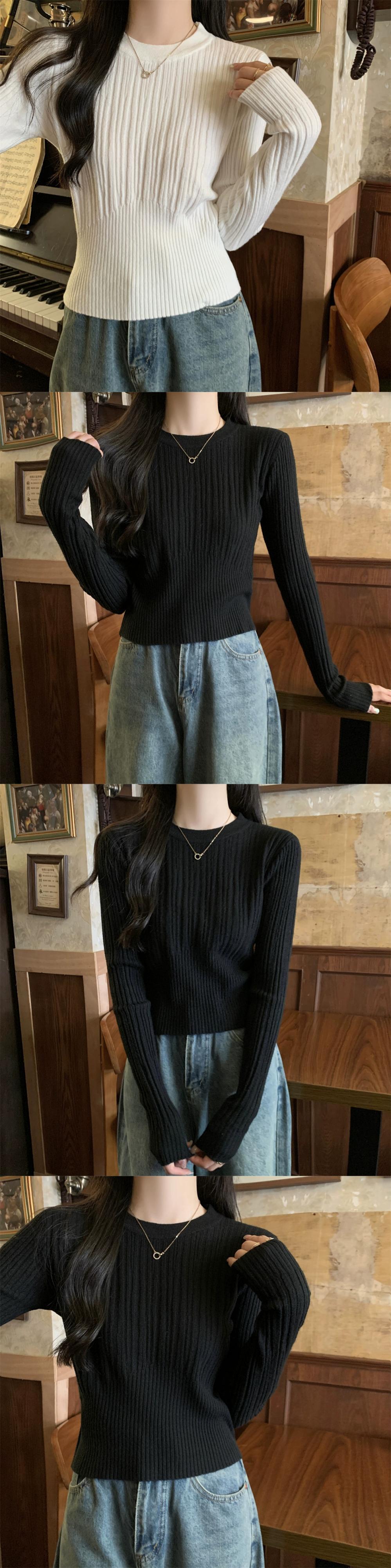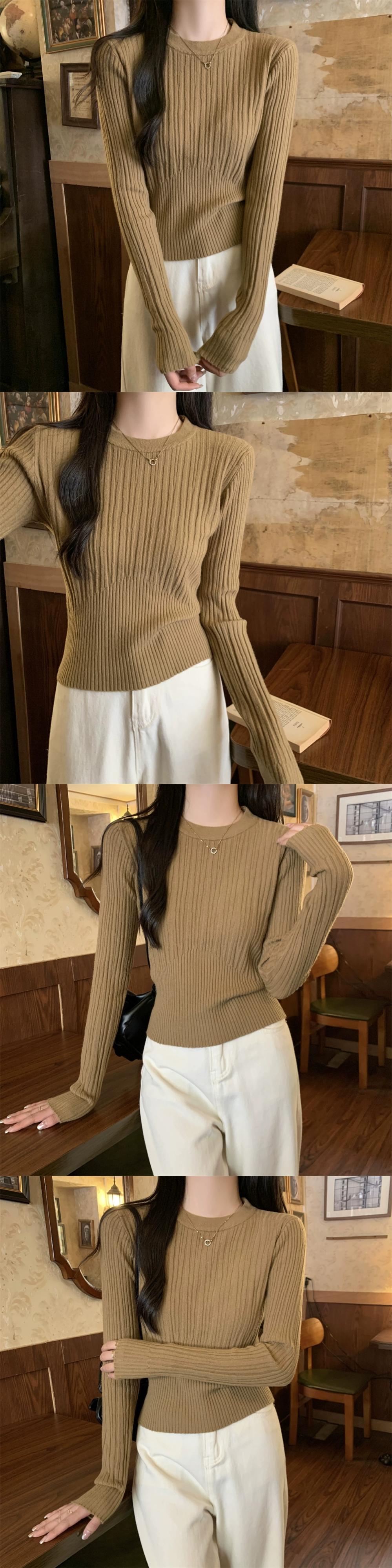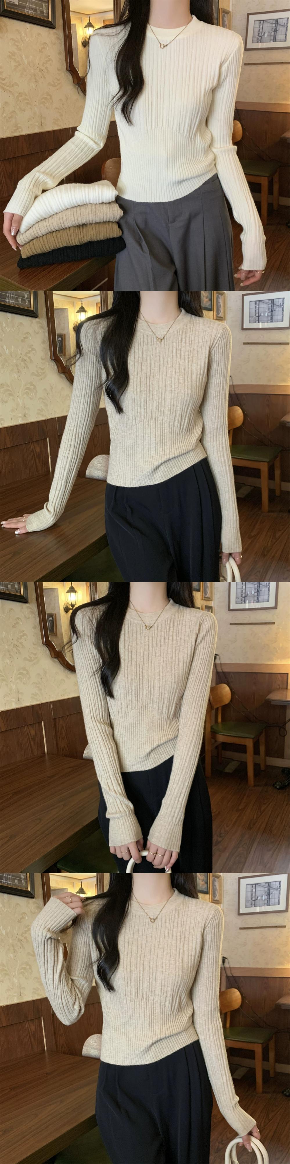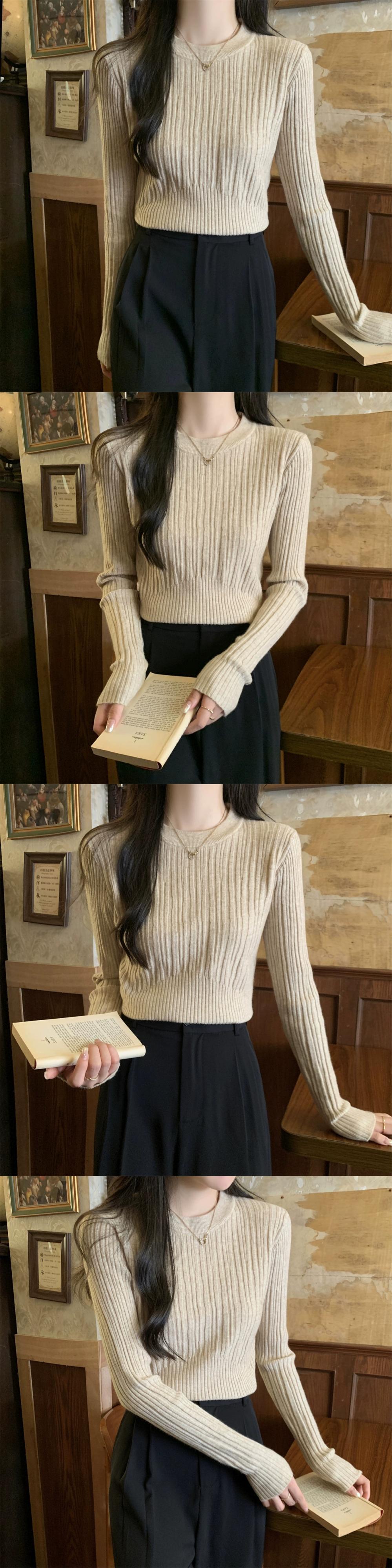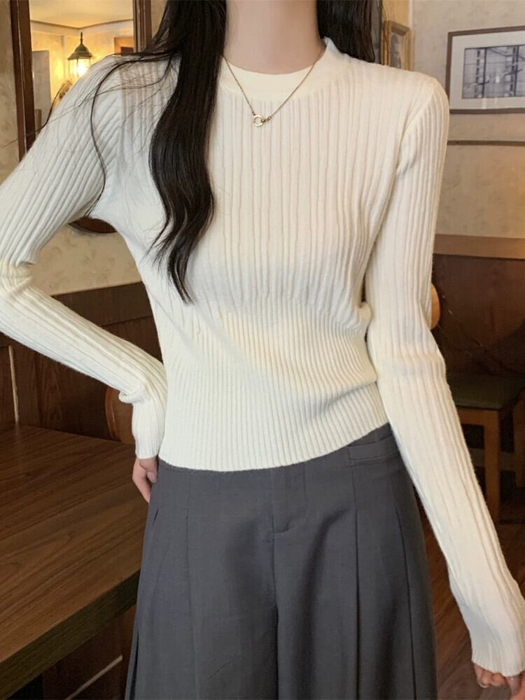 オートミールカラーピットニットボトムシャツ女性 2024 春と秋の新作スリムフィットインナーラウンドネックプルオーバーセーター スプリング 春物 オータム 秋物 Oネック 7460077447583846 | framboise21