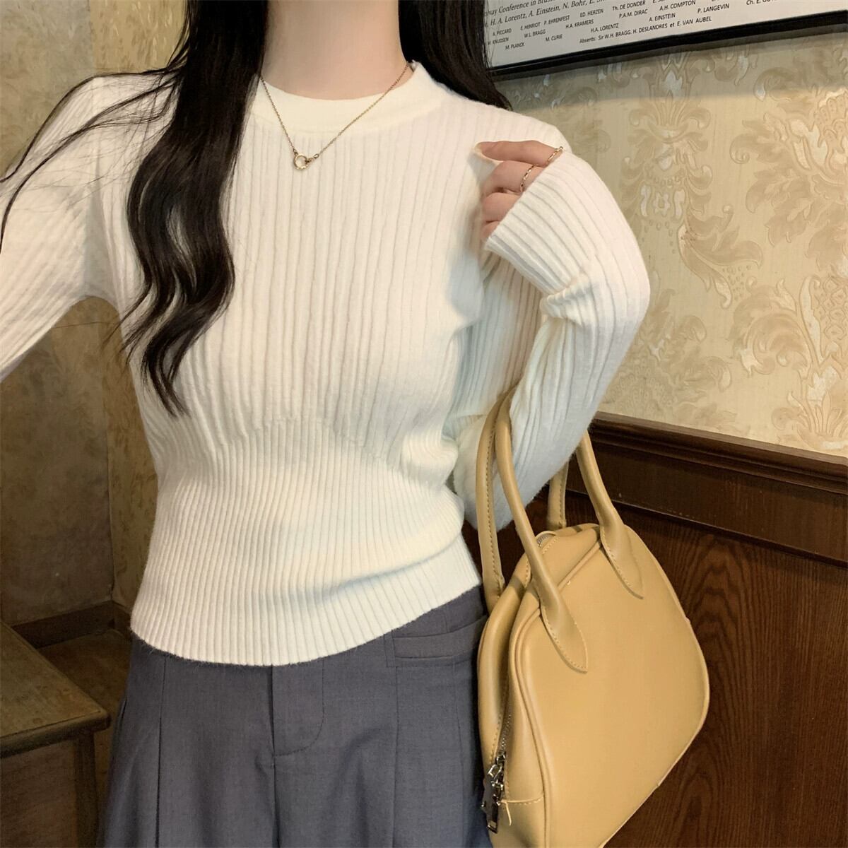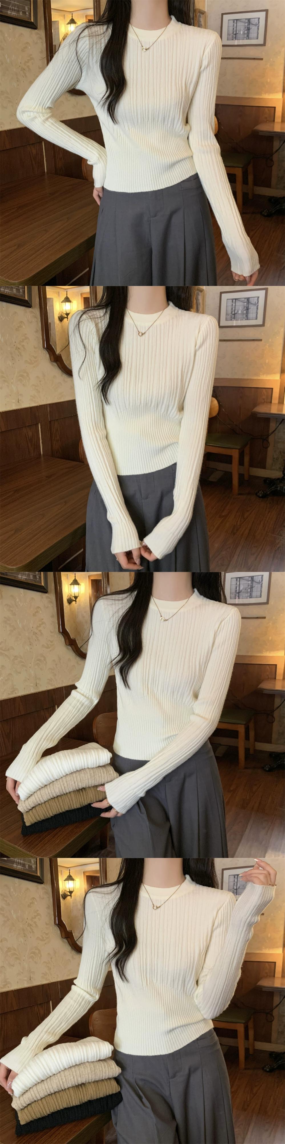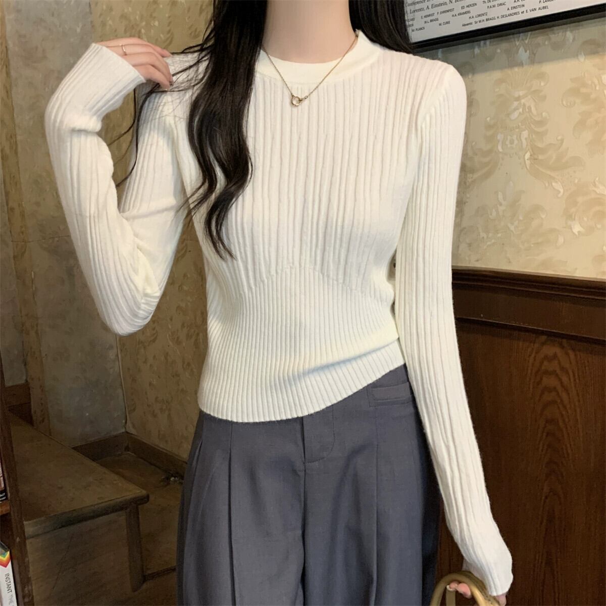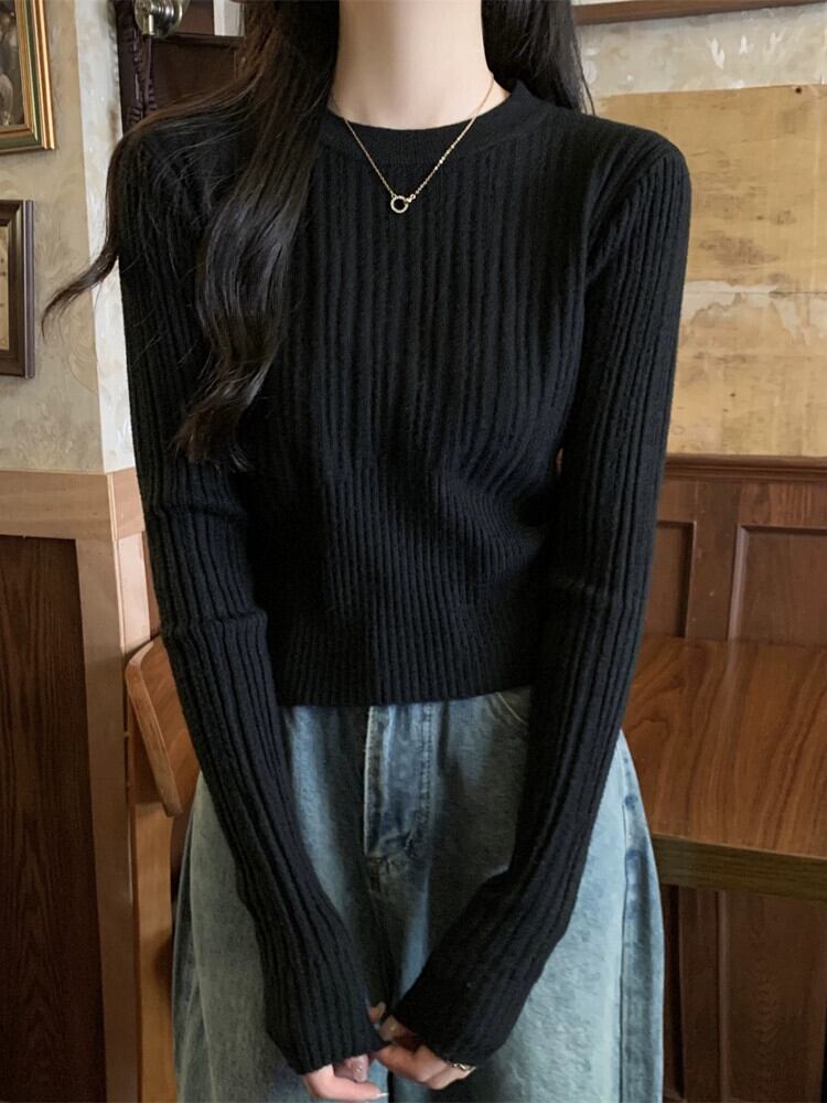 オートミールカラーピットニットボトムシャツ女性 2024 春と秋の新作スリムフィットインナーラウンドネックプルオーバーセーター スプリング 春物 オータム 秋物 Oネック 7460077447583846 | framboise21