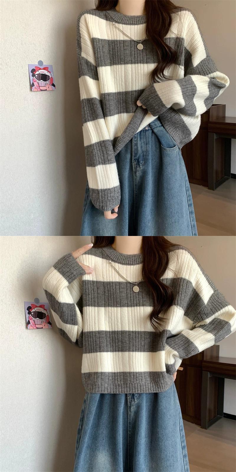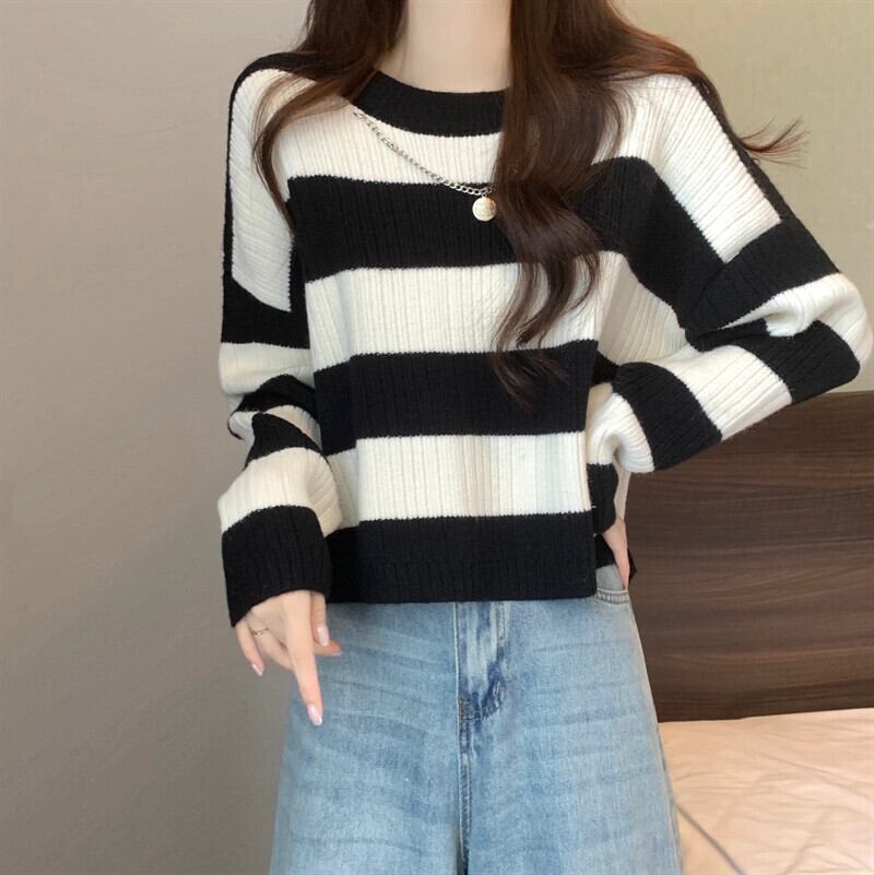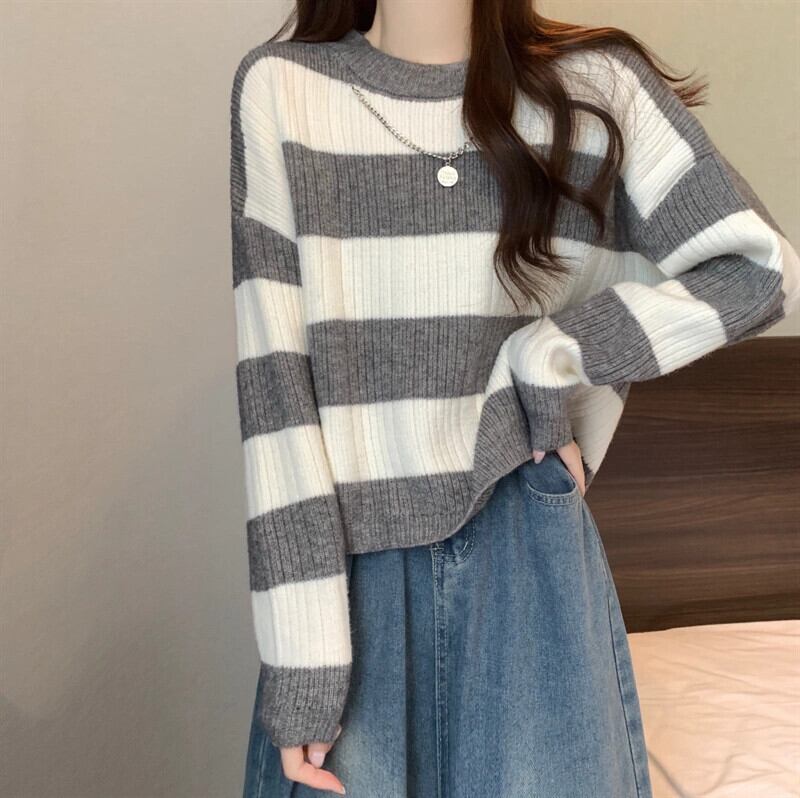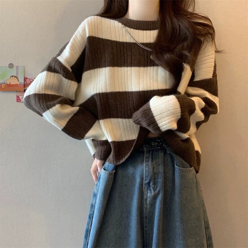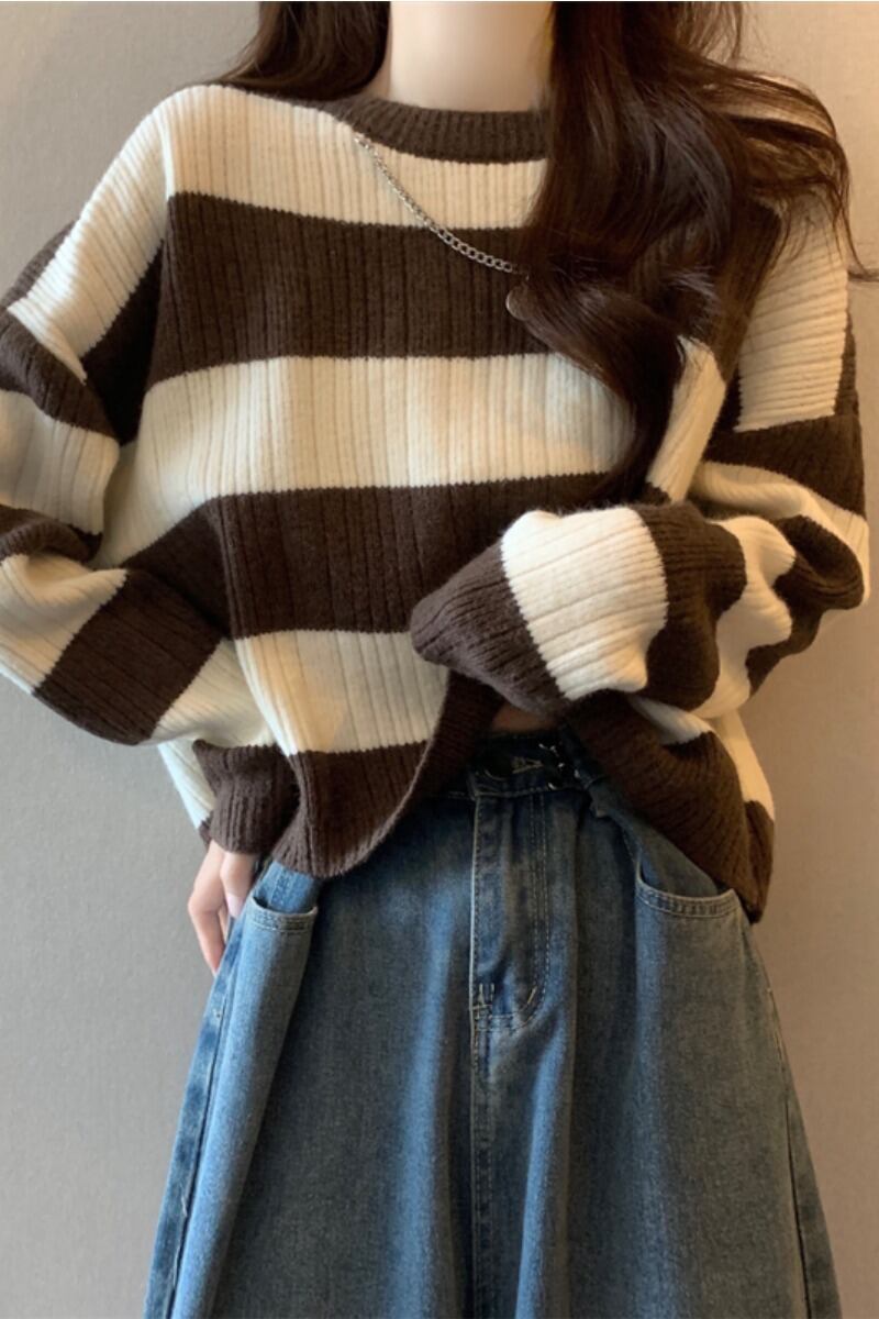 ブラウンストライプショートセーター女性 2024 新しい秋と冬のルーズアウターウェア怠惰なスタイルラウンドネック長袖セーター ロング オータム 秋物 ウィンター 冬物 Oネック 7460049404575033 | framboise21