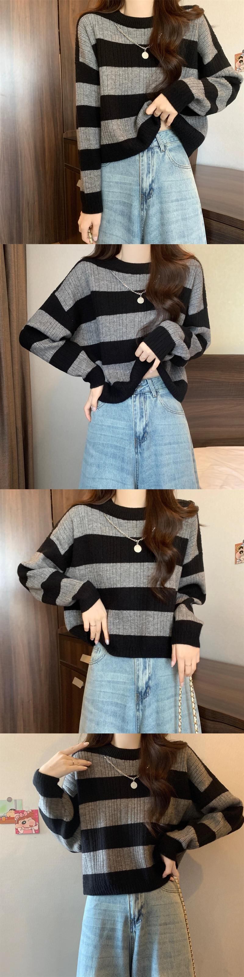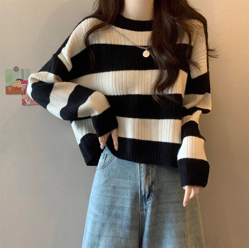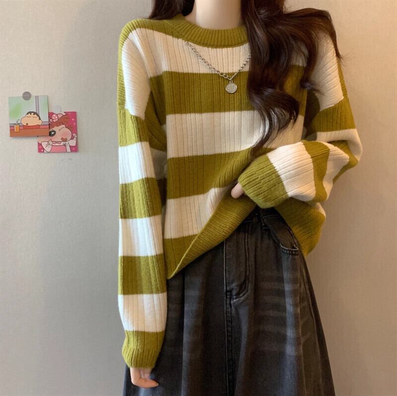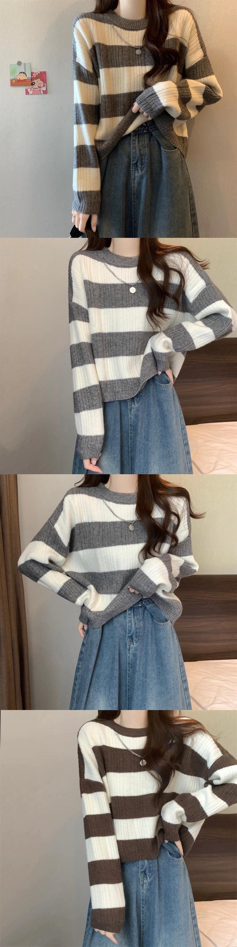 ブラウンストライプショートセーター女性 2024 新しい秋と冬のルーズアウターウェア怠惰なスタイルラウンドネック長袖セーター ロング オータム 秋物 ウィンター 冬物 Oネック 7460049404575033 | framboise21