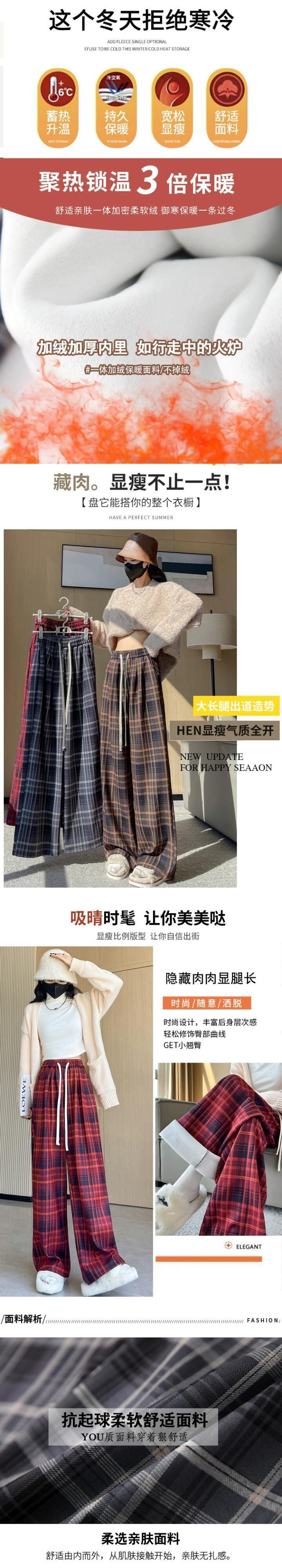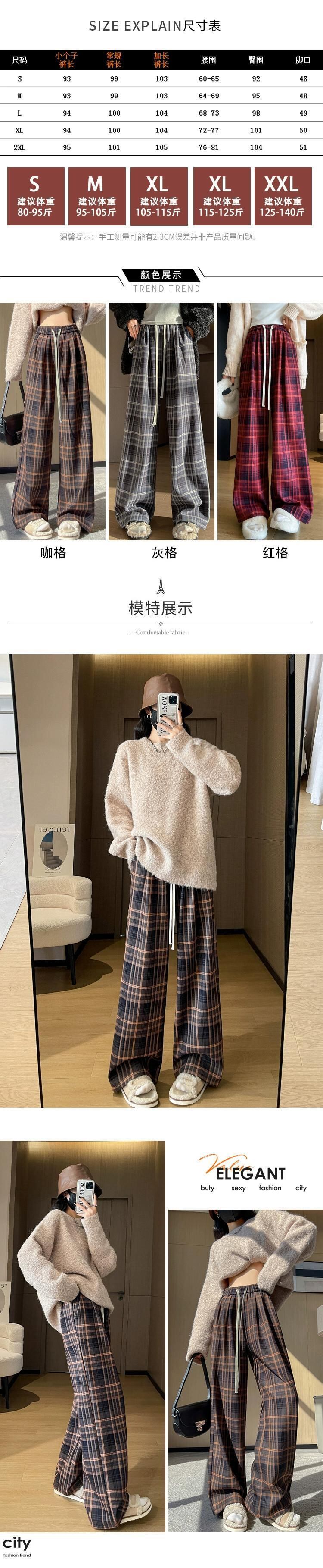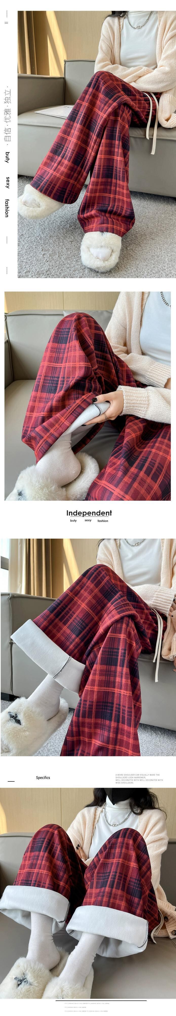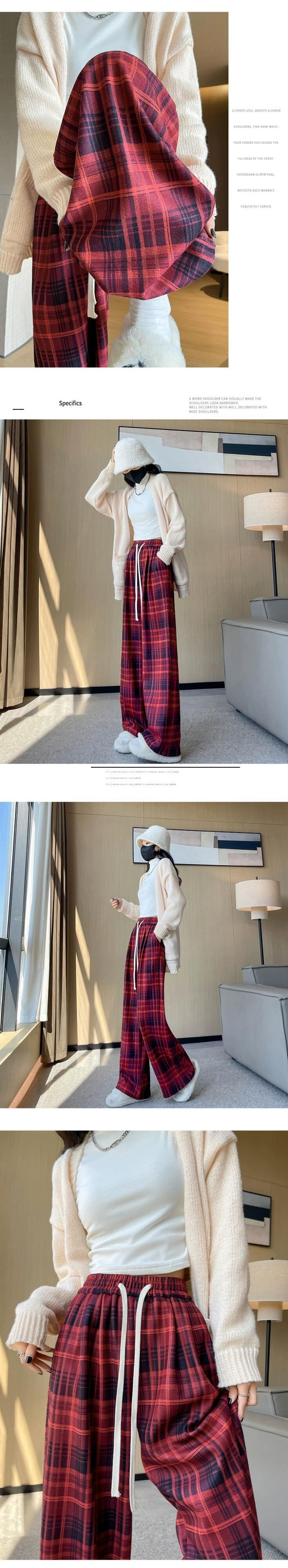 ベルベット肥厚ワイドレッグパンツ女性の秋と冬のレトロな赤いチェック柄パンツハイウエストドレープフロアレングスストレートカジュアルパンツ レッド オータム 秋物 ウィンター 冬物 7460083901488105 | framboise21