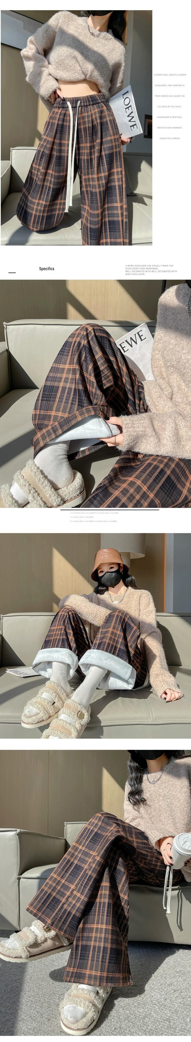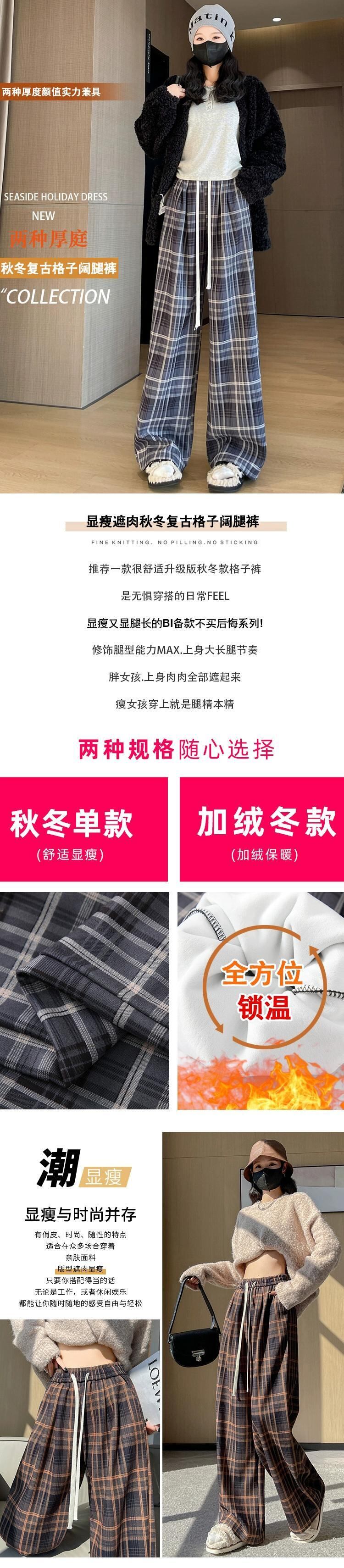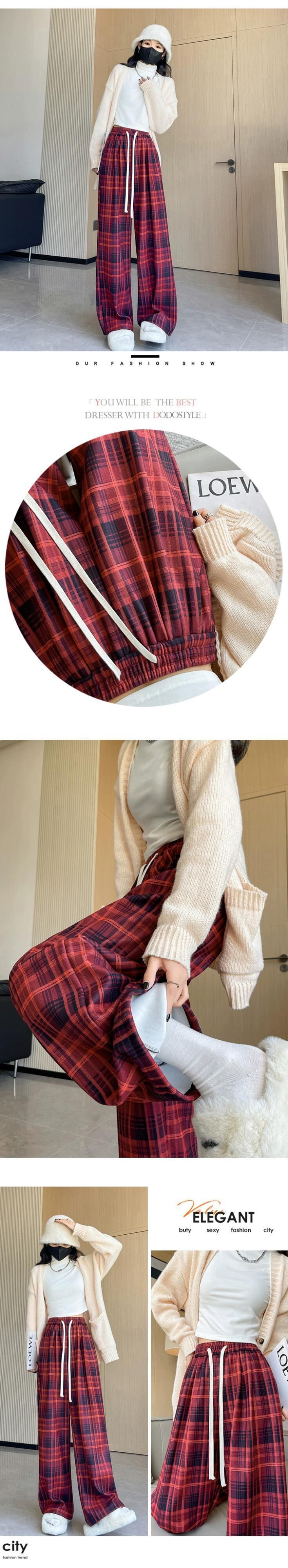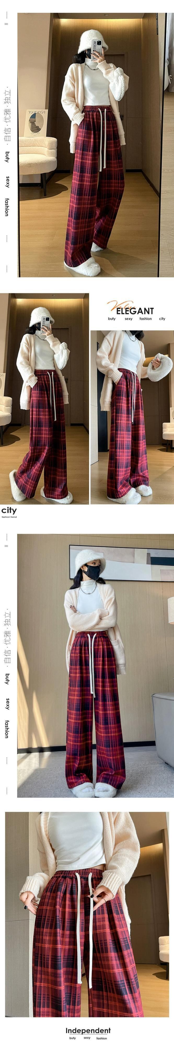ベルベット肥厚ワイドレッグパンツ女性の秋と冬のレトロな赤いチェック柄パンツハイウエストドレープフロアレングスストレートカジュアルパンツ レッド オータム 秋物 ウィンター 冬物 7460083901488105 | framboise21