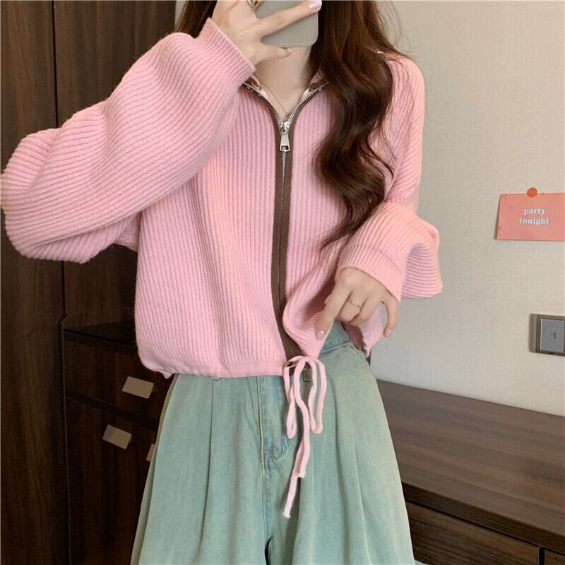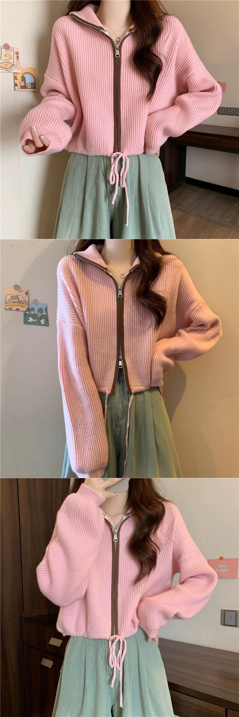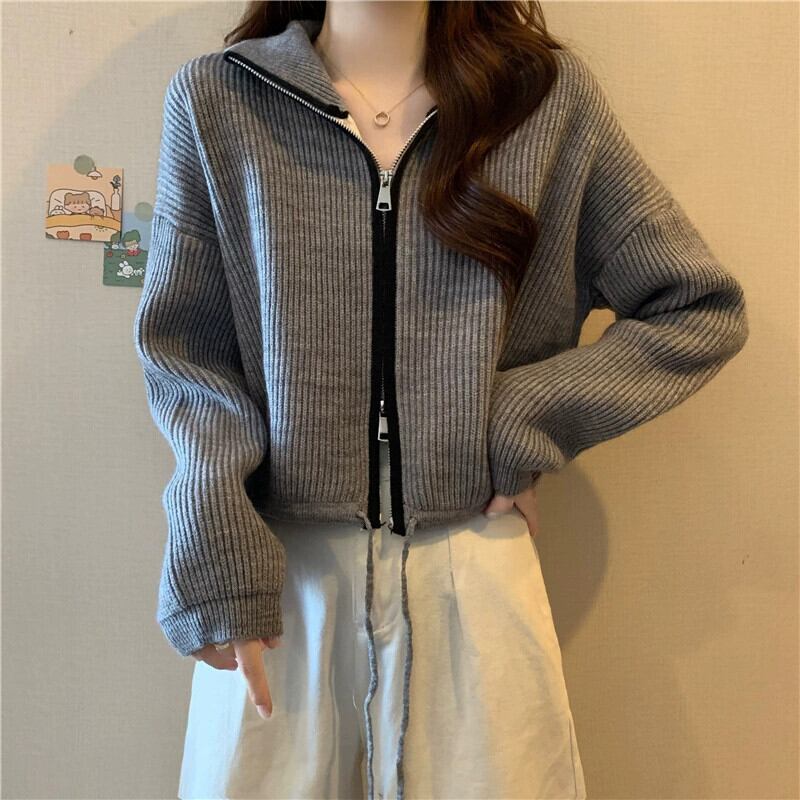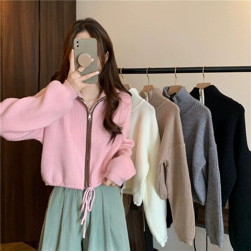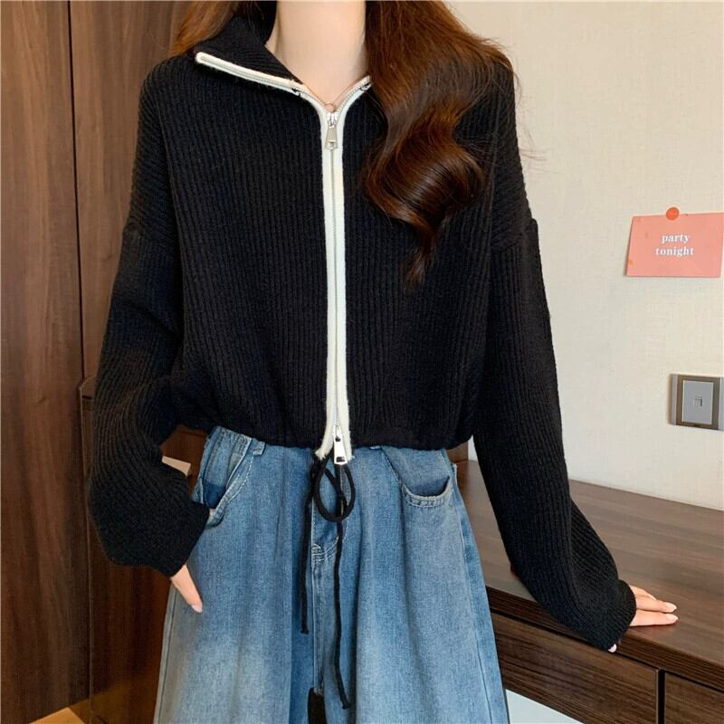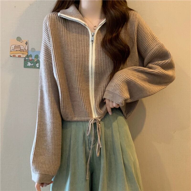 ダブルジッパータートルネックセータージャケット女性の秋と冬 ese スタイルレトロ怠惰なスタイルルーズアウターウェアショートニットカーディガン オータム 秋物 ウィンター 冬物 7460060383408195 | framboise21