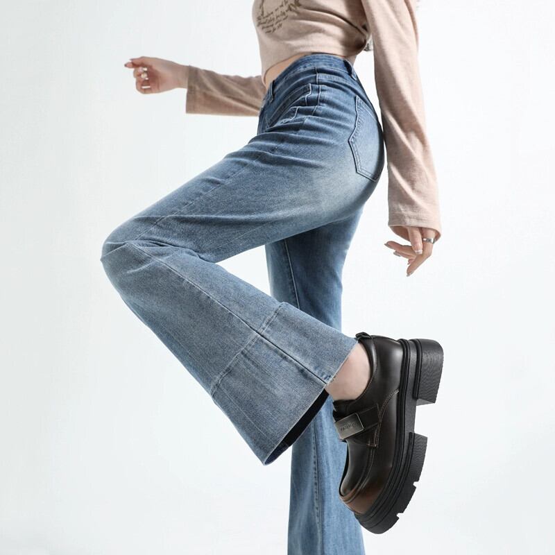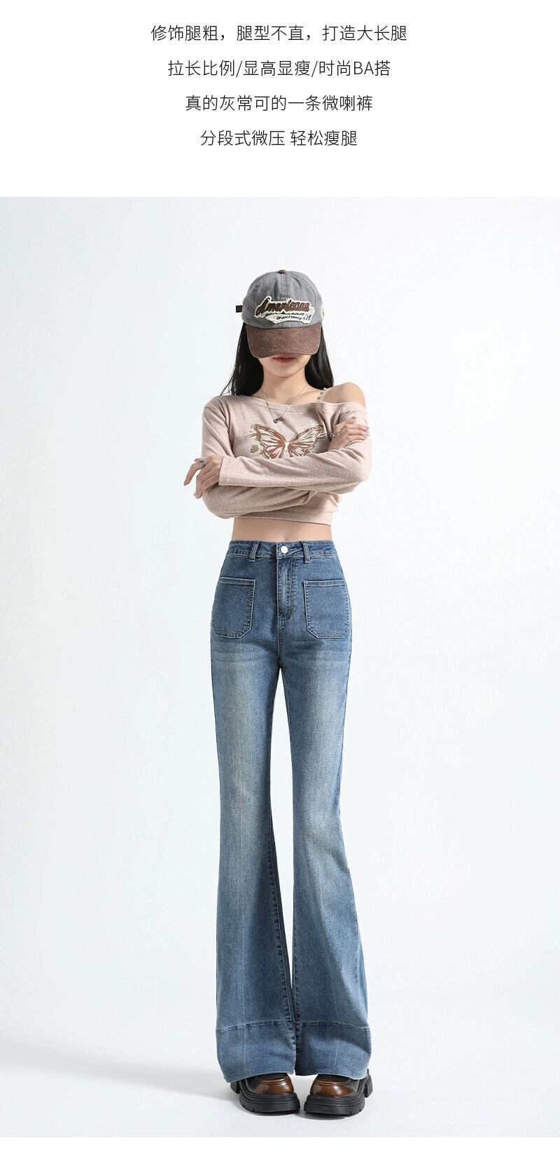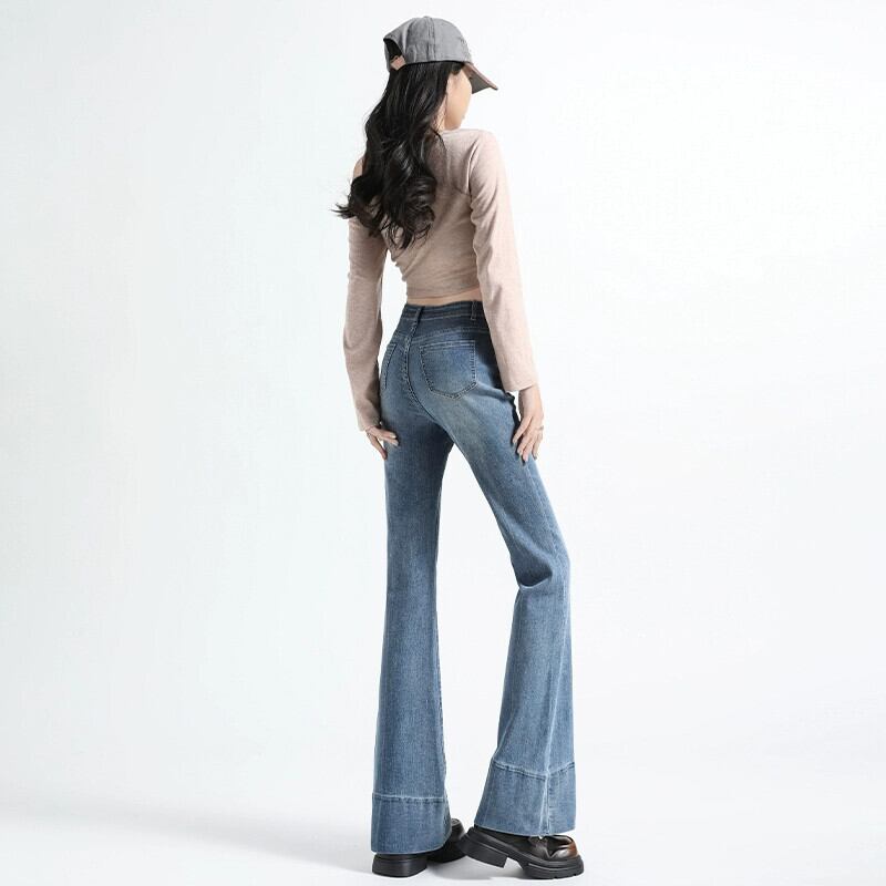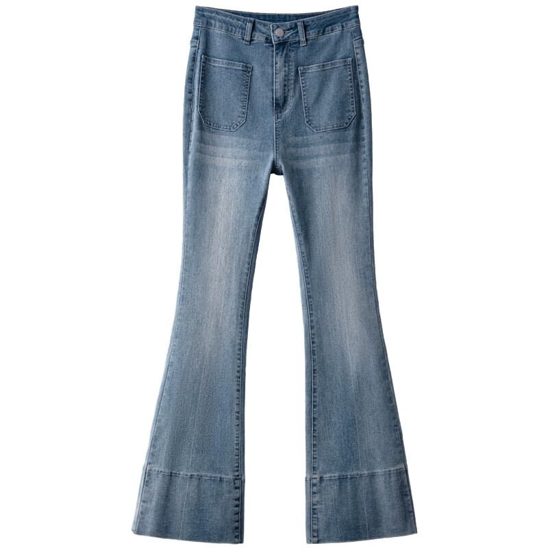 レトロブルーのわずかにフレアなジーンズ、レディース、春と秋、スリムフィット、汎用性の高いワイドレッグナローバージョン、フロアレングスのハイウエスト馬蹄パンツ レッド スプリング 春物 オータム 秋物 7460084319285659 | framboise21