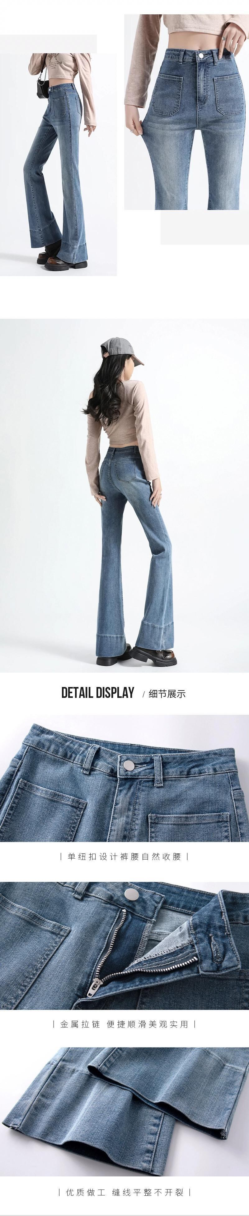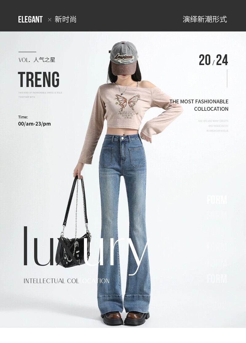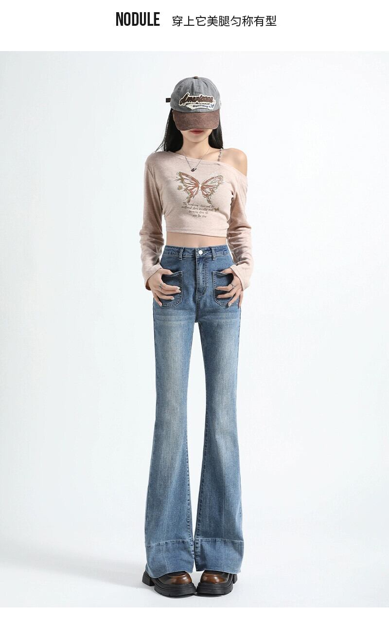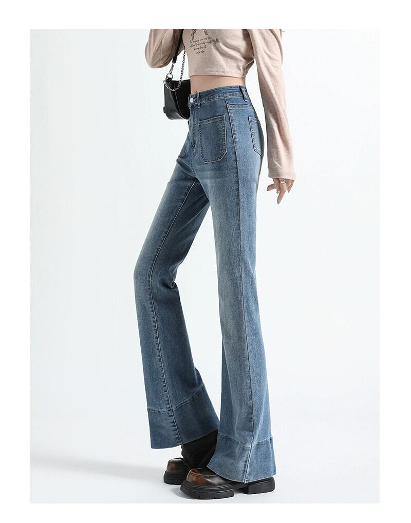 レトロブルーのわずかにフレアなジーンズ、レディース、春と秋、スリムフィット、汎用性の高いワイドレッグナローバージョン、フロアレングスのハイウエスト馬蹄パンツ レッド スプリング 春物 オータム 秋物 7460084319285659 | framboise21