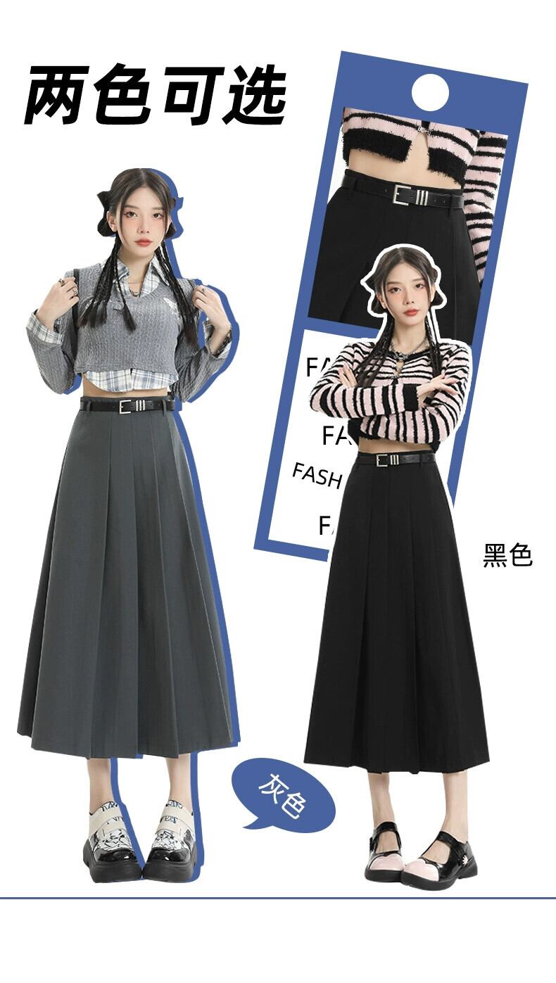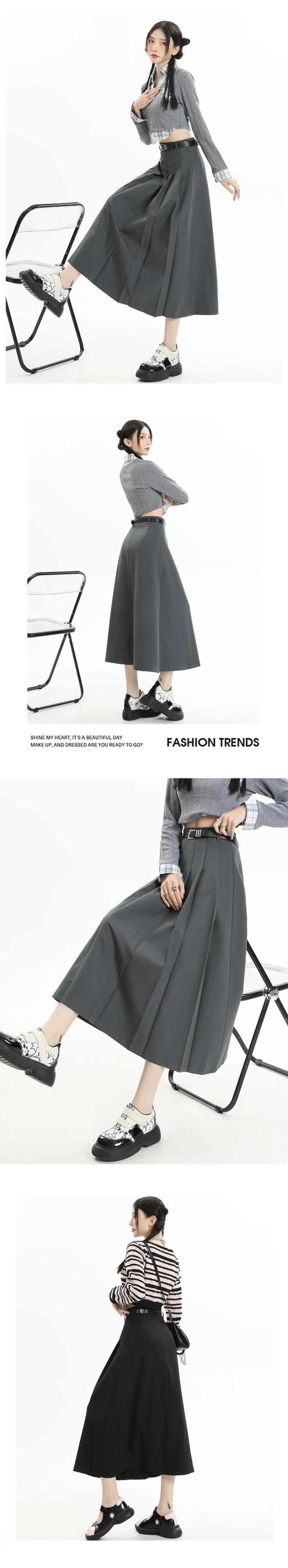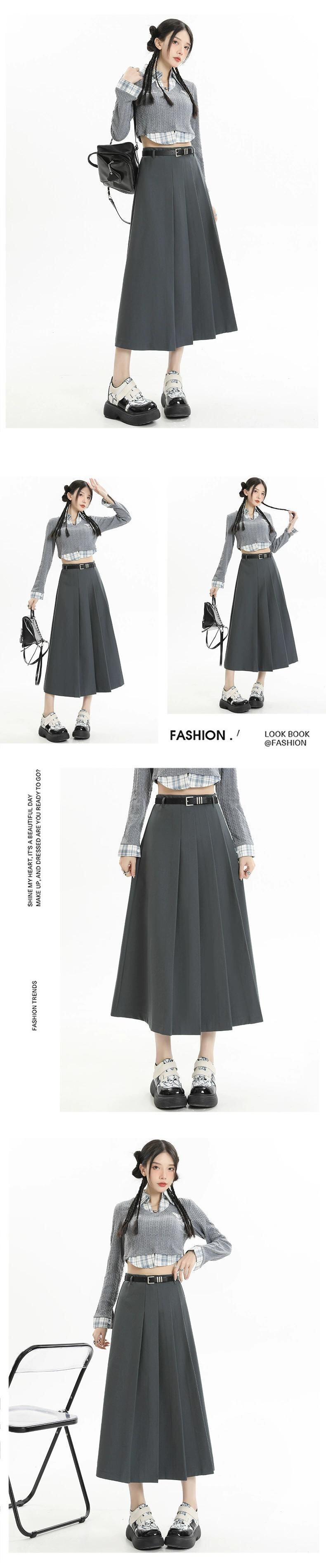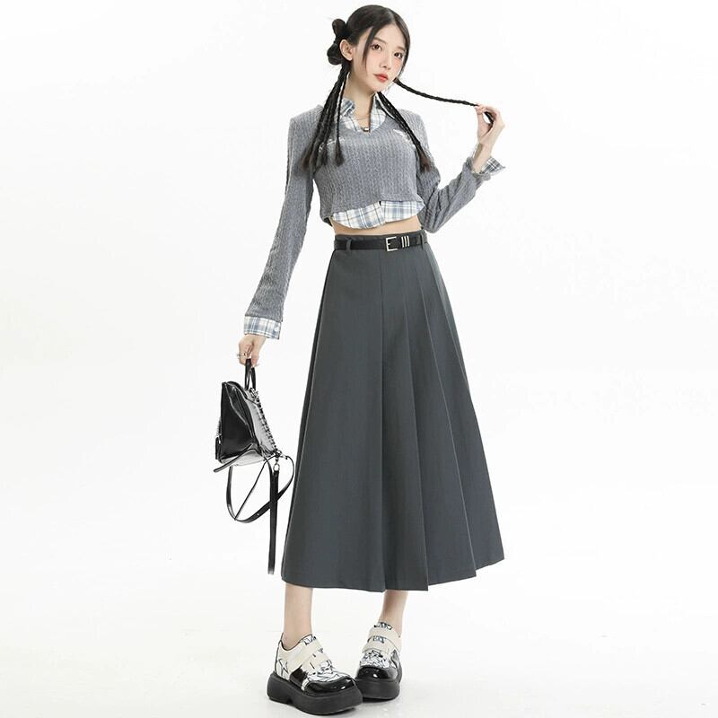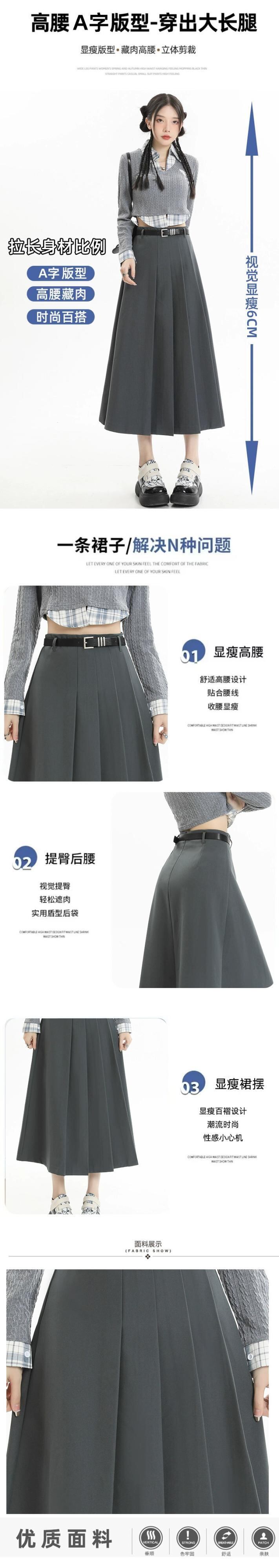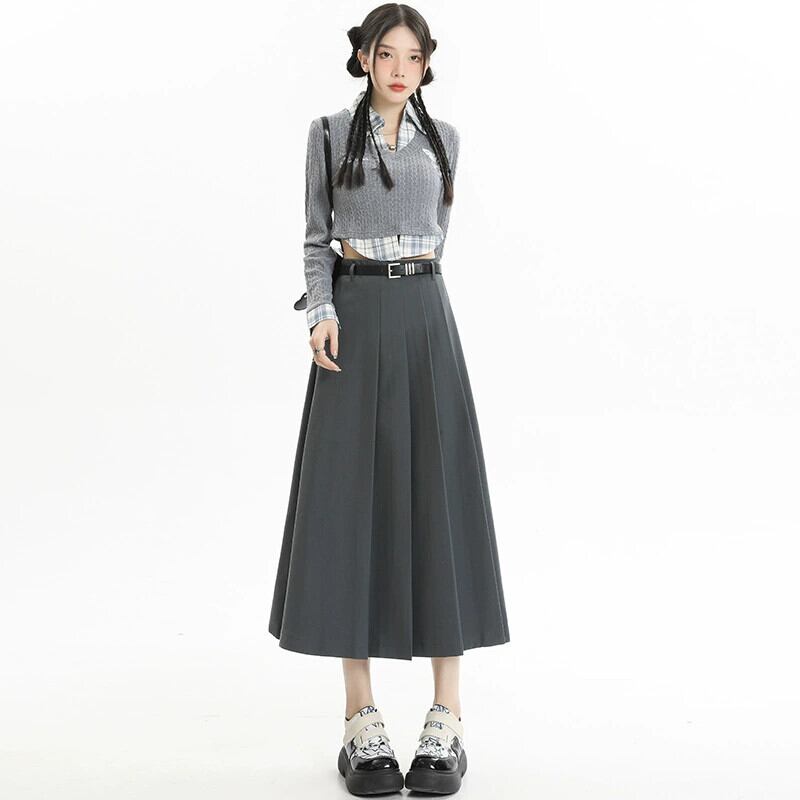 グレーのハイウエストスーツスカートレディース、春と秋のカレッジスタイルのプリーツスカートで股間をカバーし、スリムに見せます、ミドル丈の大きなスイングアンブレラスカート スプリング 春物 オータム 秋物 7460065918049219 | framboise21