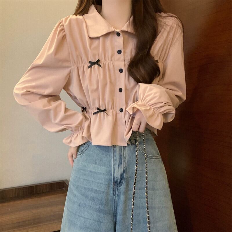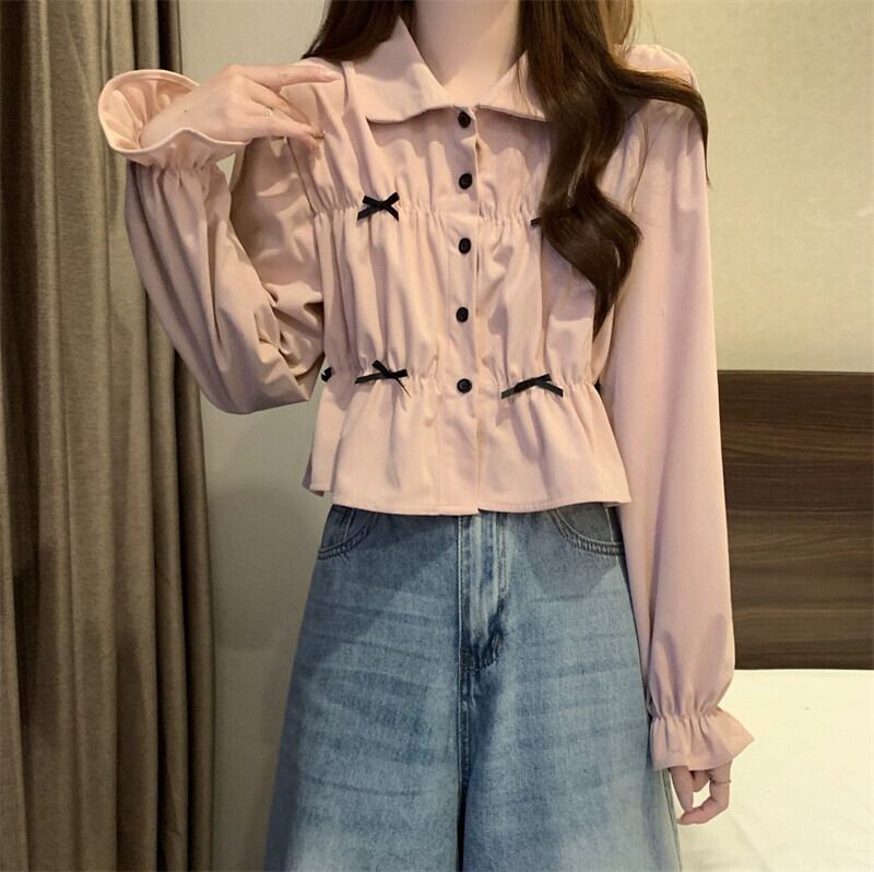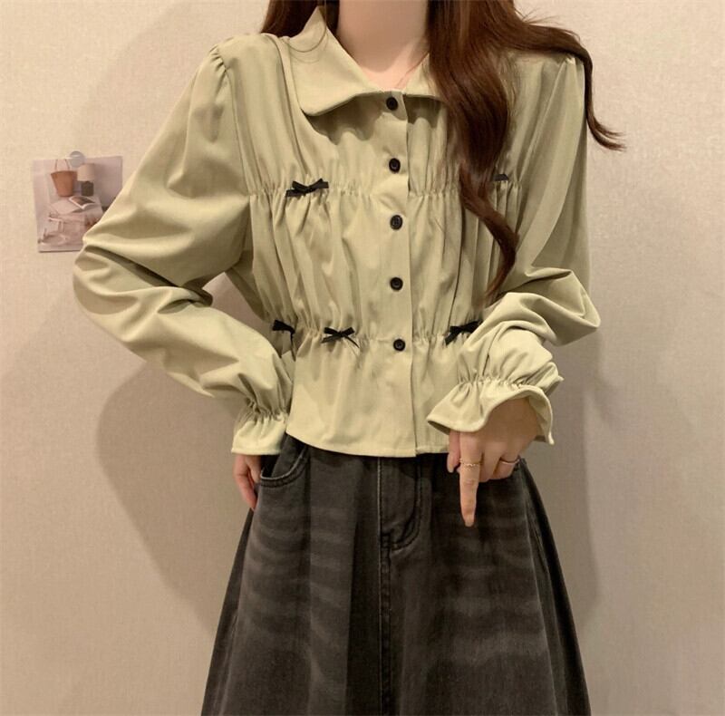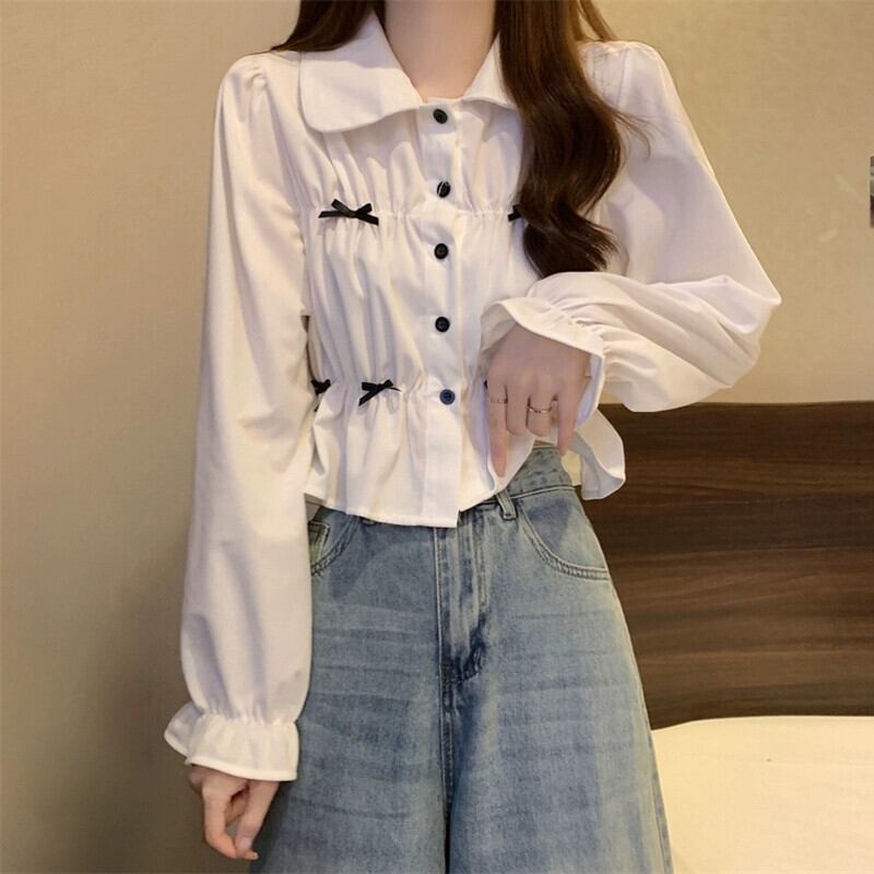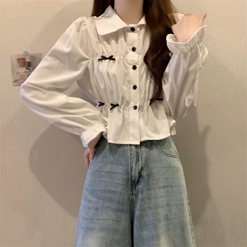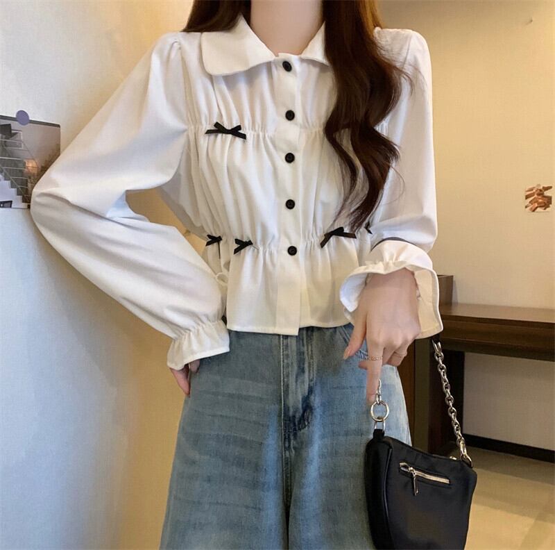 春と秋の白い半袖ベルスリーブシャツトップス、ファッショナブルで西洋風のデザイン、ユニークなプリーツ長袖シャツ ショート ロング ホワイト スプリング 春物 オータム 秋物 7460020960637637 | framboise21