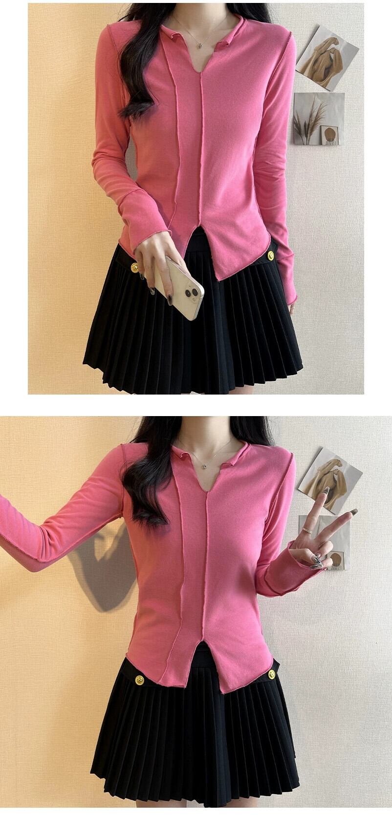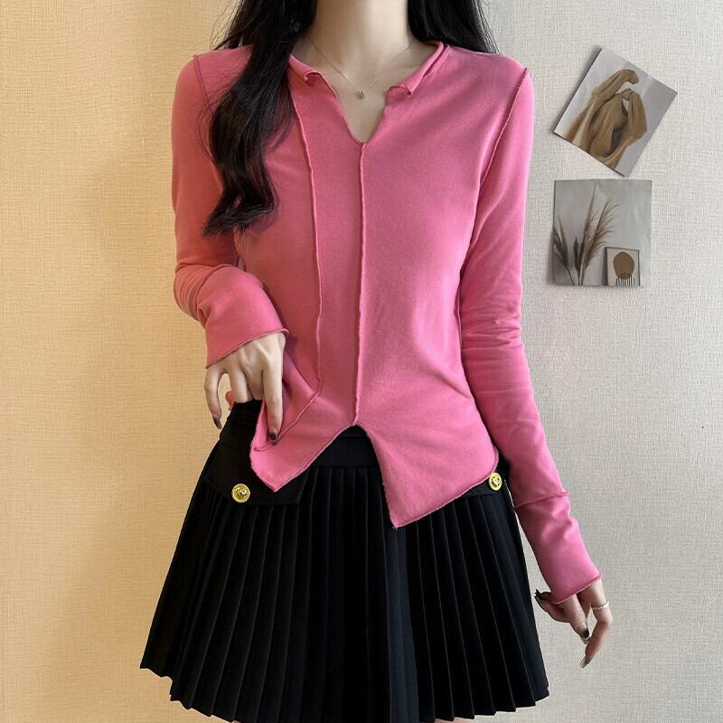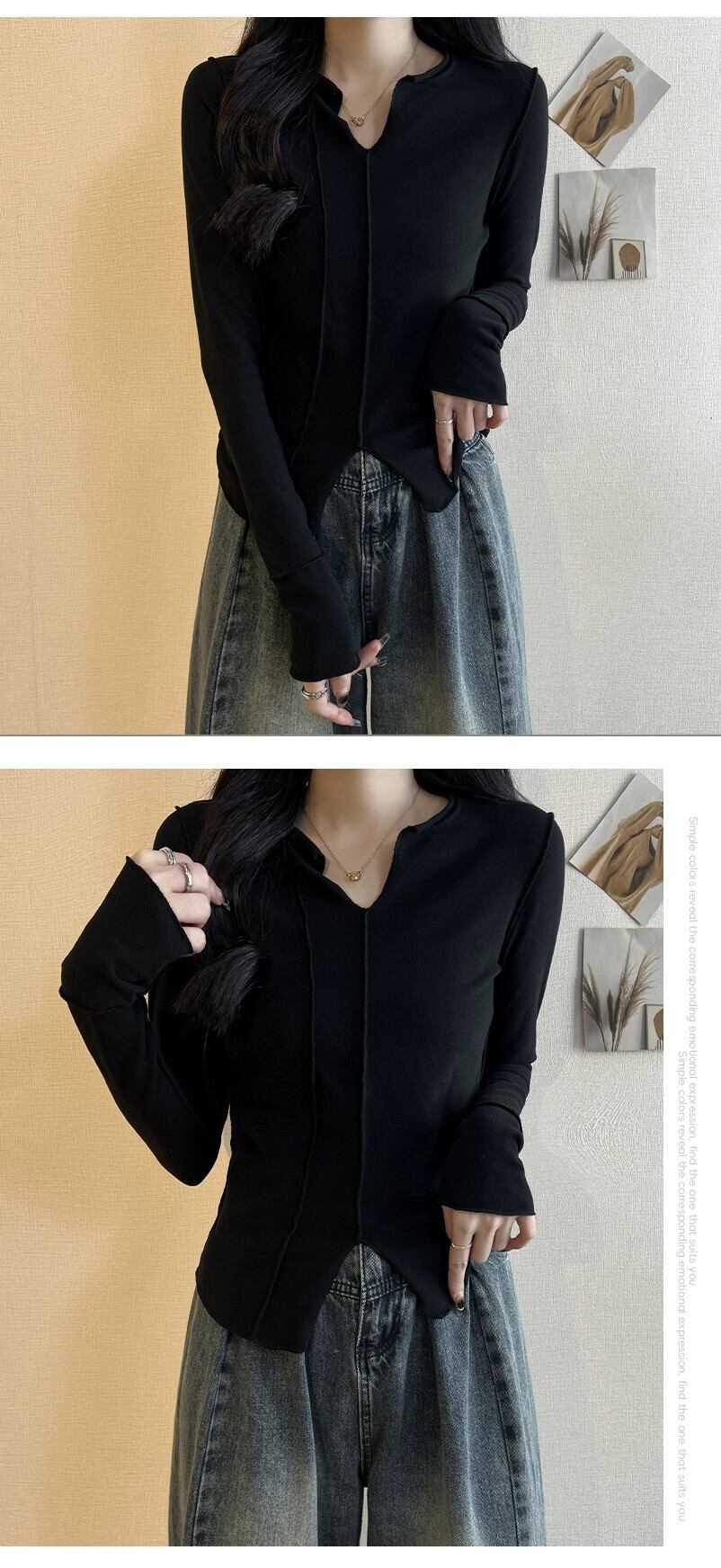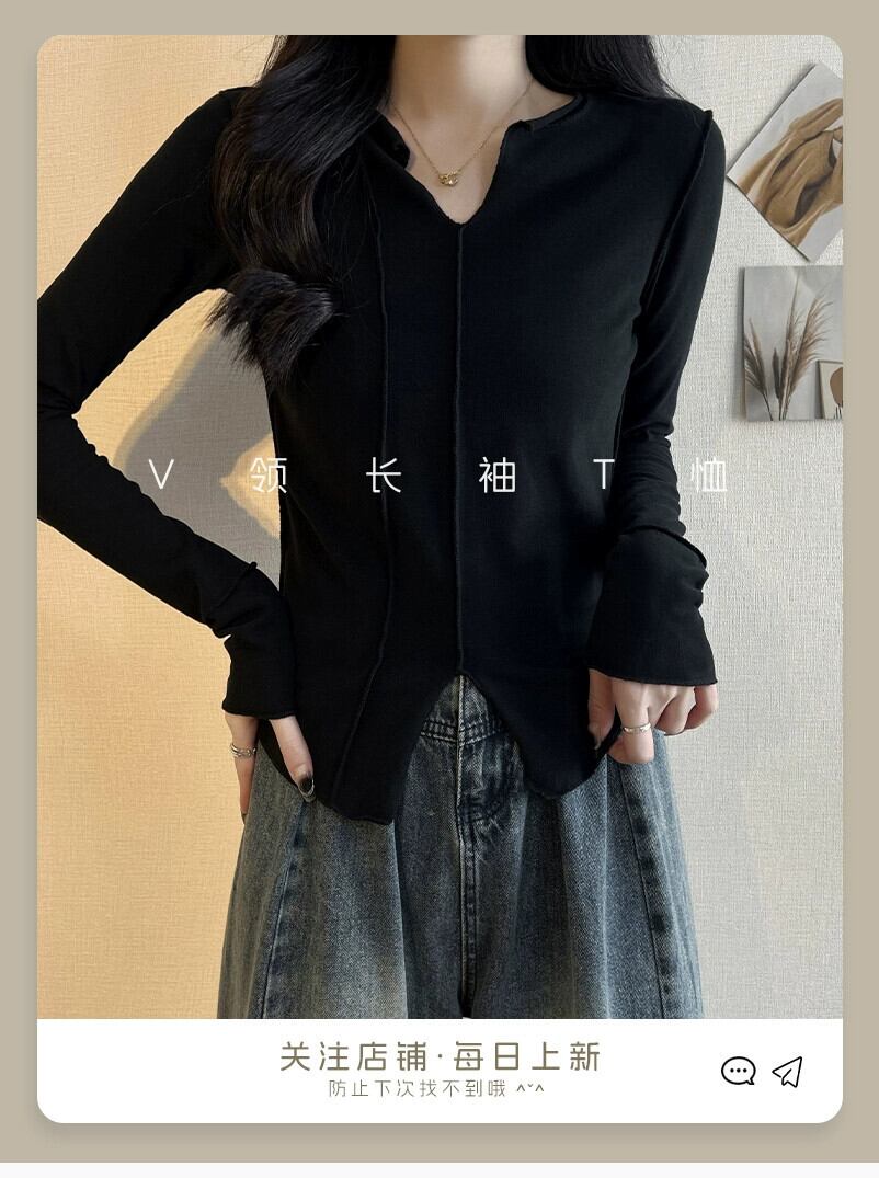黒長袖トップ女性 2024 春と秋の新デザインニッチシックなスリムフィットインナーコットン v ネック tシャツ ロング ブラック スプリング 春物 オータム 秋物 Vネック 7460015044935949 | framboise21