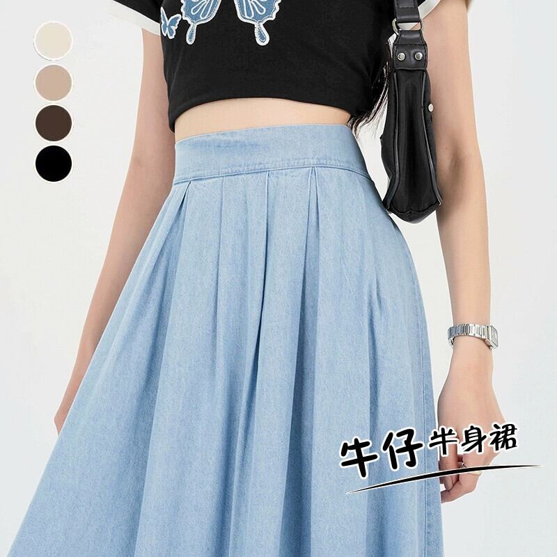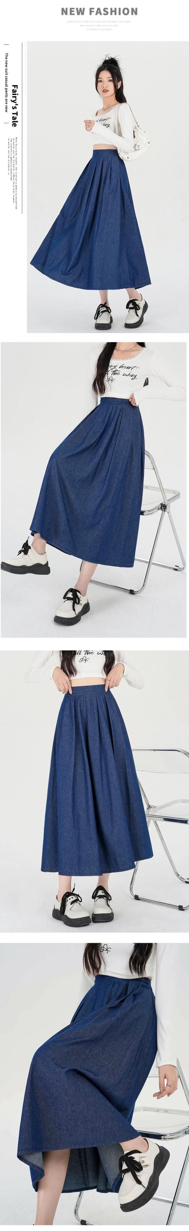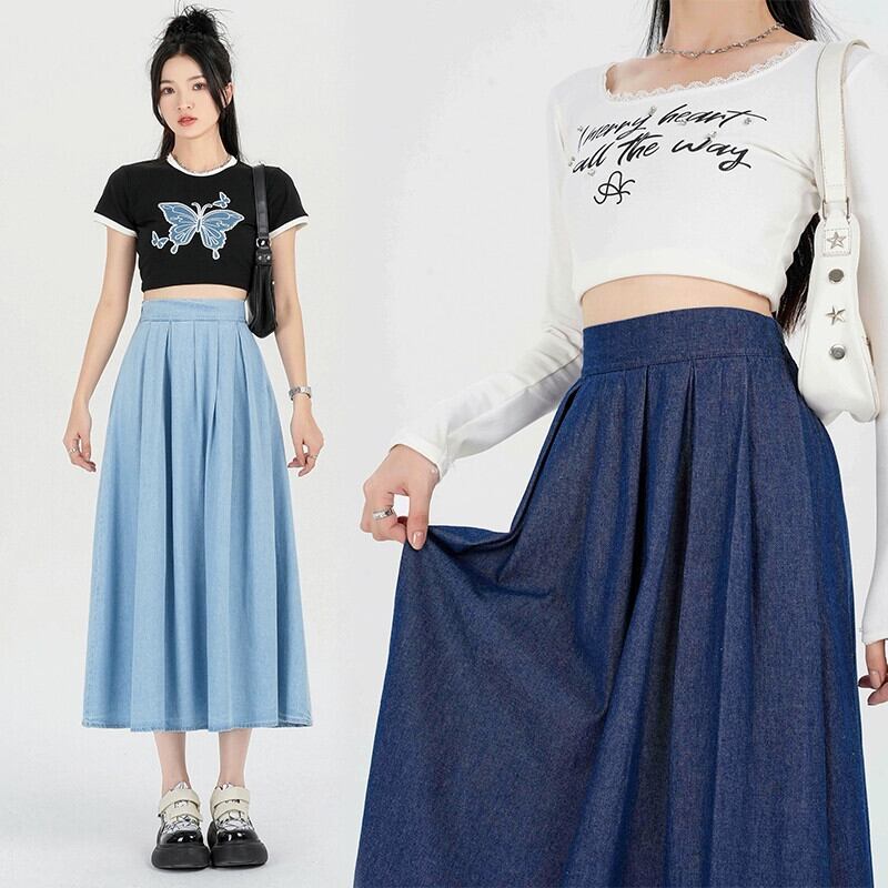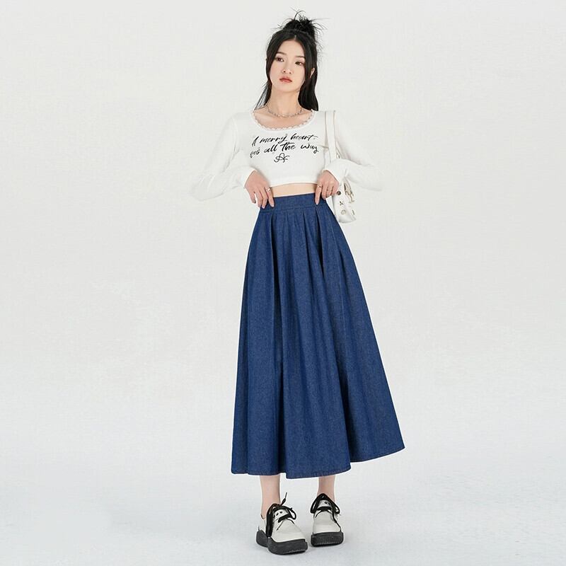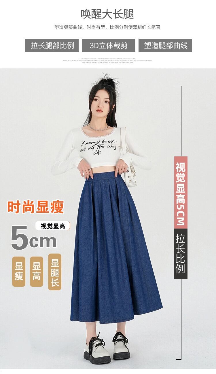 レトロブルー a ラインデニムスカート女性 2024 春と秋の新作ハイウエストスリムミッドレングスプリーツ大スイングアンブレラスカート スプリング 春物 オータム 秋物 Aライン 7460032560741979 | framboise21