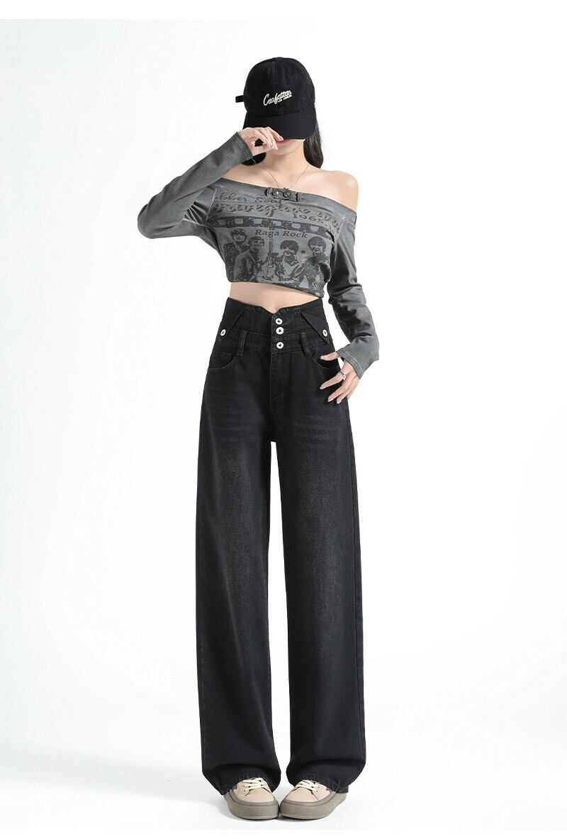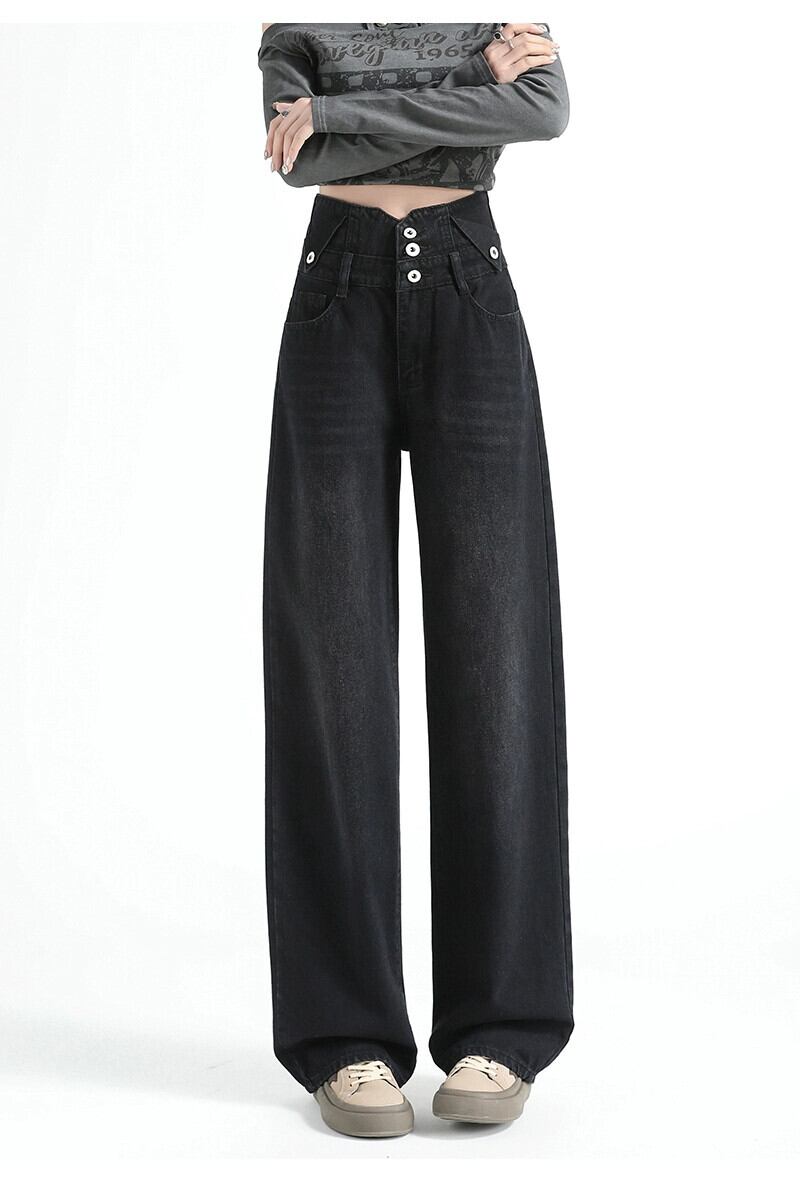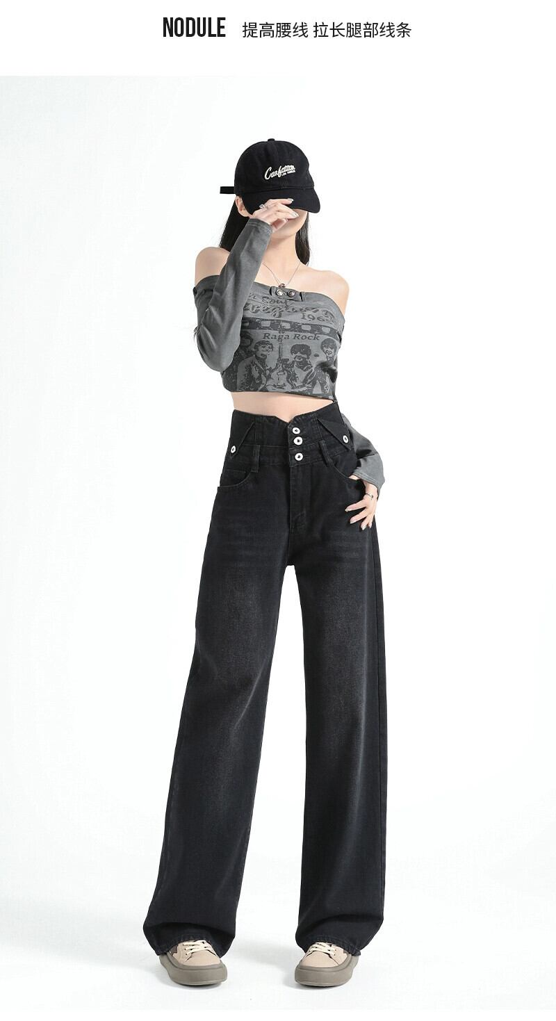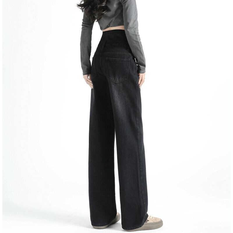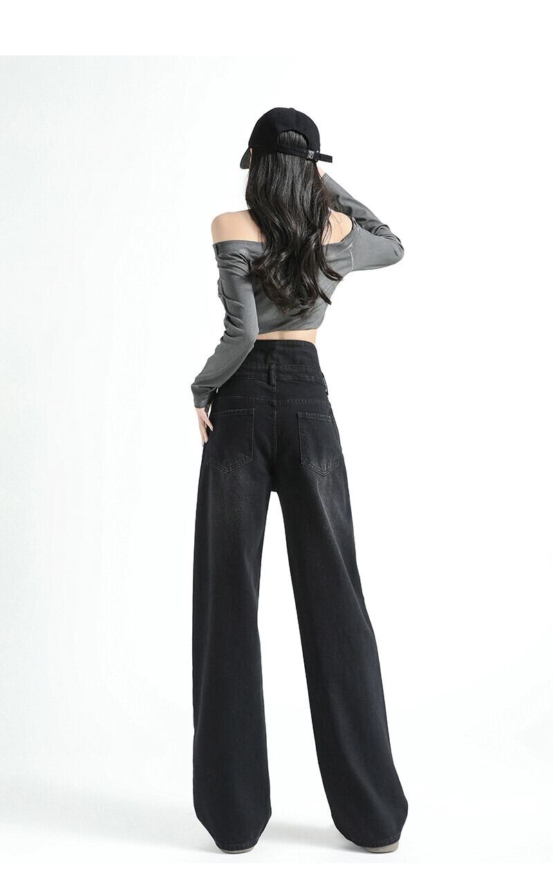 黒のワイドレッグジーンズの女性、春と秋のデザイン、ニッチ、ルーズ、ストレート、スリム、ドレープ、フロアレングスのハイウエストパンツ ブラック スプリング 春物 オータム 秋物 7460044108871314 | framboise21