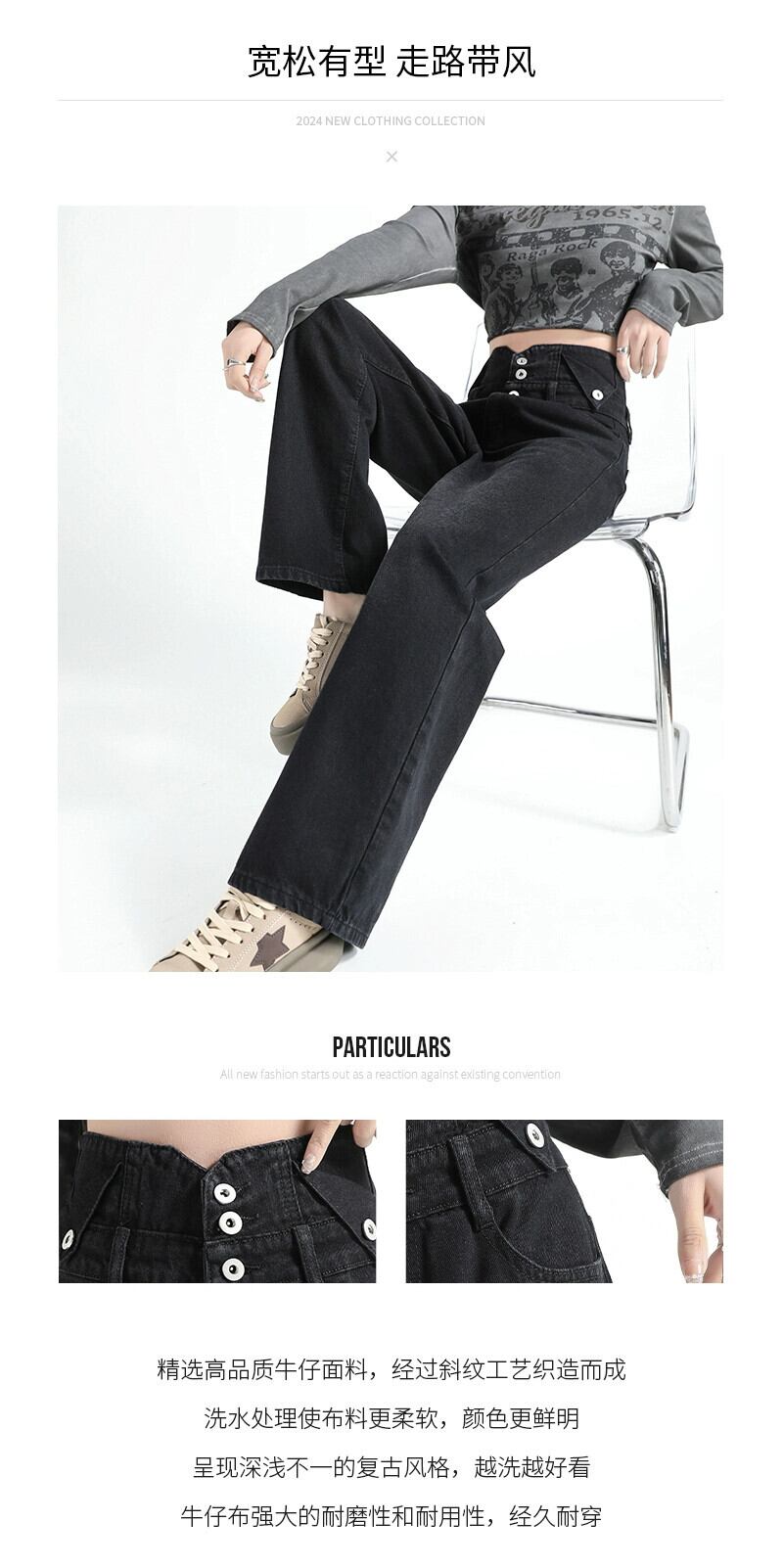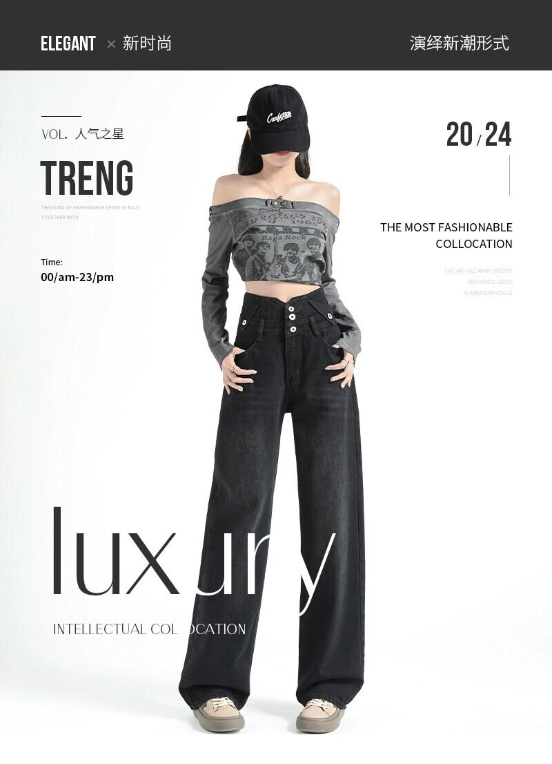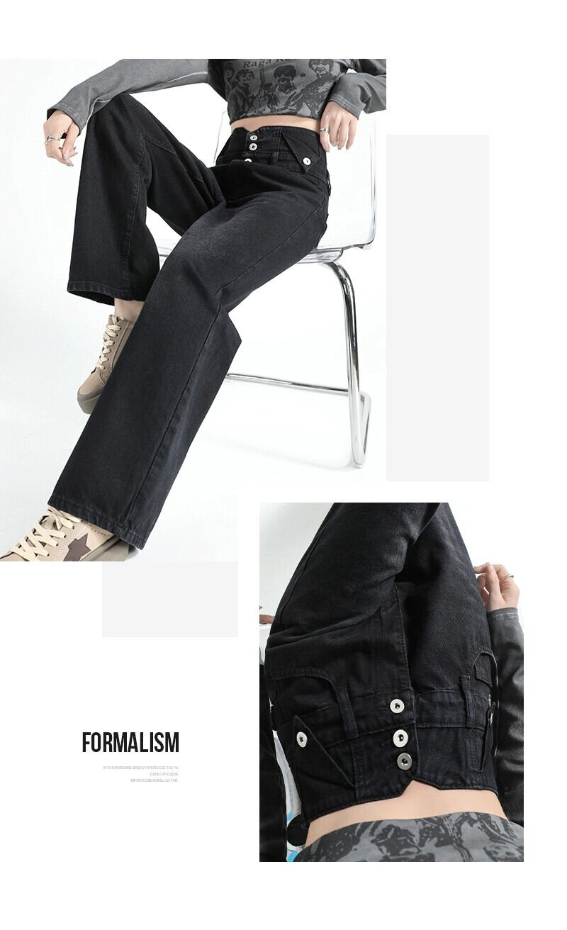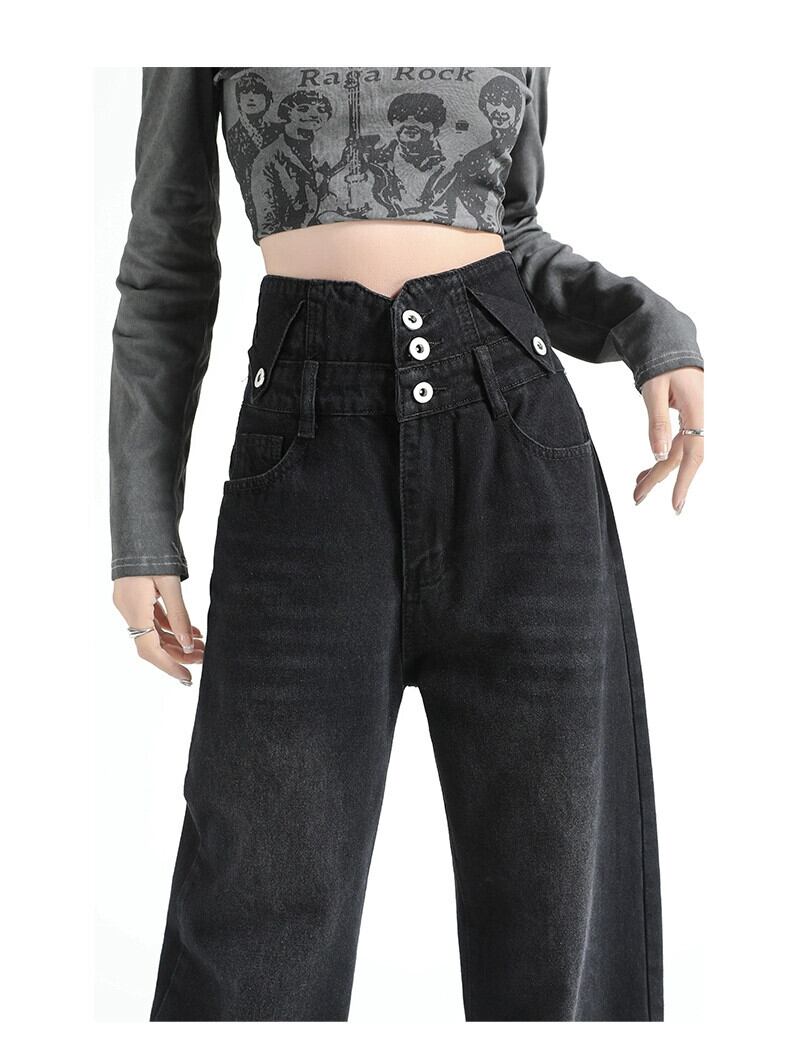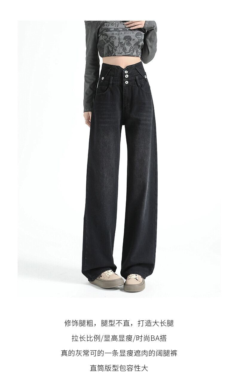黒のワイドレッグジーンズの女性、春と秋のデザイン、ニッチ、ルーズ、ストレート、スリム、ドレープ、フロアレングスのハイウエストパンツ ブラック スプリング 春物 オータム 秋物 7460044108871314 | framboise21