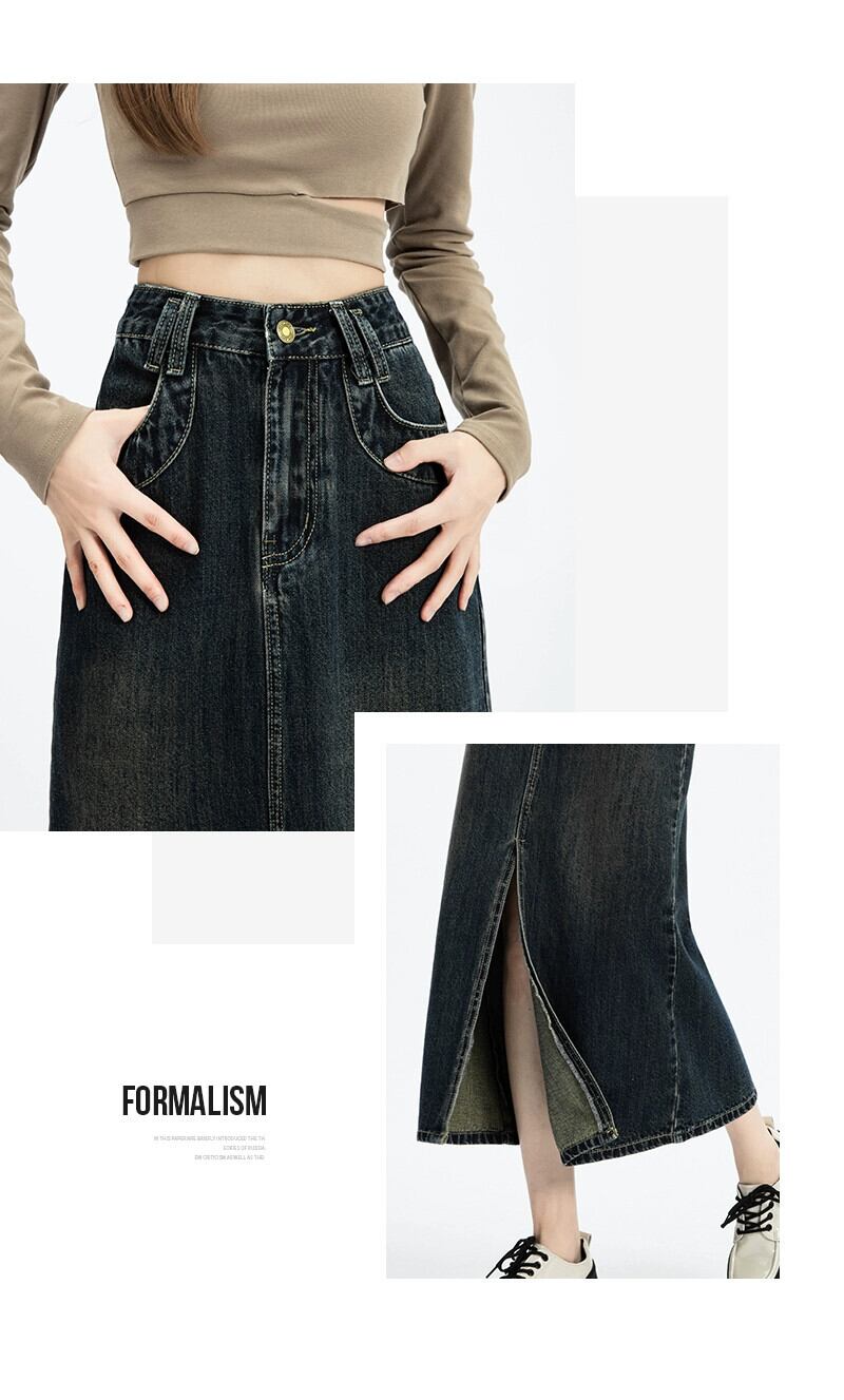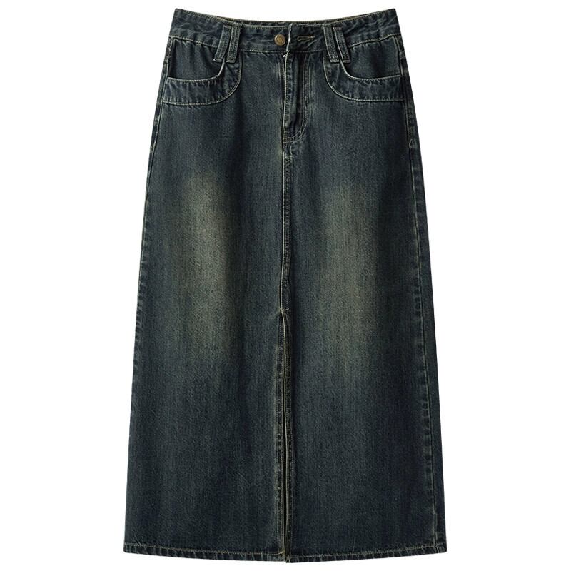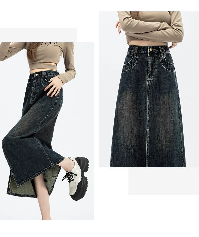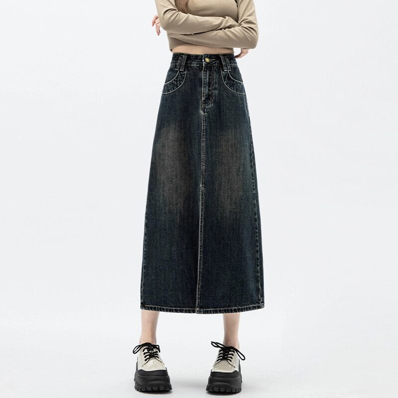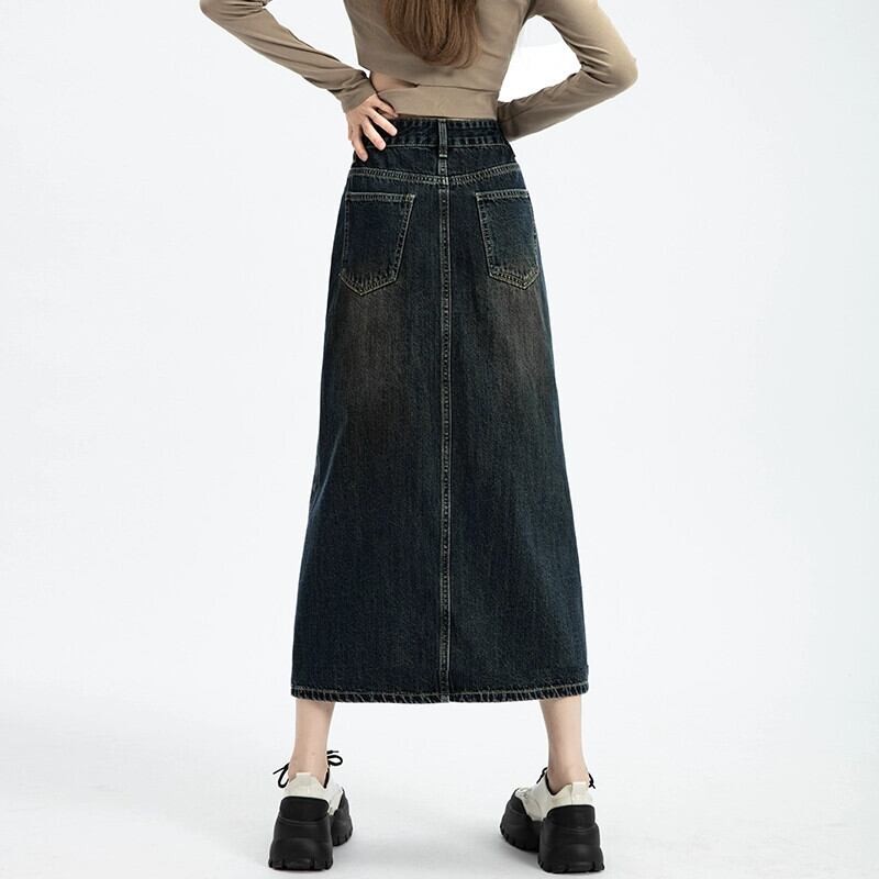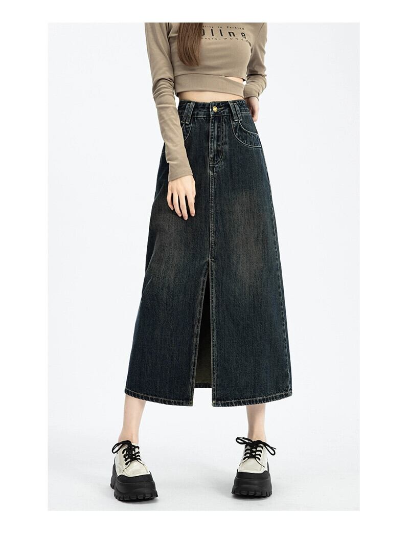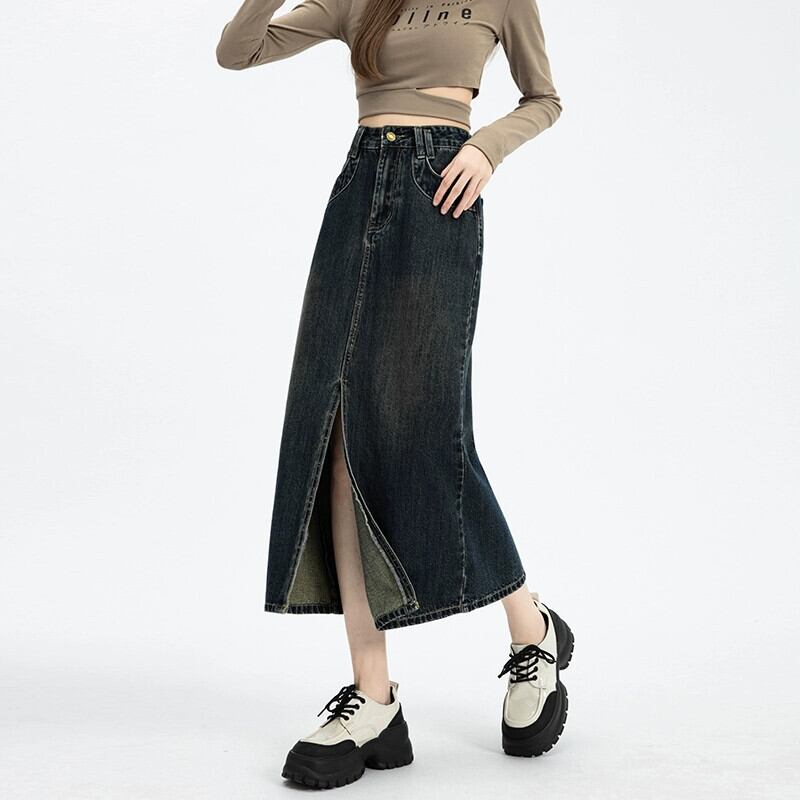 ダークブルーのスリットヒップカバースカートレディース、春と秋のスタイル、ヒップカバーと痩身Aラインハイウエストストレートミドル丈デニムスカート スプリング 春物 オータム 秋物 7460030652038311 | framboise21