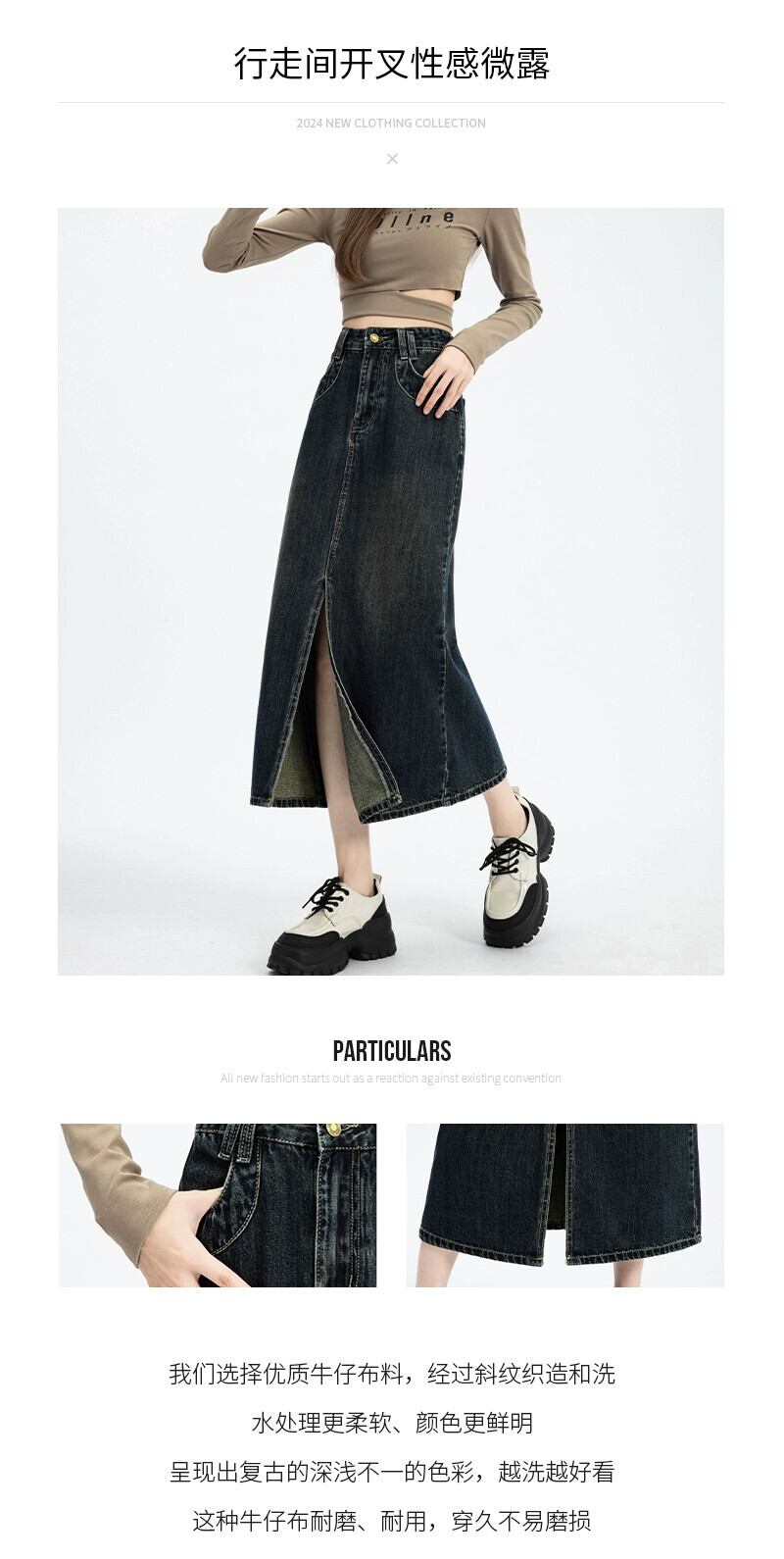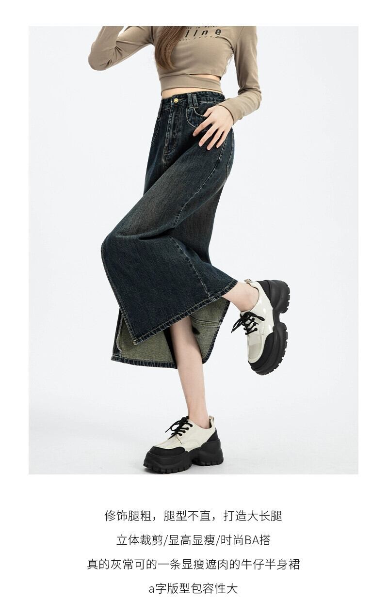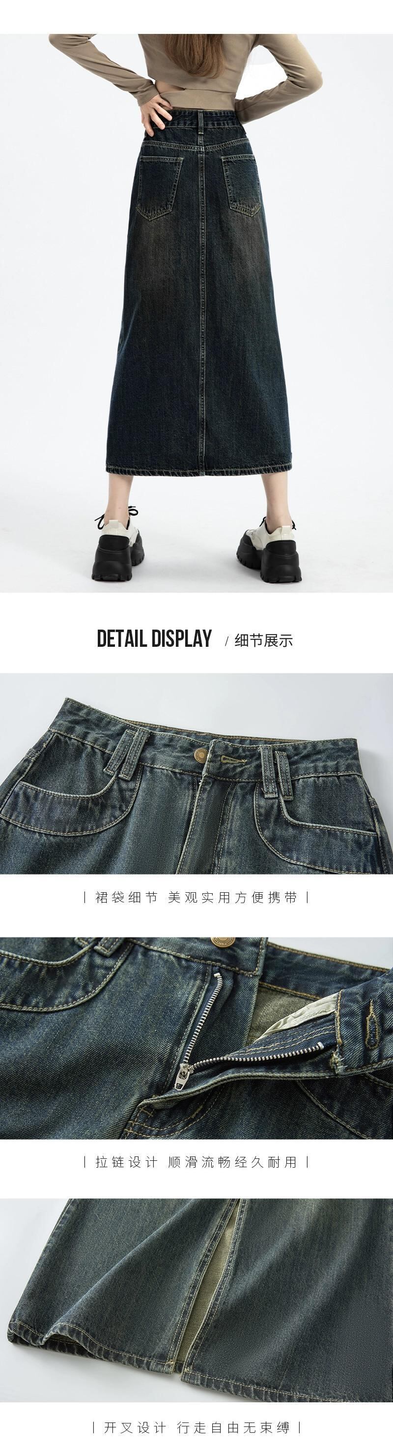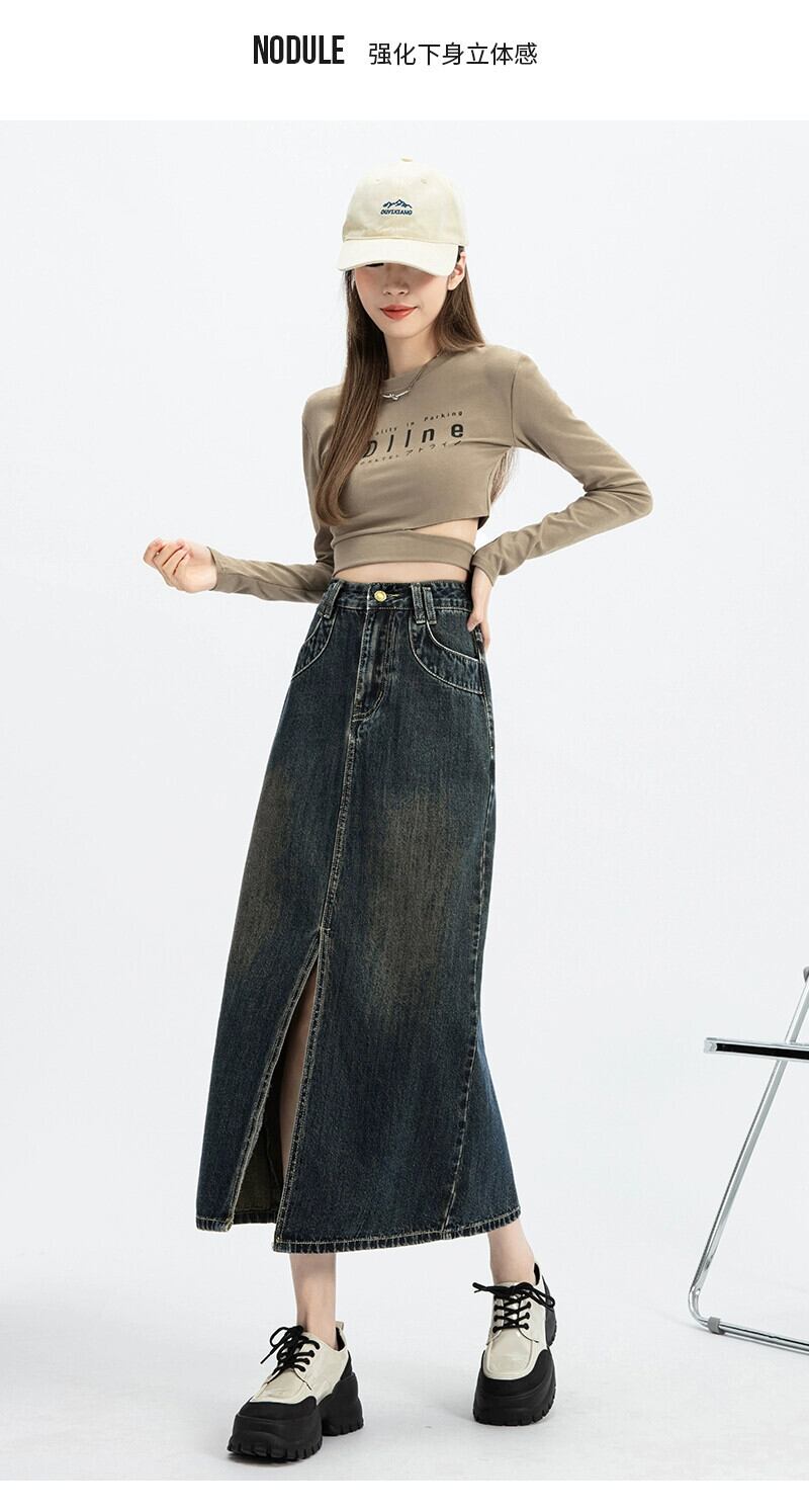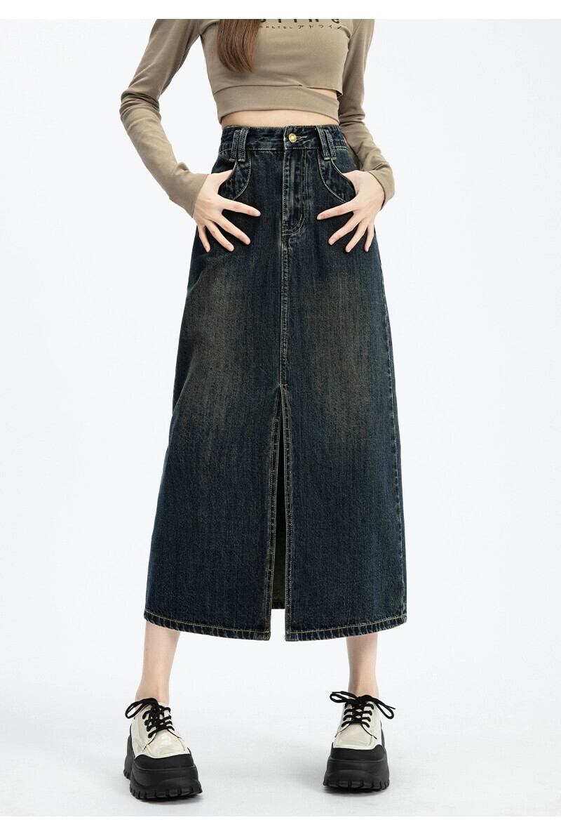 ダークブルーのスリットヒップカバースカートレディース、春と秋のスタイル、ヒップカバーと痩身Aラインハイウエストストレートミドル丈デニムスカート スプリング 春物 オータム 秋物 7460030652038311 | framboise21