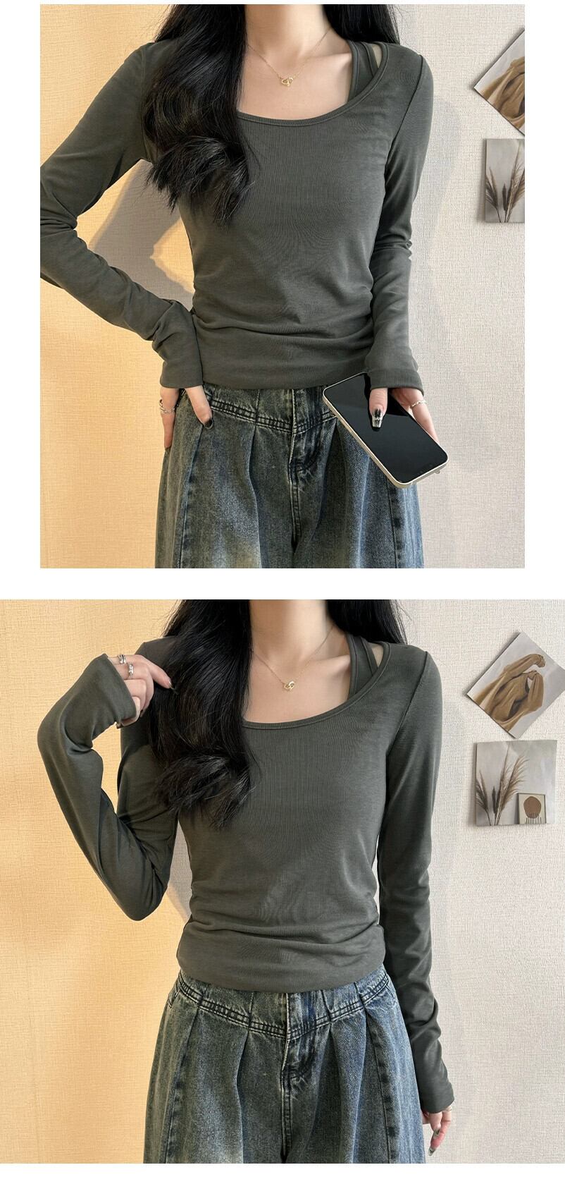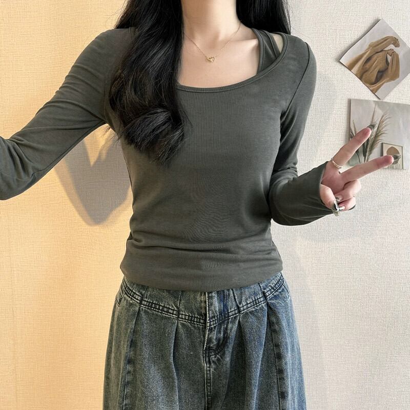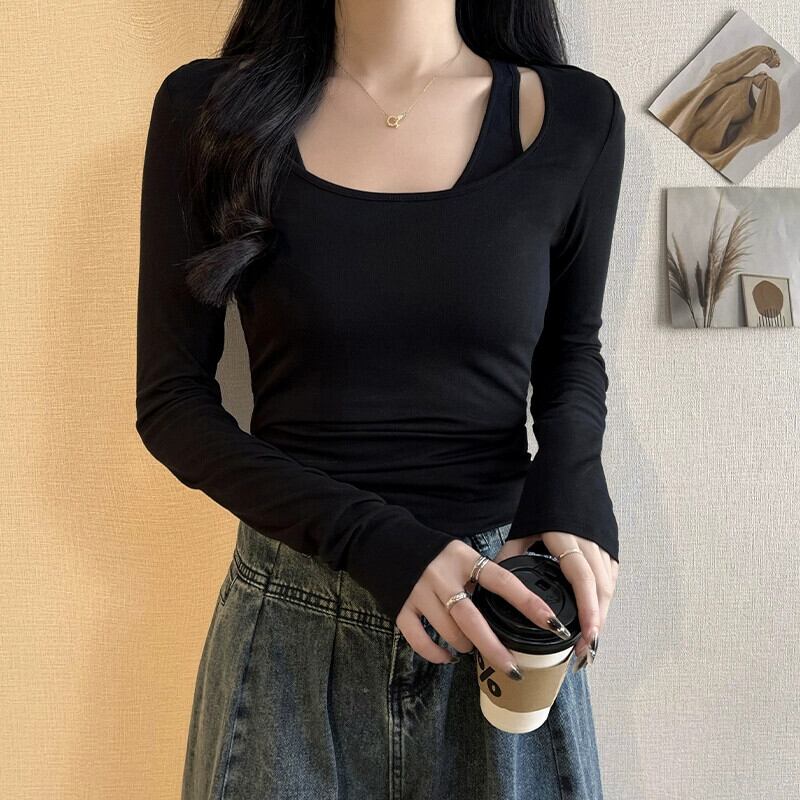 右肩長袖ボトリング tシャツ女性春のファッションデザインスリムフィットインナーショートホルターネックローカラー鎖骨トップ ロング スプリング 春物 7460010042788688 | framboise21