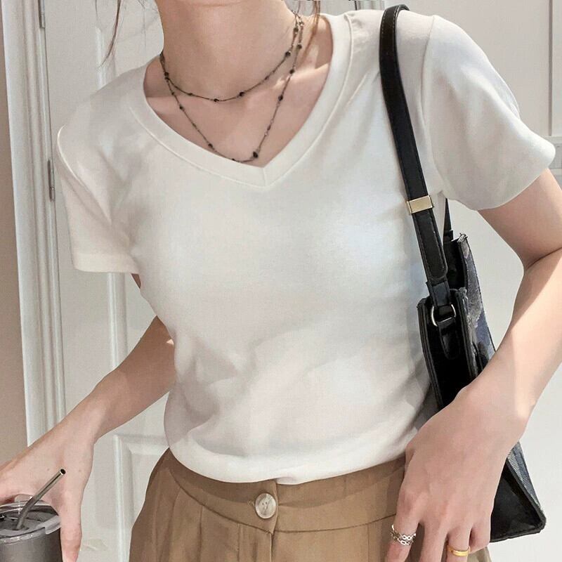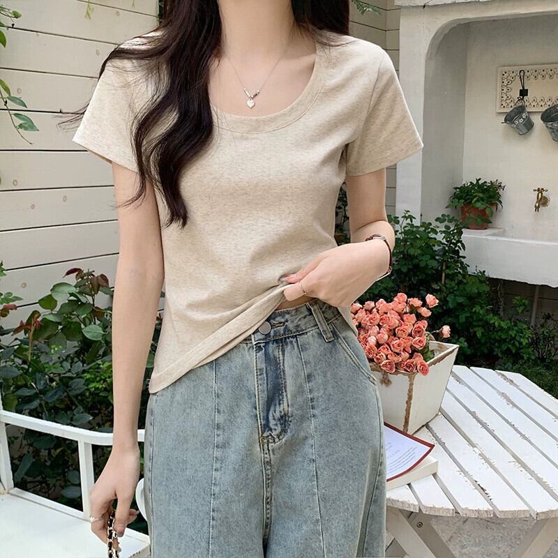 純綿右肩半袖 Tシャツ女性 2024 新しい夏のスリムでファッショナブルなスタイル露出鎖骨ローネックショートトップ コットン サマー 夏物 7460025916109134 | framboise21