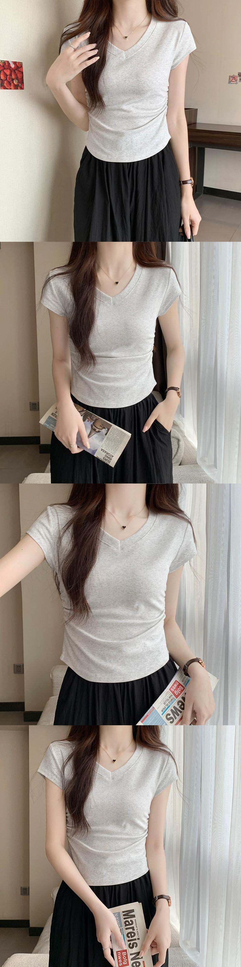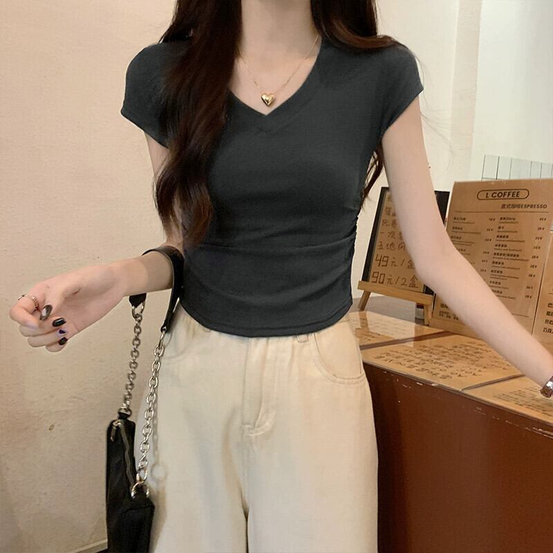 カーブした裾の純綿半袖 T シャツの女性、夏のファッション、白のユニークでシックな不規則なショート V ネック トップ ホワイト コットン サマー 夏物 Vネック Tシャツ ピュア 7460064958853151 | framboise21
