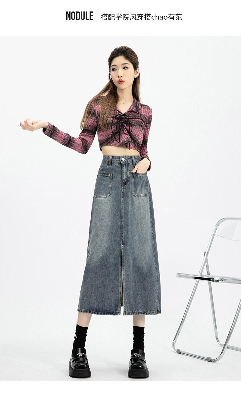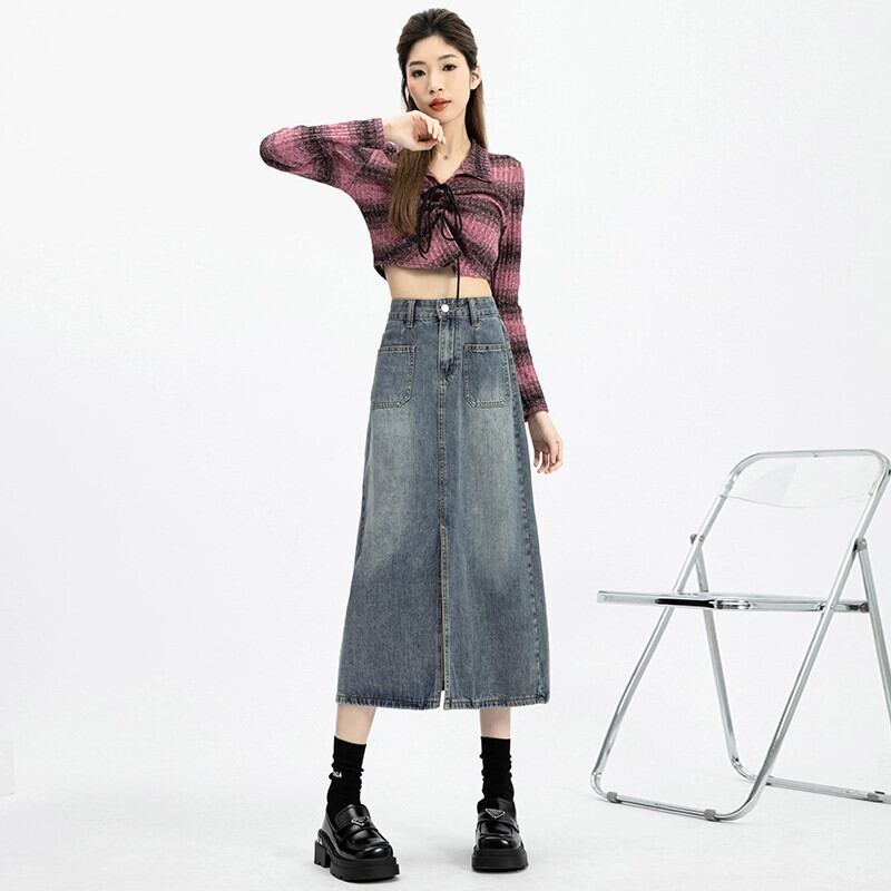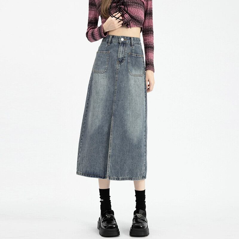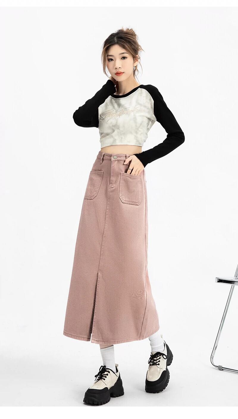 ピンクのハイウエストデニムスカート女性春と秋 2024 新しいハイウエスト痩身 a ラインミッドレングススリットヒップスカート スプリング 春物 オータム 秋物 Aライン 7460017000258013 | framboise21