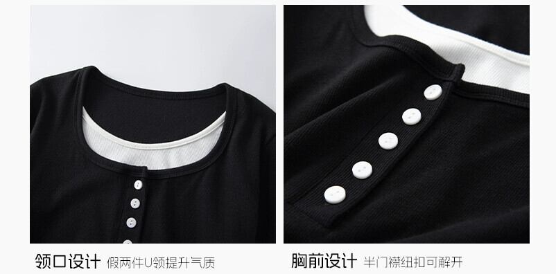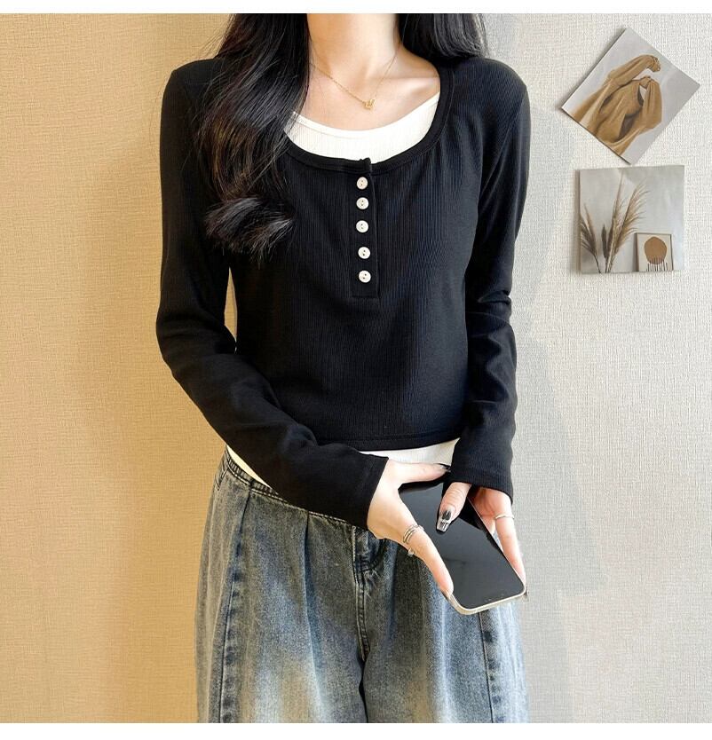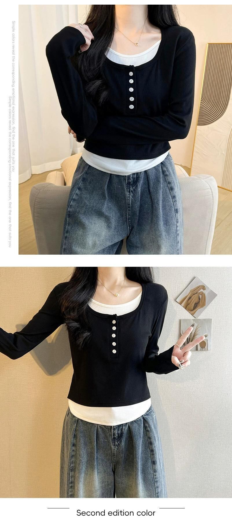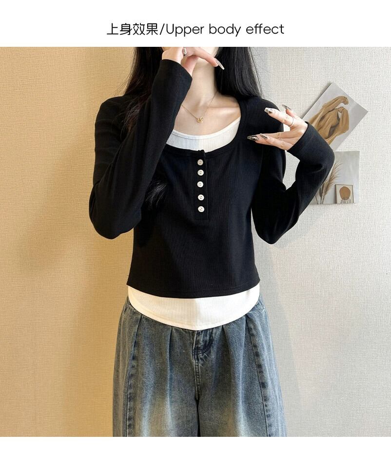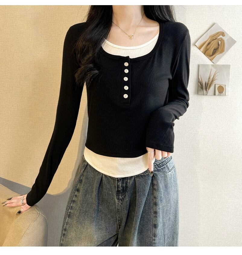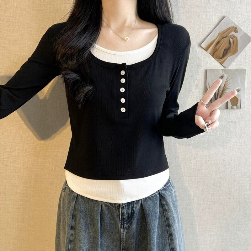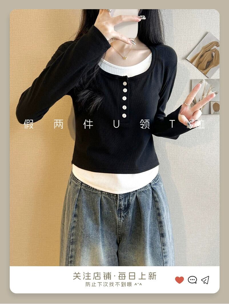 フェイクツーピーススプライス長袖Tシャツレディース、春デザイン、小さいスリムフィット、不規則なショートトップ小柄な人 ロング スプリング 春物 7460033363658226 | framboise21