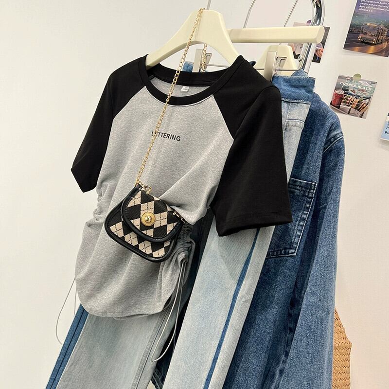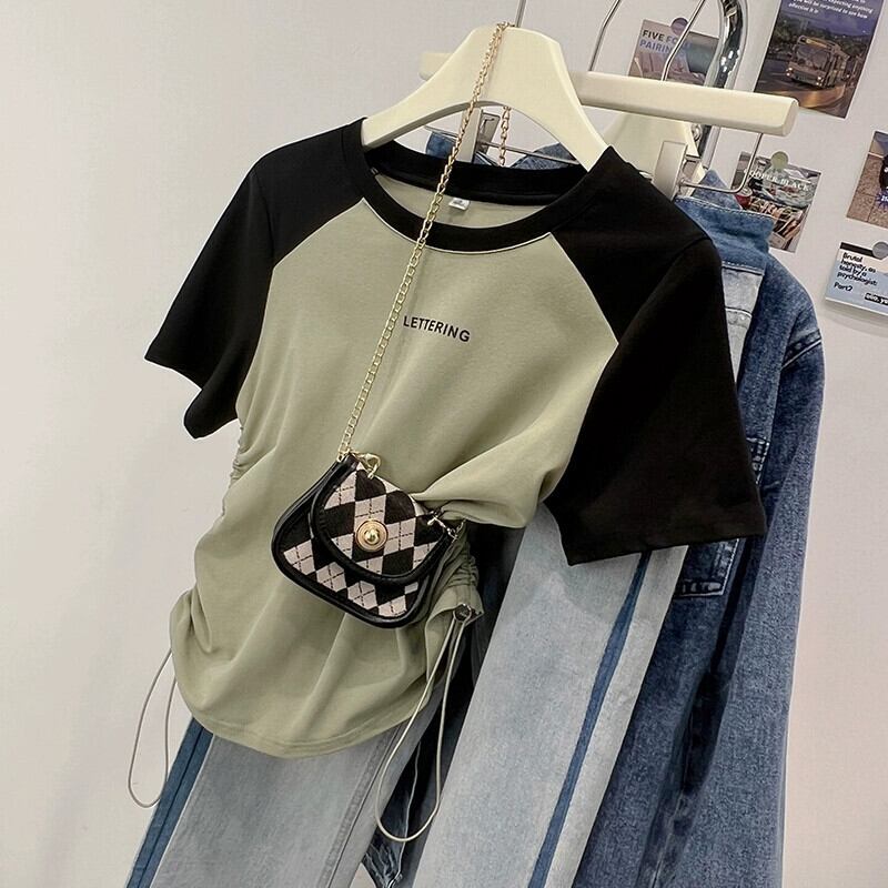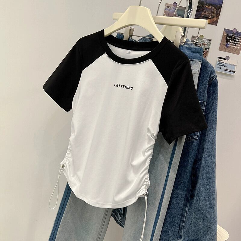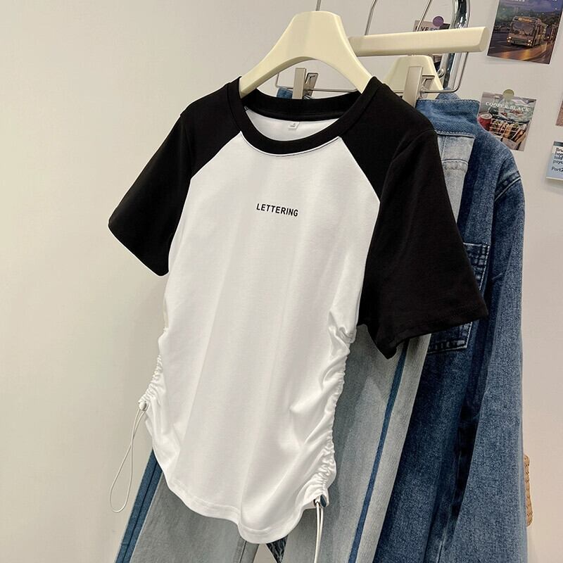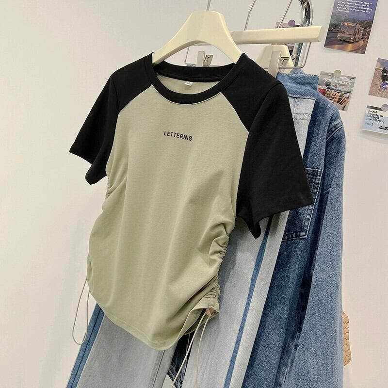 レトロなスリムフィット不規則なプリーツのラウンドネックトップトレンディな夏のアメリカンコットンラグラン半袖Tシャツレディース サマー 夏物 Oネック 7460080291590046 | framboise21