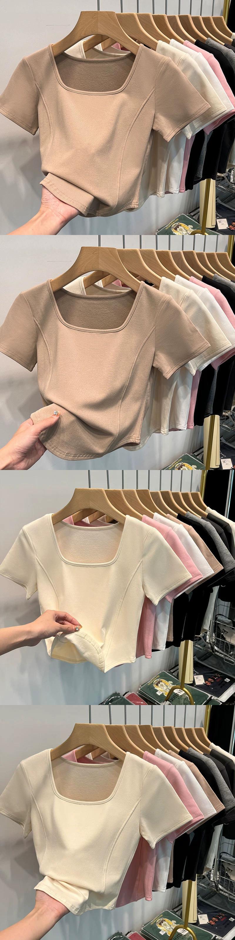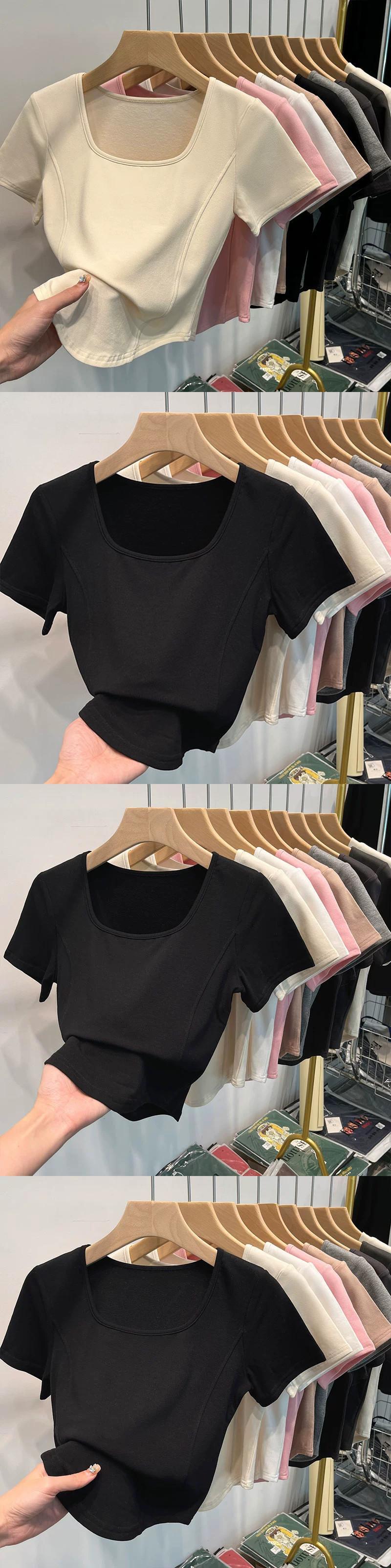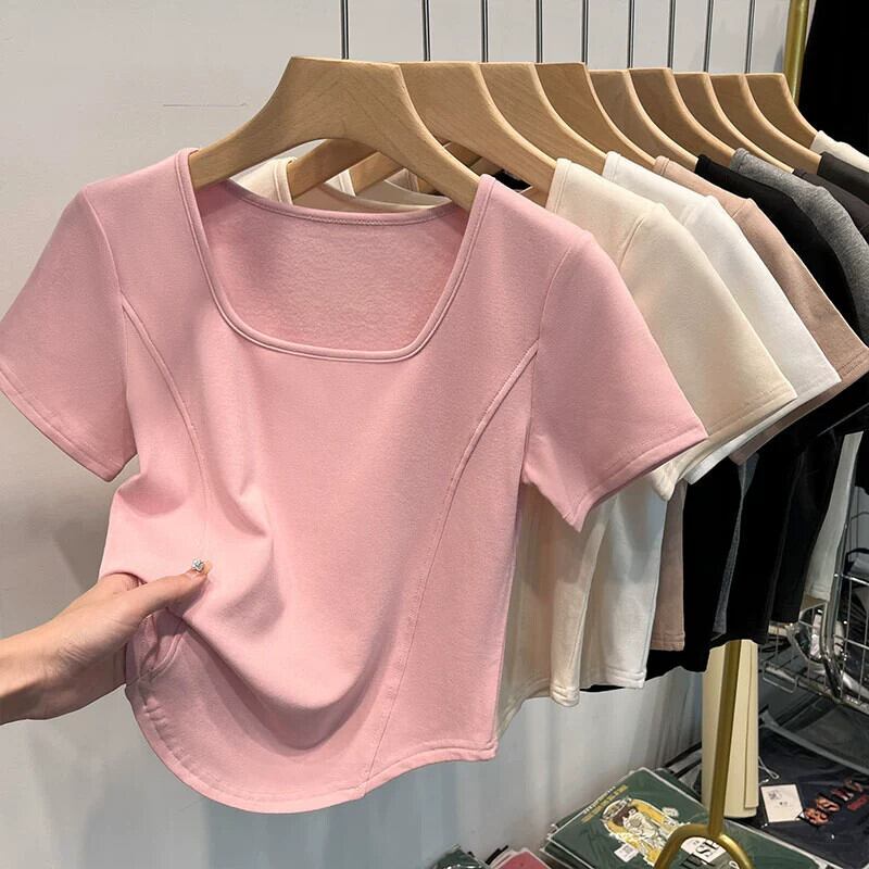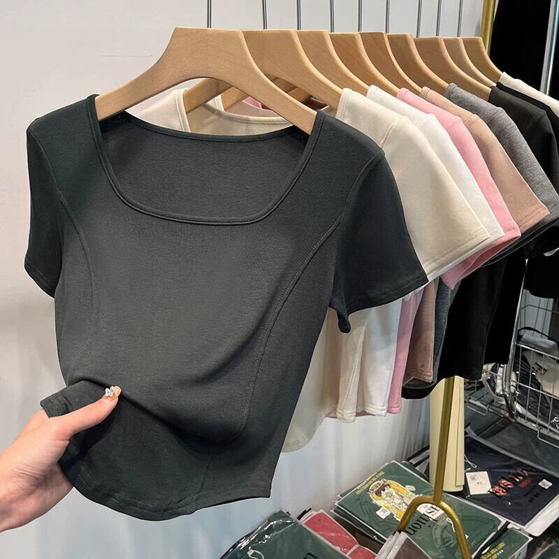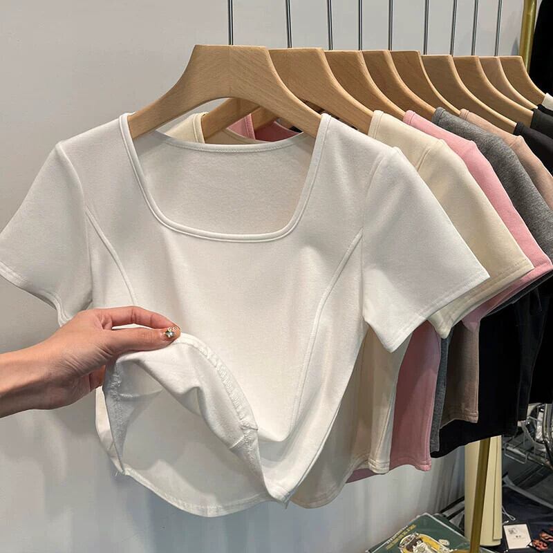 イレギュラーショルダー半袖Tシャツレディース、夏デザイン、スリムでファッショナブル、鎖骨見せ、スクエアカラー、フィッシュボーンショートトップ サマー 夏物 スクウェア 7460040615020997 | framboise21