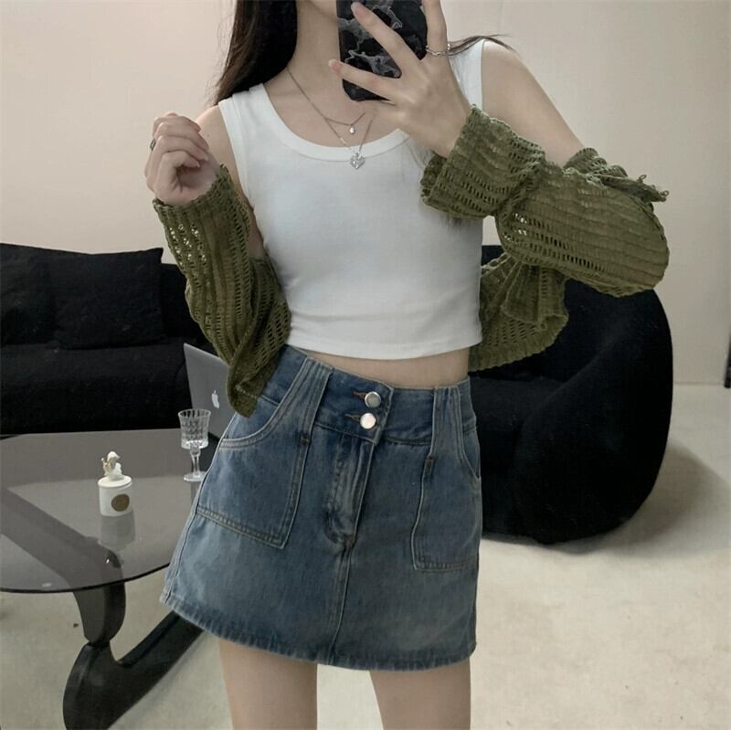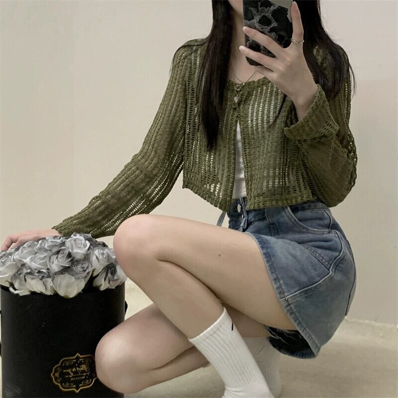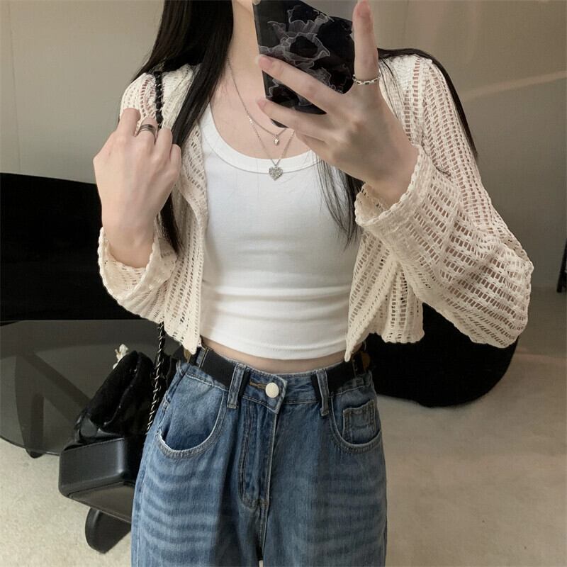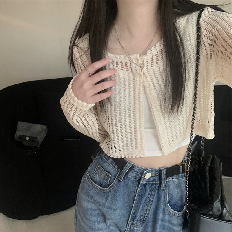 アプリコット中空日焼け止めカーディガン女性夏の薄いルーズ万能サスペンダー着用ハイウエストショートニットブラウストレンディ ハイウェスト サマー 夏物 7460097192806729 | framboise21