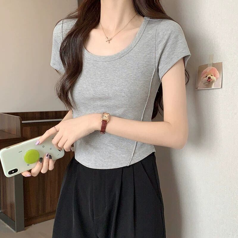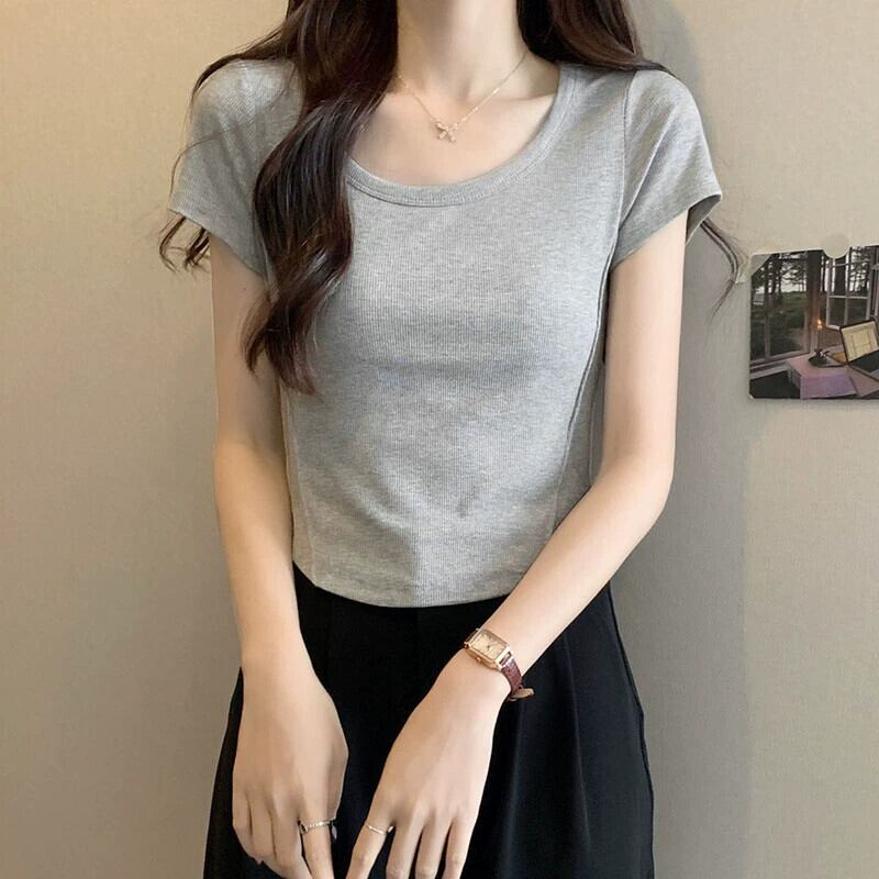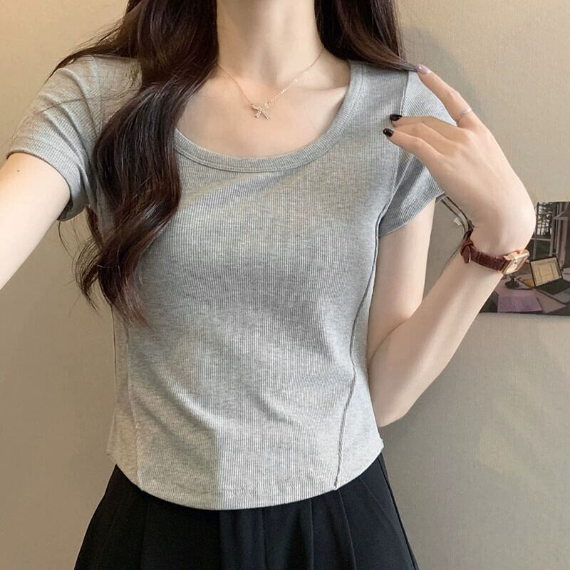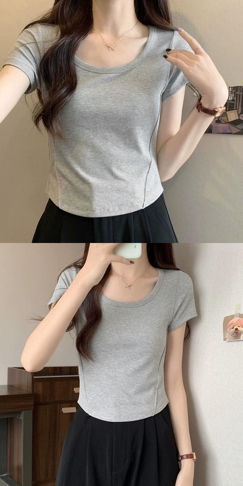 グレーの右肩半袖 T シャツの女性、夏のデザイン、スリム フィット、不規則なフィッシュボーン ショート トップ、トレンディな サマー 夏物 Tシャツ 7460069633118151 | framboise21