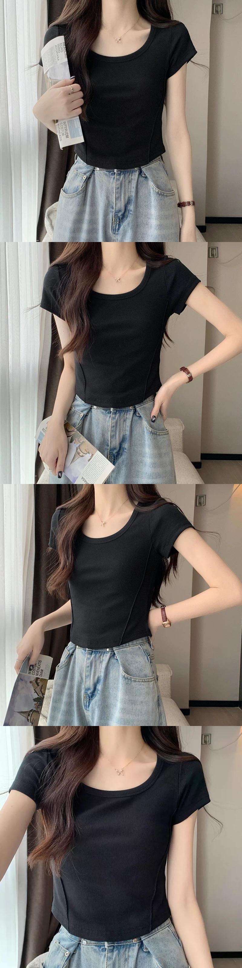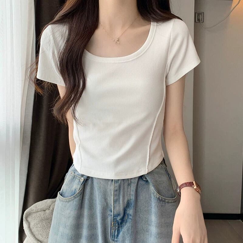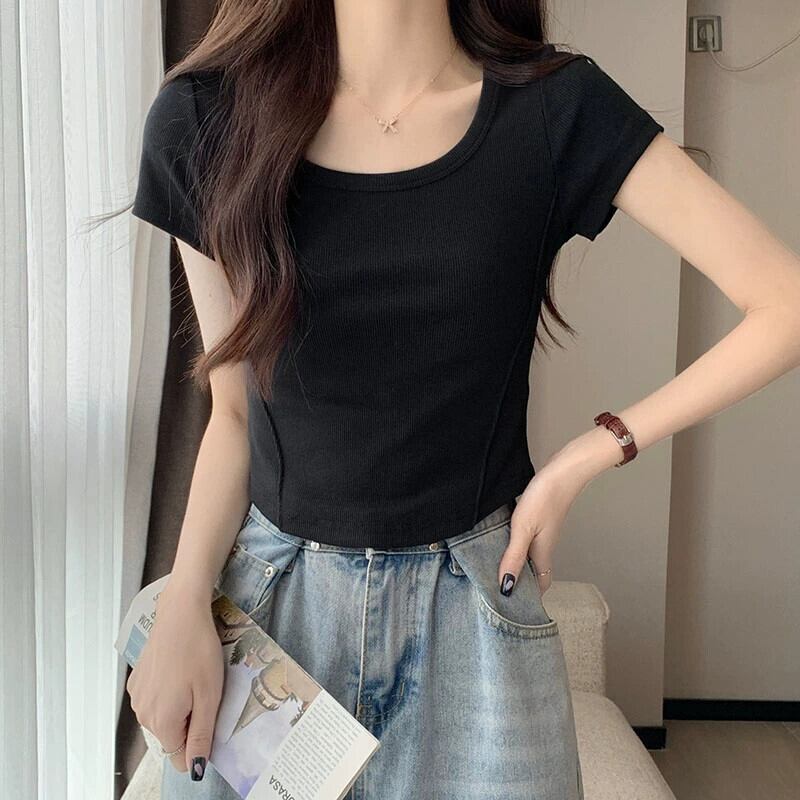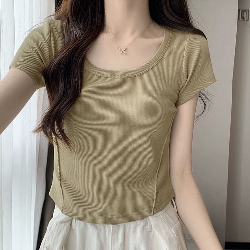 グレーの右肩半袖 T シャツの女性、夏のデザイン、スリム フィット、不規則なフィッシュボーン ショート トップ、トレンディな サマー 夏物 Tシャツ 7460069633118151 | framboise21