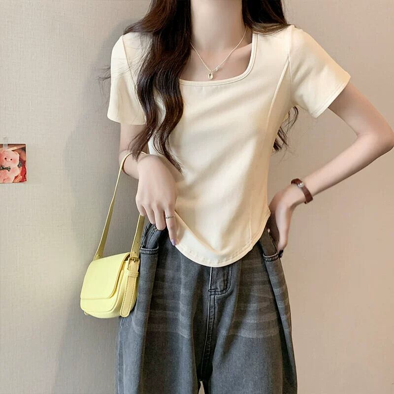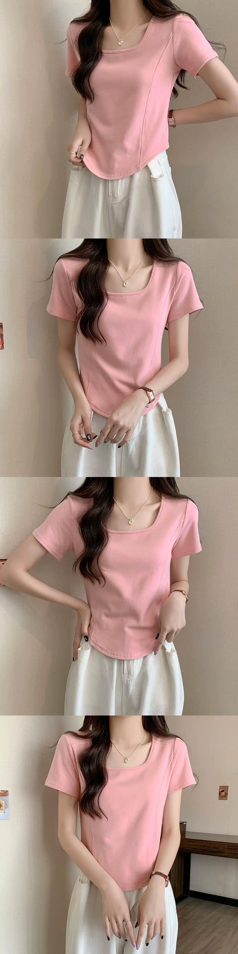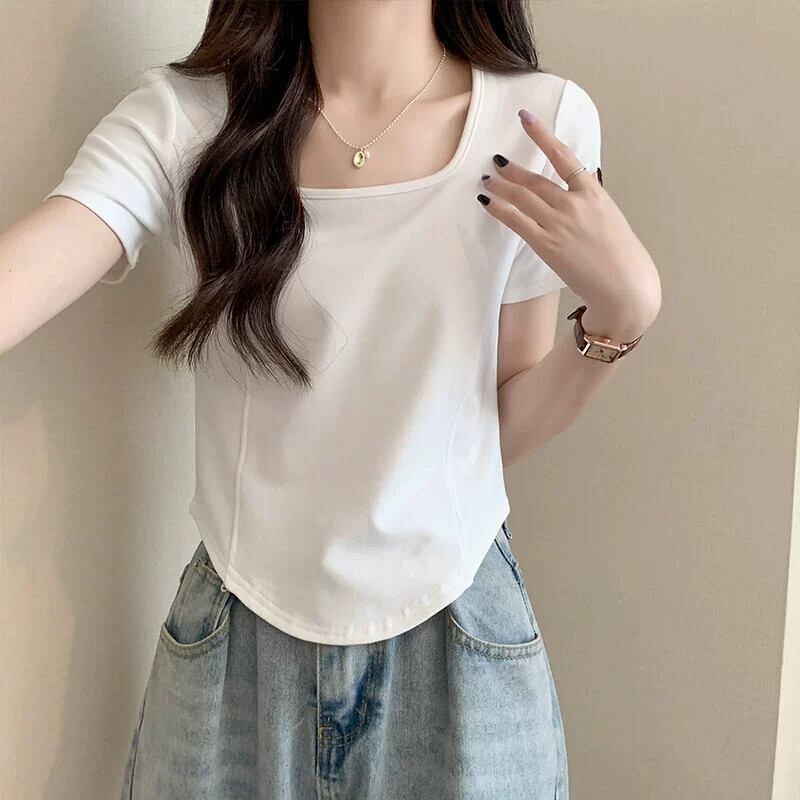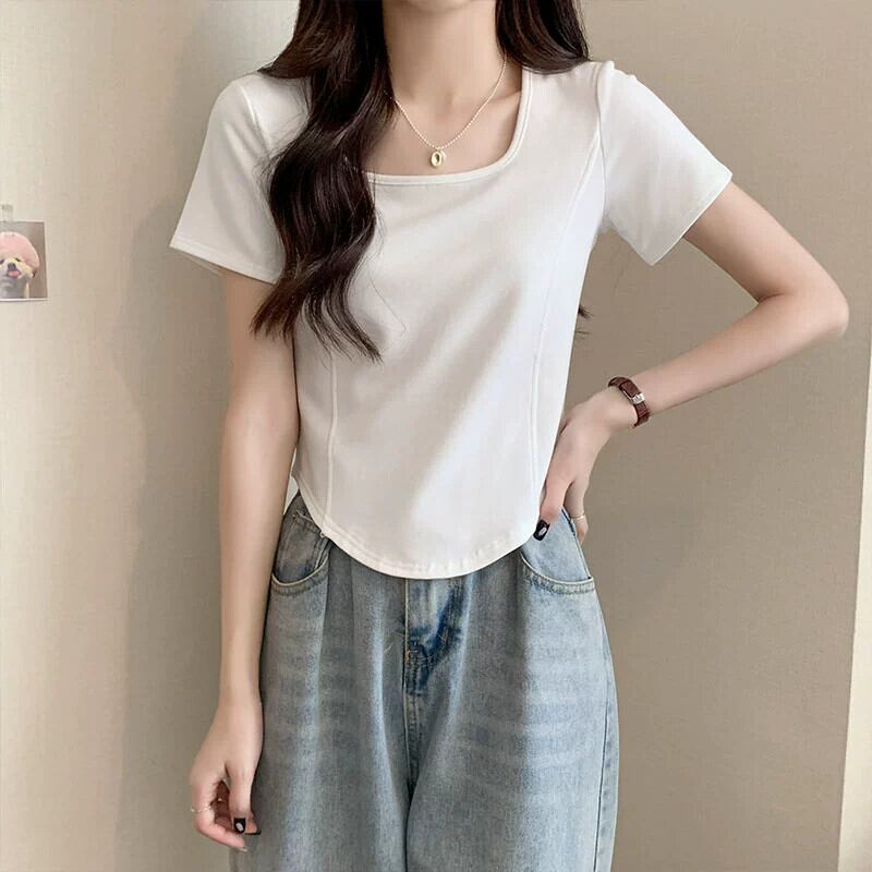 夏の不規則な肩の半袖Tシャツの女性、スリムフィット、ユニークなカーブした裾、スクエアネックのフィッシュボーンショートトップ サマー 夏物 スクウェア 7460061719776065 | framboise21