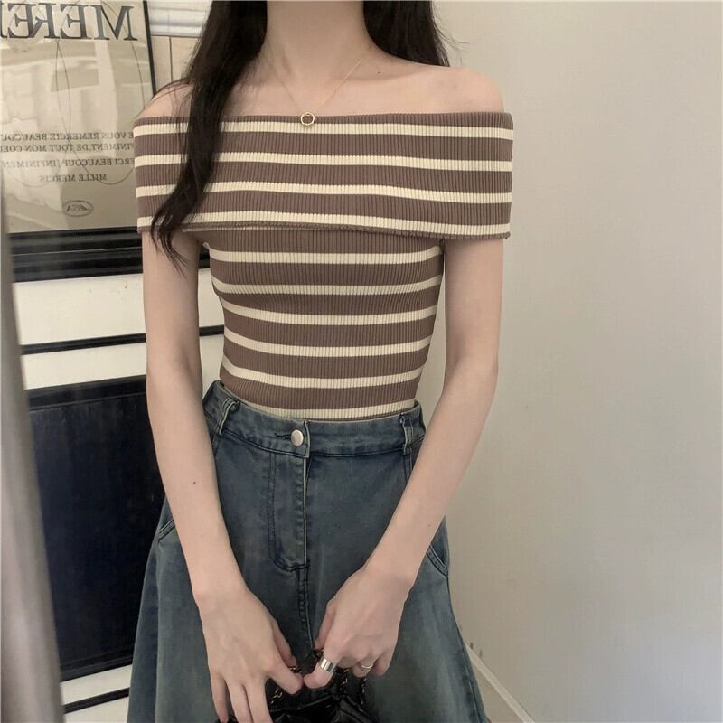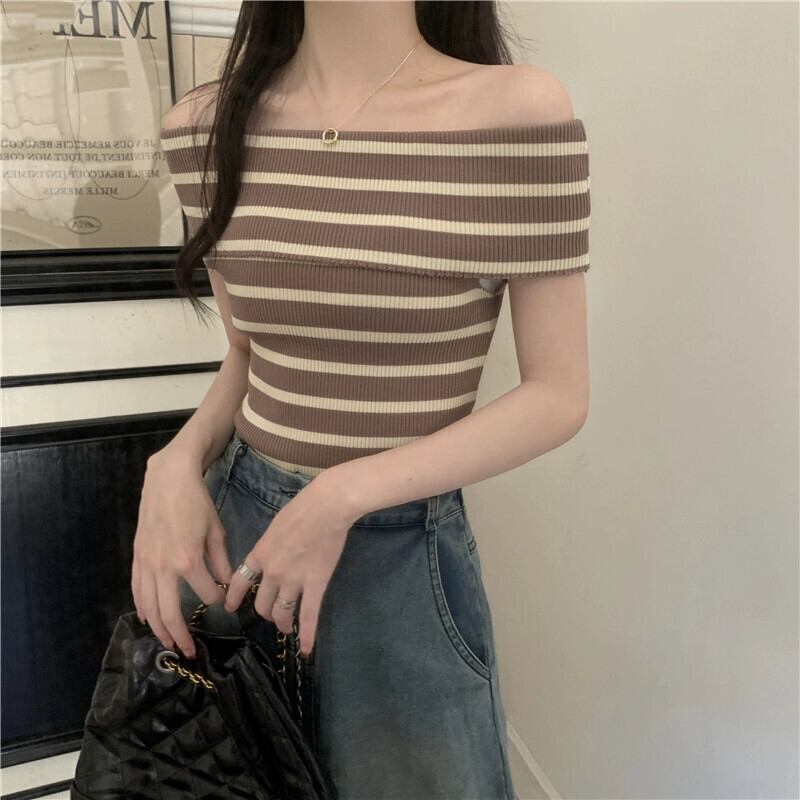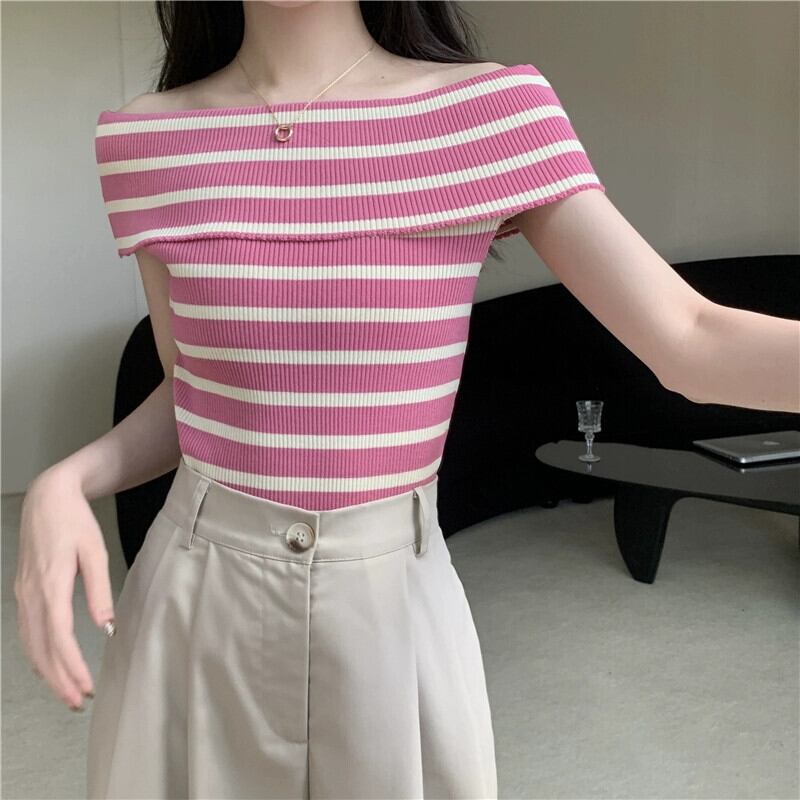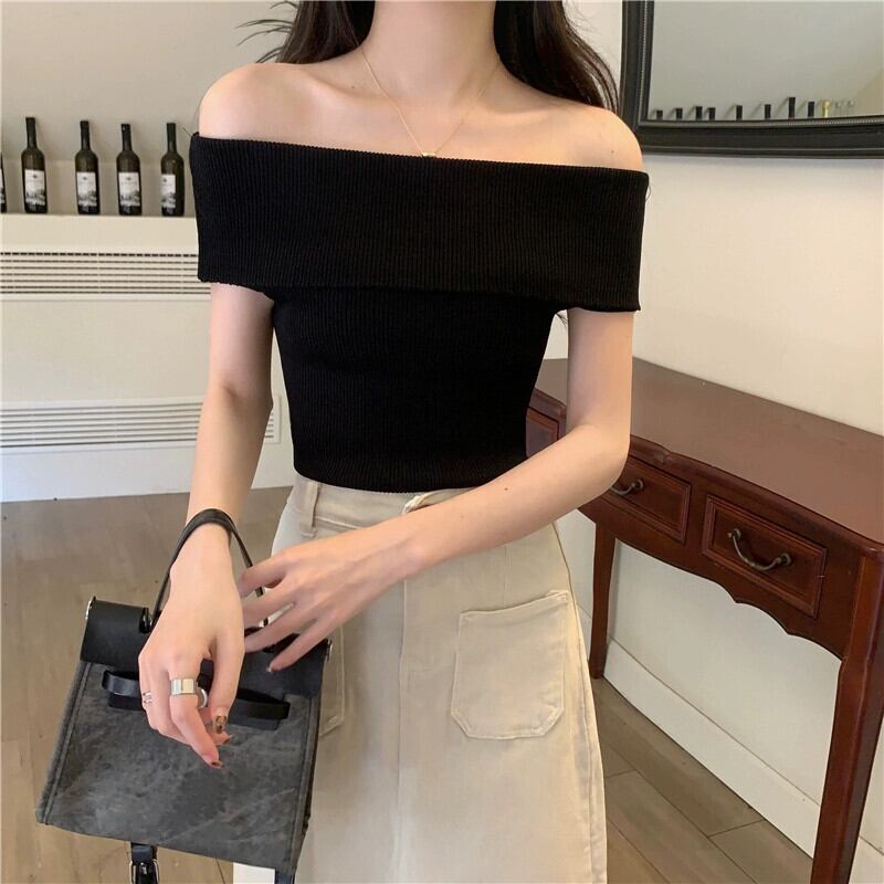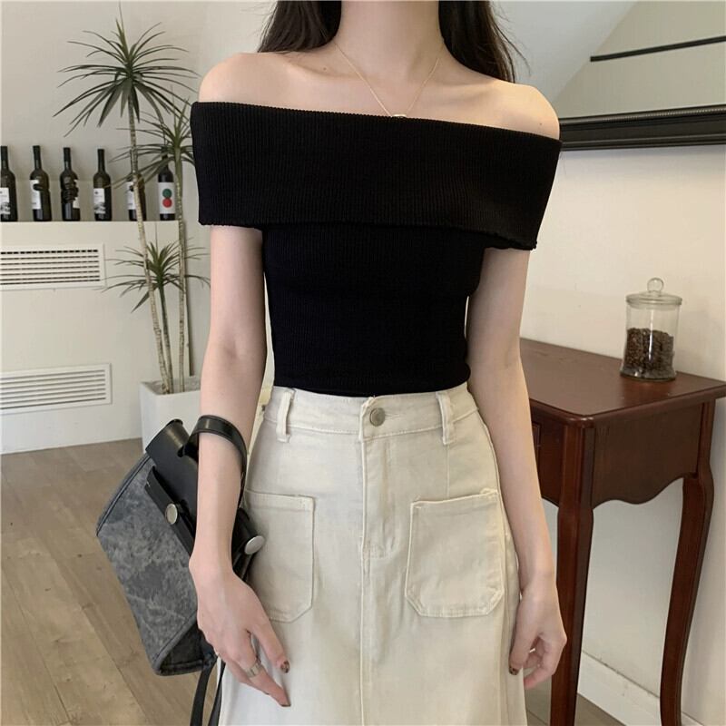 夏の黒のワンショルダー半袖 T シャツの女性、スリムでファッショナブルでシックなオフショルダー ショート ニット トップ ピンク ブラック サマー 夏物 Tシャツ 7460085520283514 | framboise21