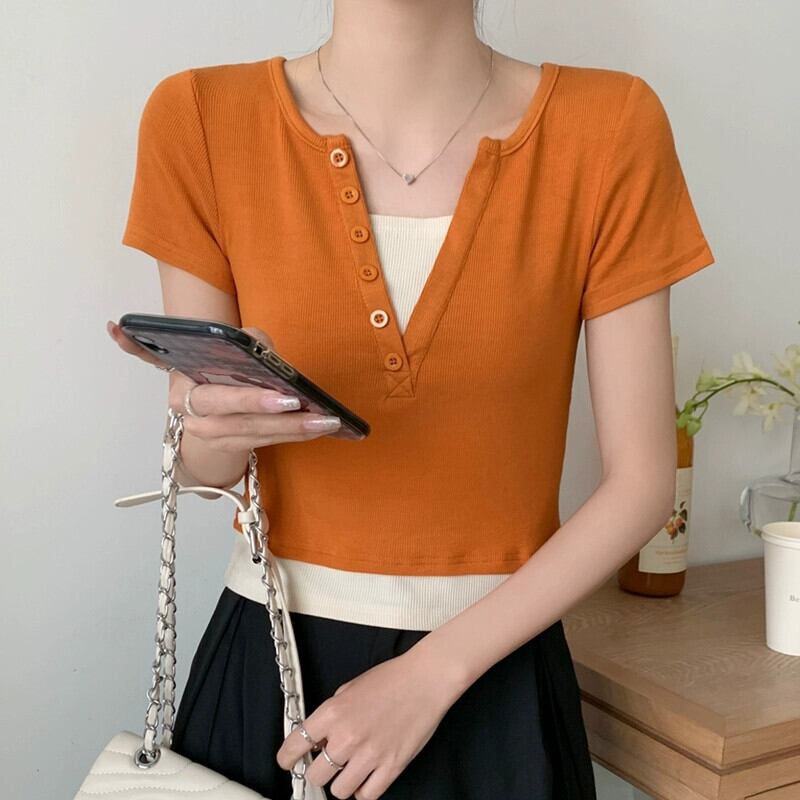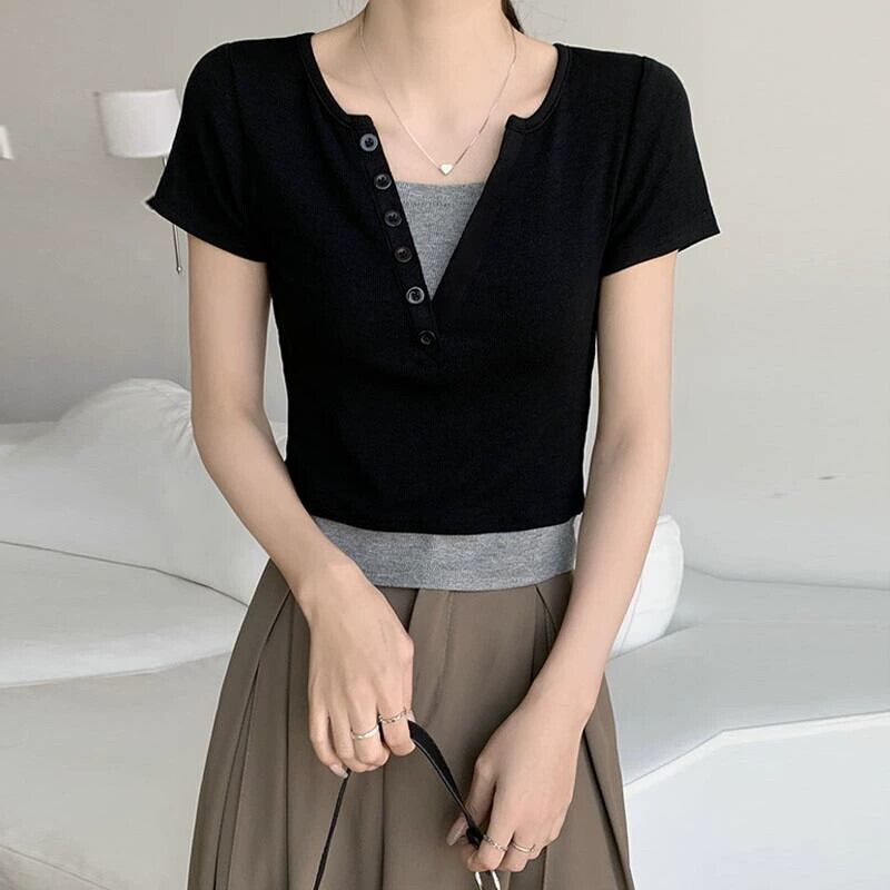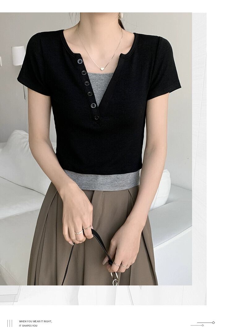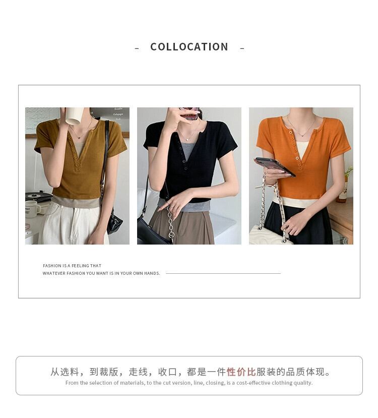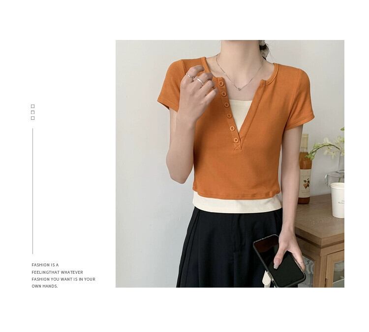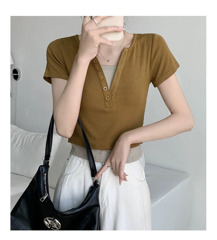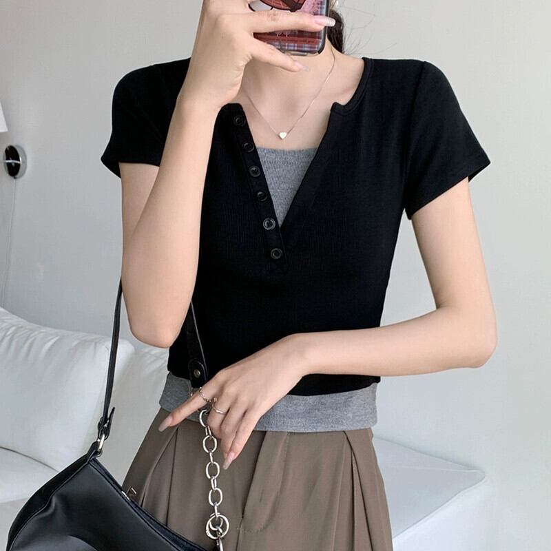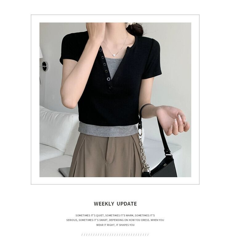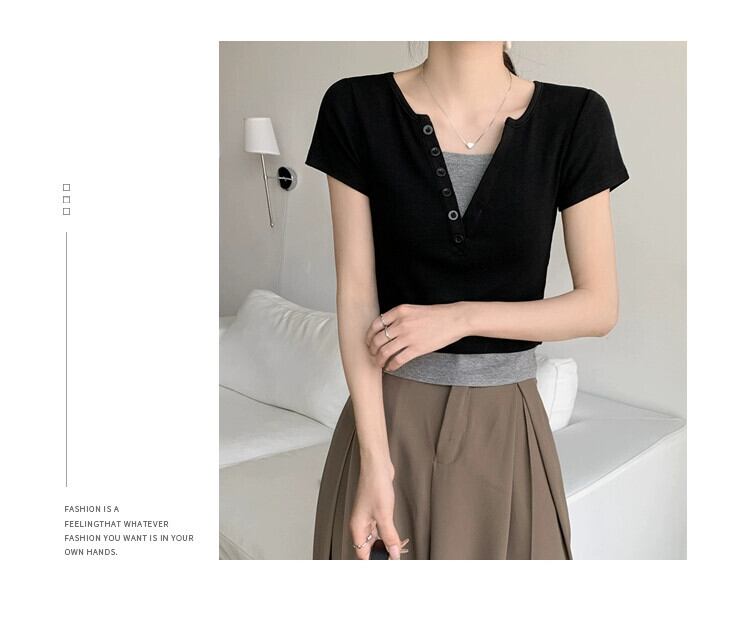 偽ツーピース右肩半袖 T シャツの女性の夏、ハイエンドのデザイン、スリムでファッショナブルな、V ネックのショート トップ サマー 夏物 Vネック Tシャツ 7460058642142266 | framboise21