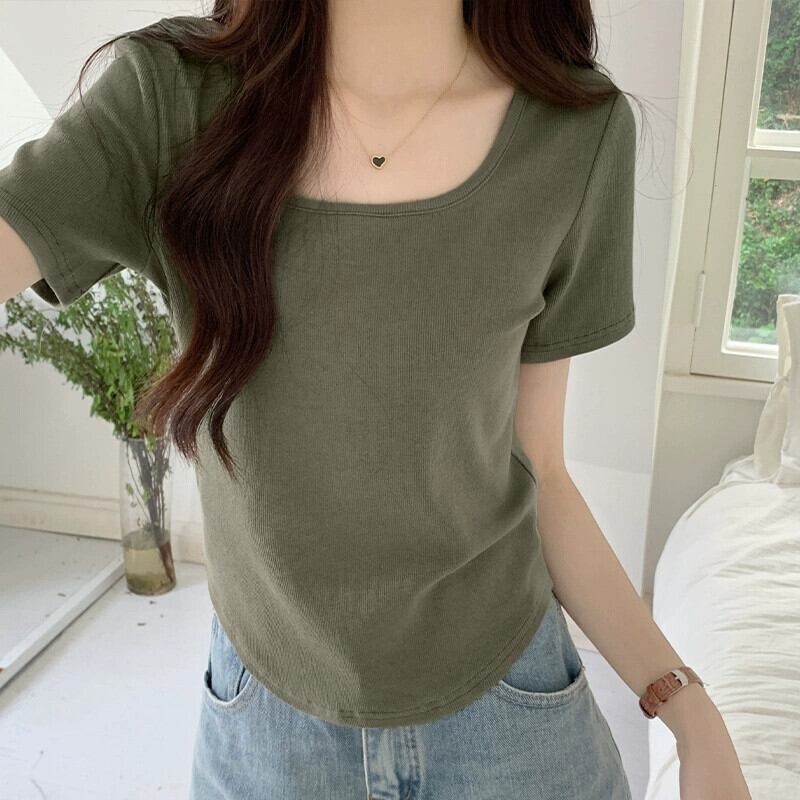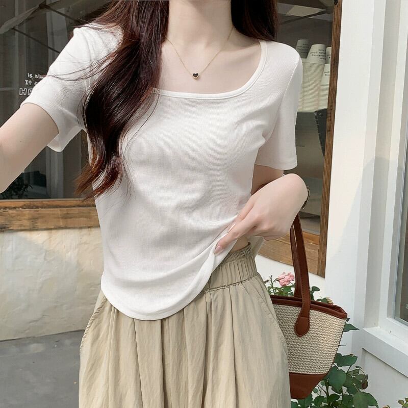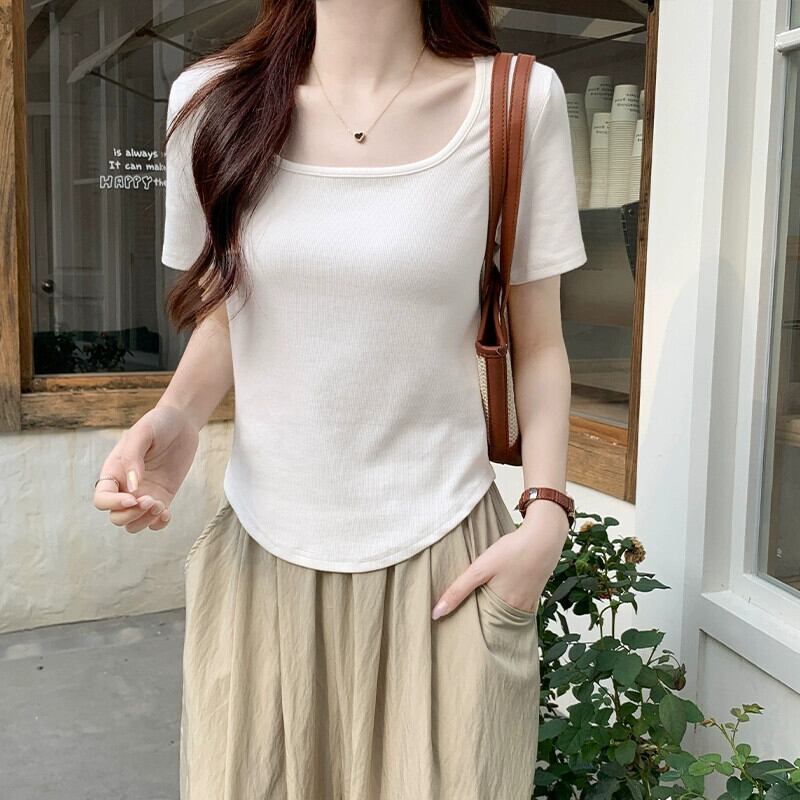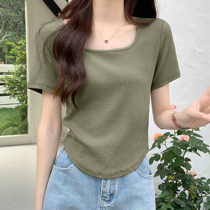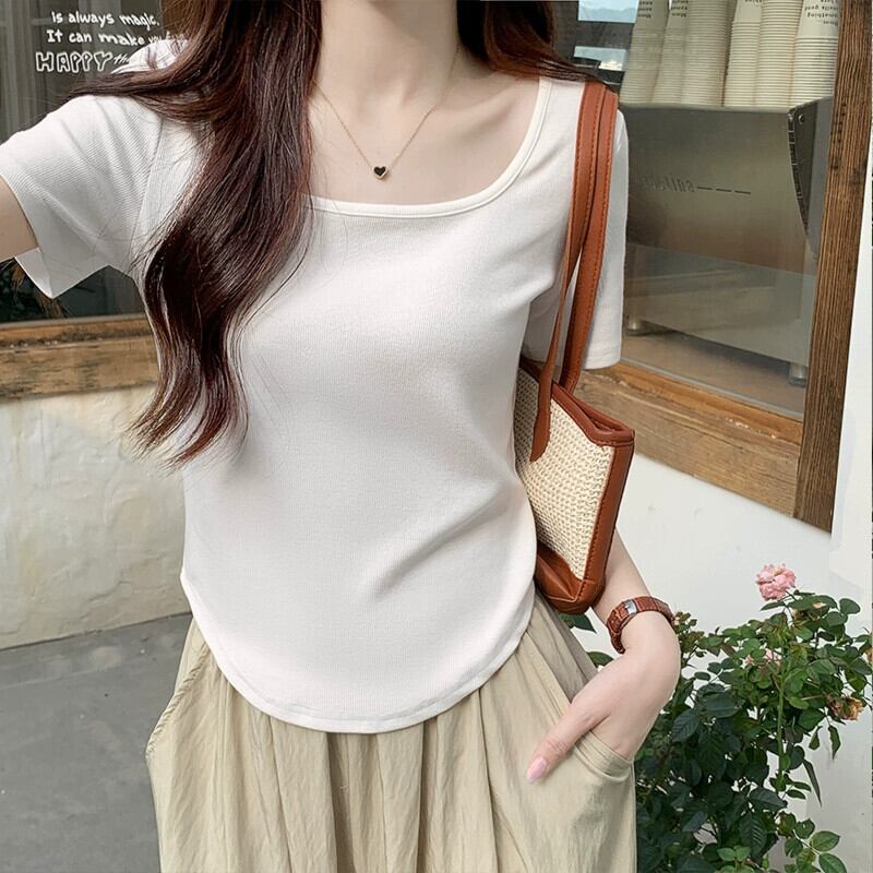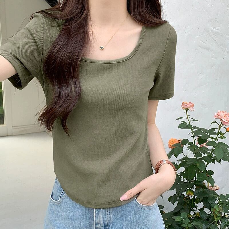 ファッショナブルでスタイリッシュな肩が露出した鎖骨スクエアネックのフィッシュボーントップを備えた夏の不規則な半袖Tシャツの女性 サマー 夏物 スクウェア 7460045089113787 | framboise21