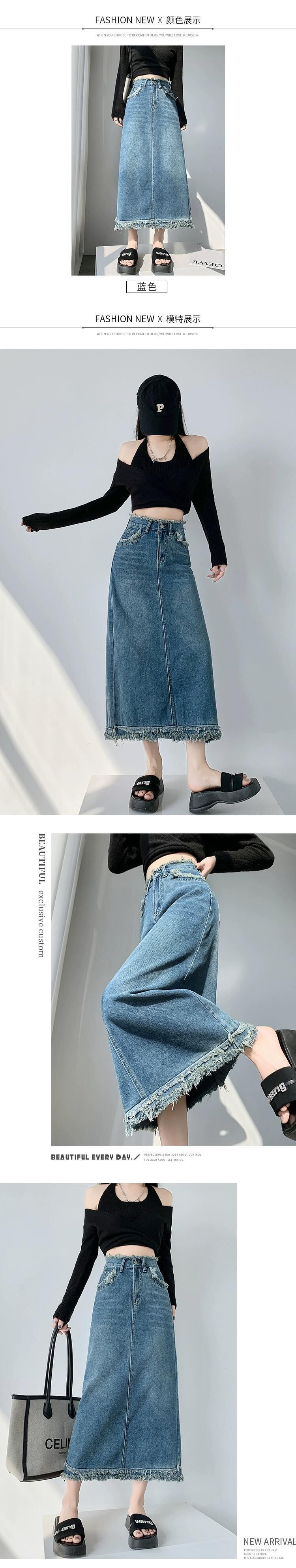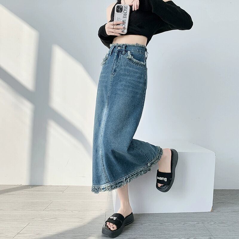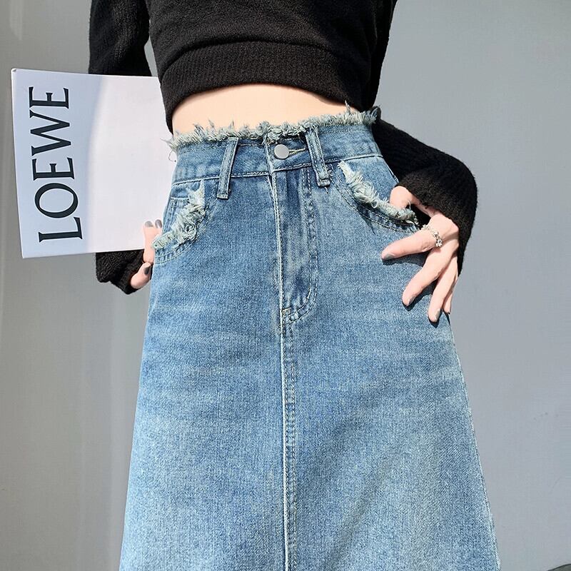 ローエッジハイウエストデニムスカート女性 2024 春と秋の新作レトロ痩身 a ラインミッドレングス電話ヒップハグスカート スプリング 春物 オータム 秋物 Aライン 7460043002798317 | framboise21