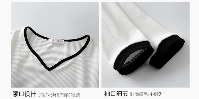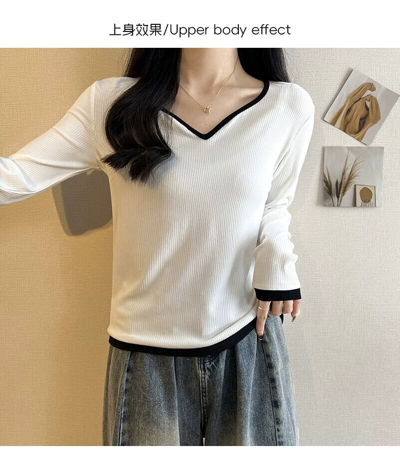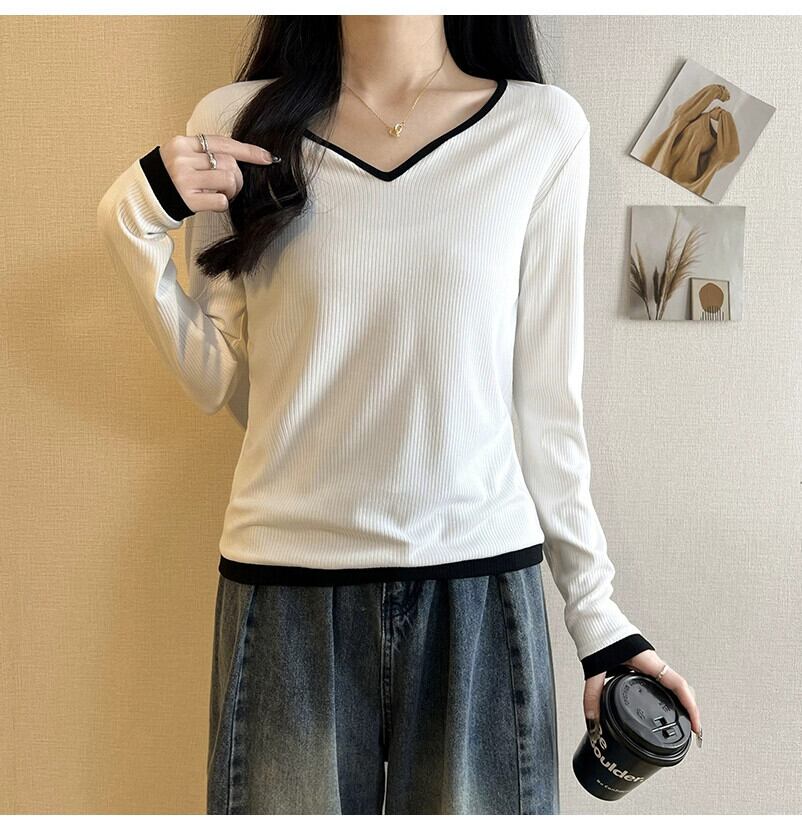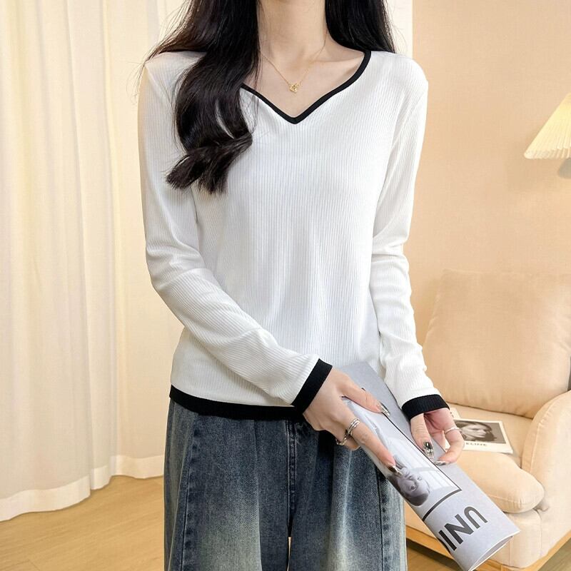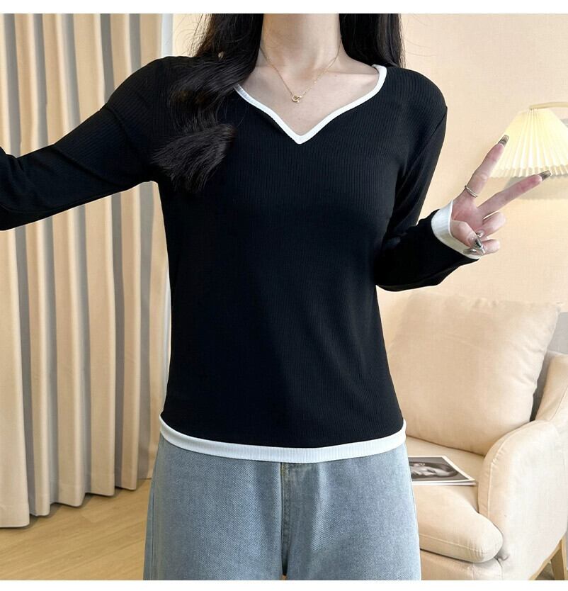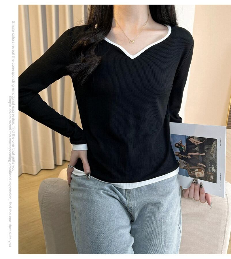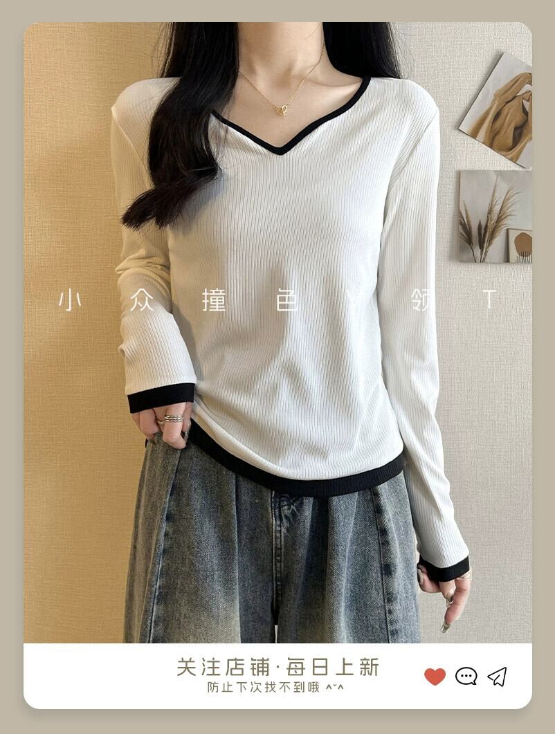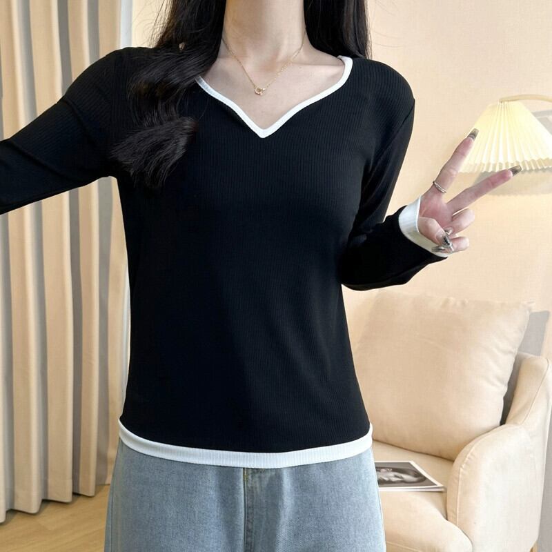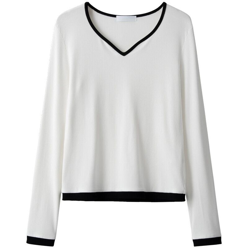 右肩長袖 tシャツ女性 2024 年春の新デザインルーズでスリムなインナーカラーマッチング v ネックボトムトップ黒 ロング ブラック スプリング 春物 Vネック 7460048231189009 | framboise21
