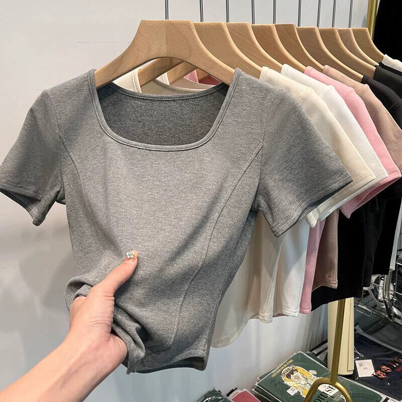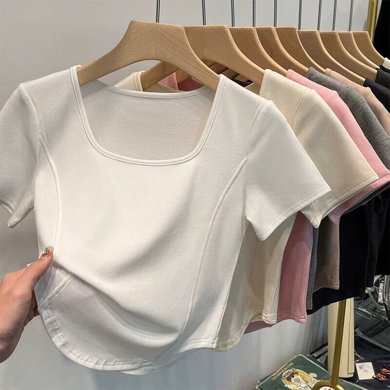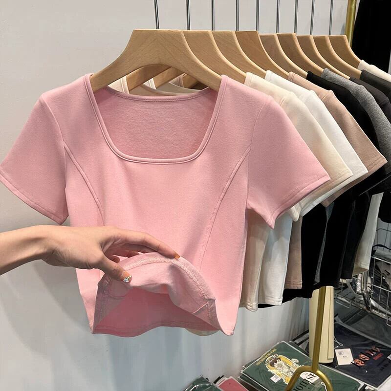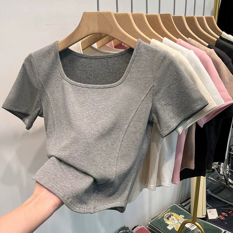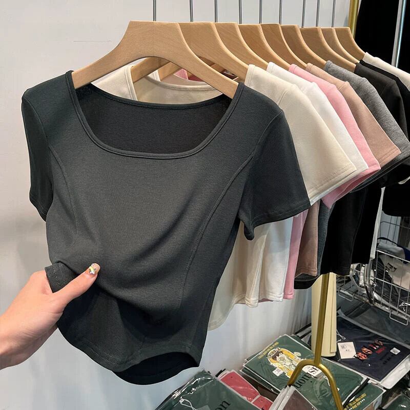 不規則な湾曲した半袖 Tシャツの女性の夏のフランスのファッション気質アインスタイルスリムフィッシュボーンショートスクエアネックトップ サマー 夏物 スクウェア 746005992470854 | framboise21